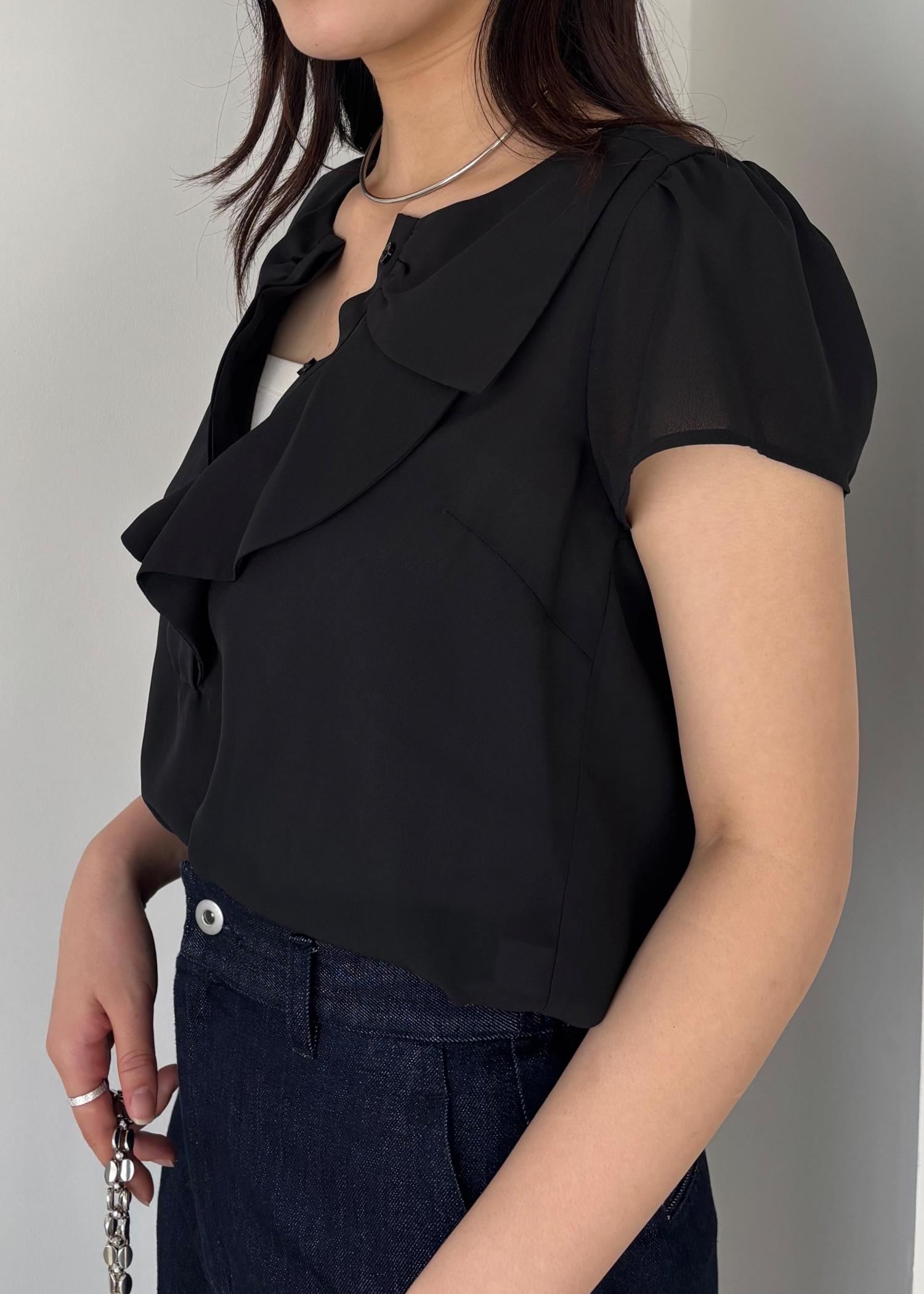 開けても(リボンモチーフ)閉じても(フリル)映える襟デザイン。