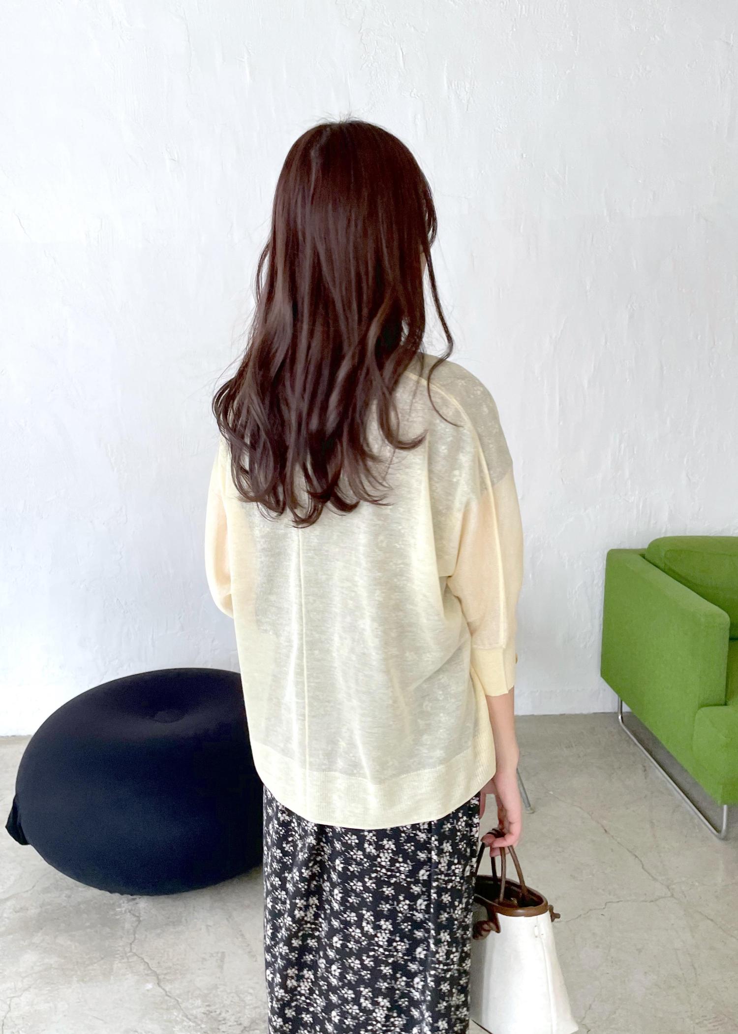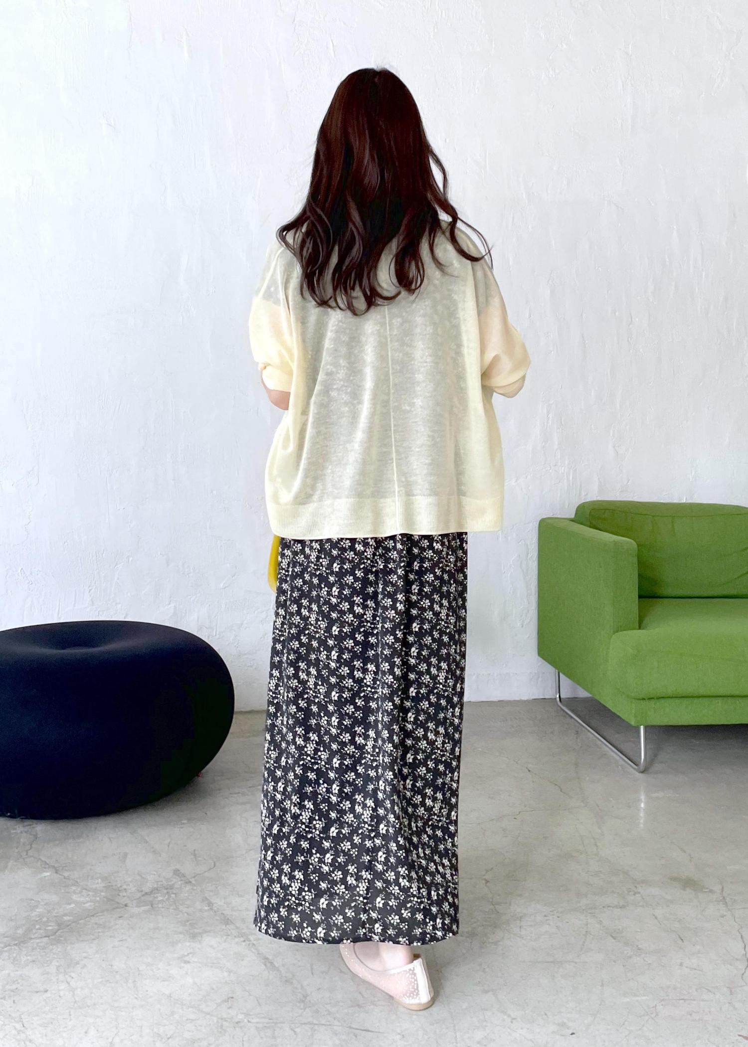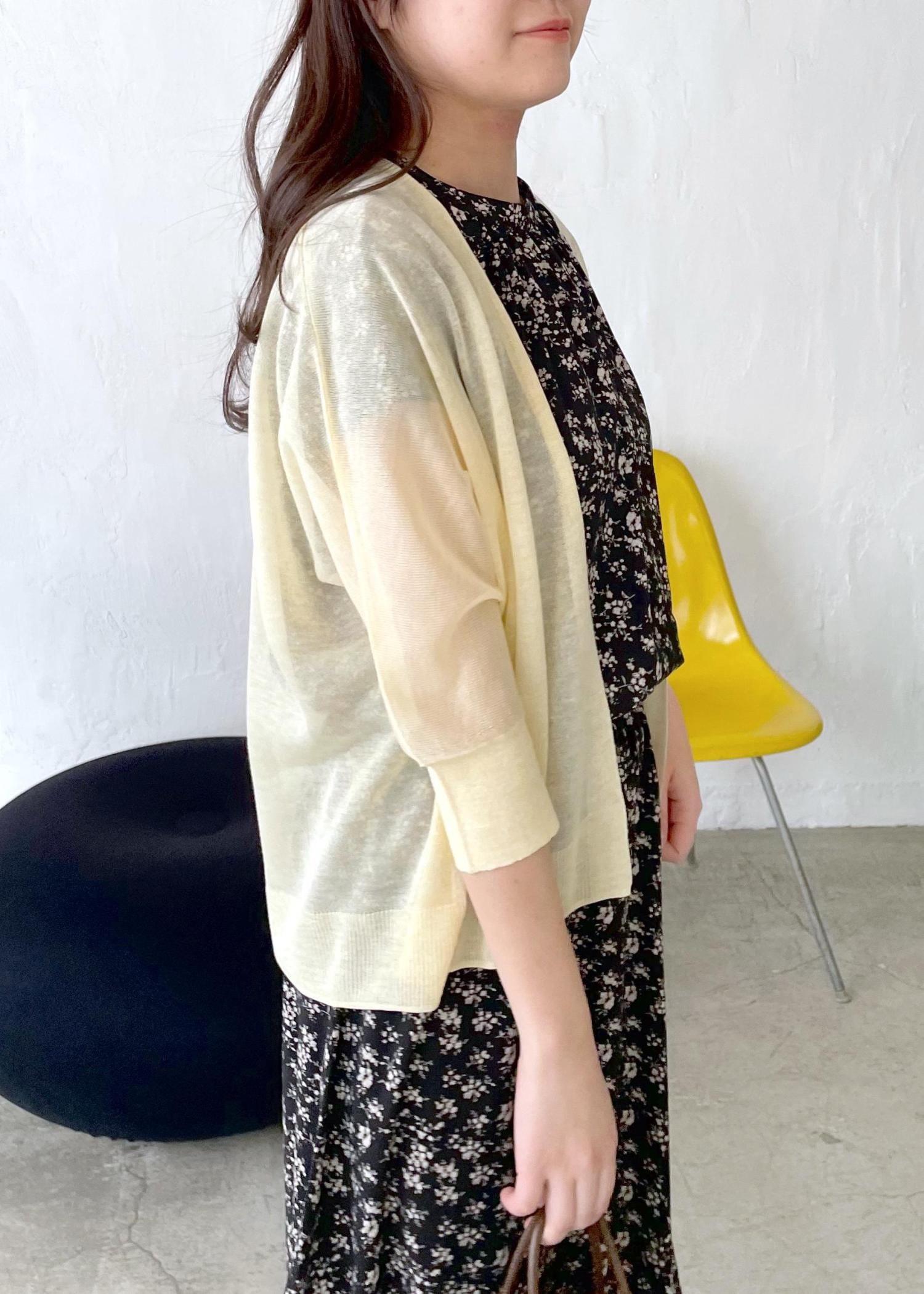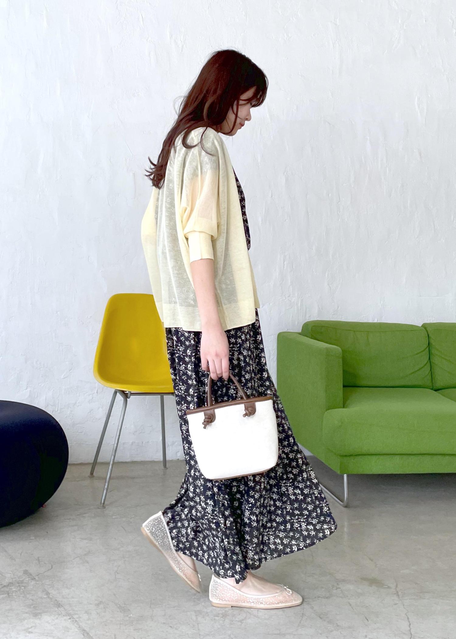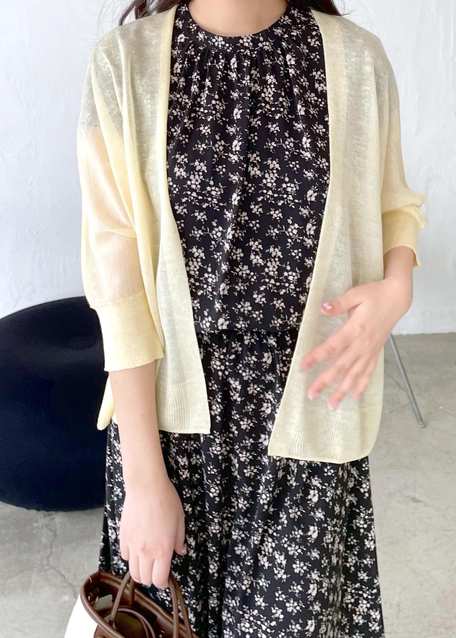 イエローのシアーカーディガンからワンピースの小花柄が透けて見える、涼しげなコーディネートです。