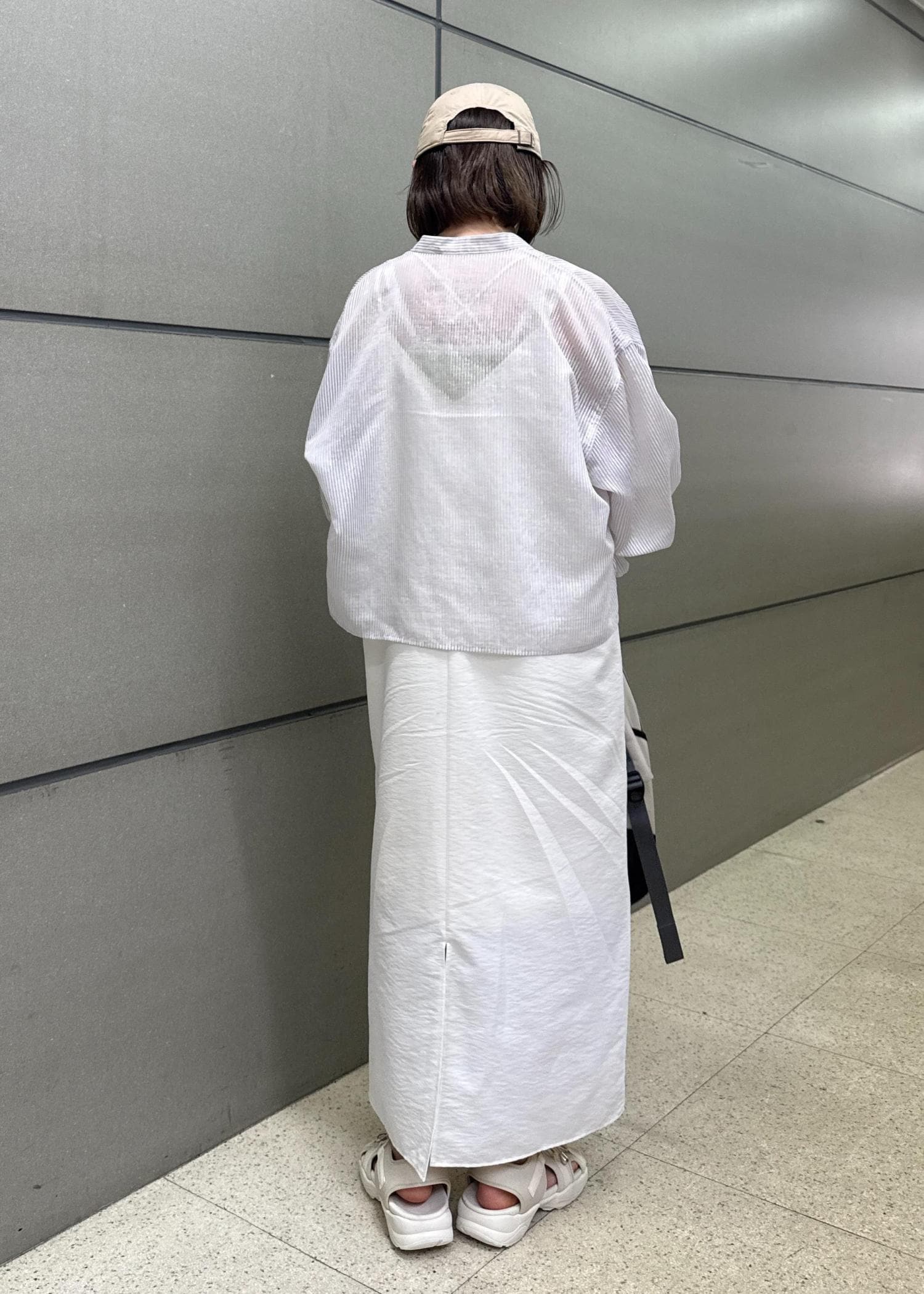 腰くらいの着丈で、アウトスタイルでもバランスよく着られます。