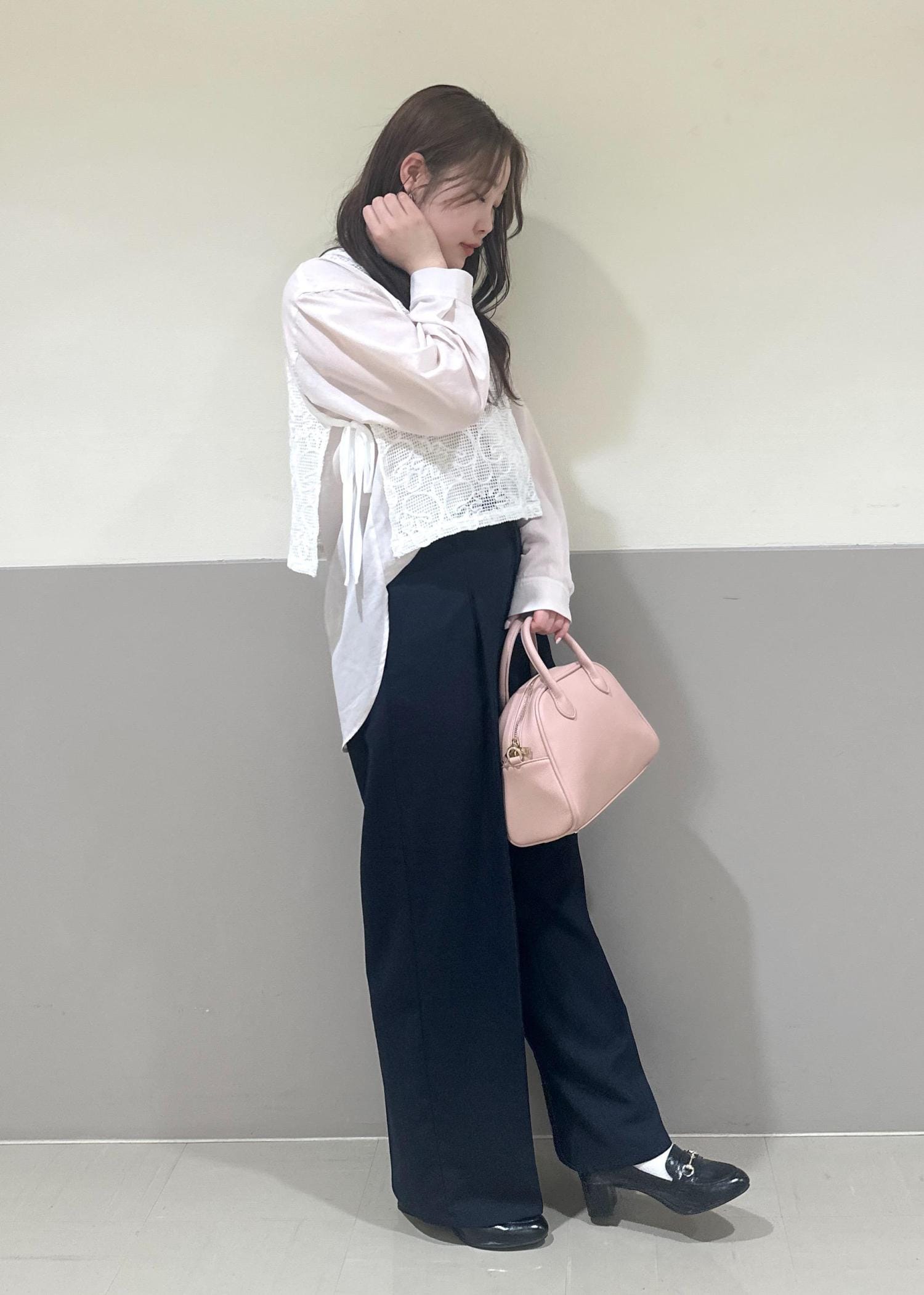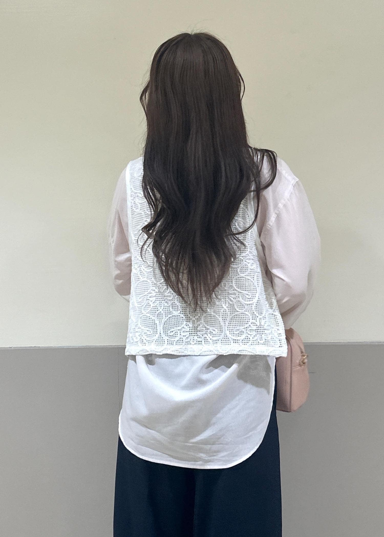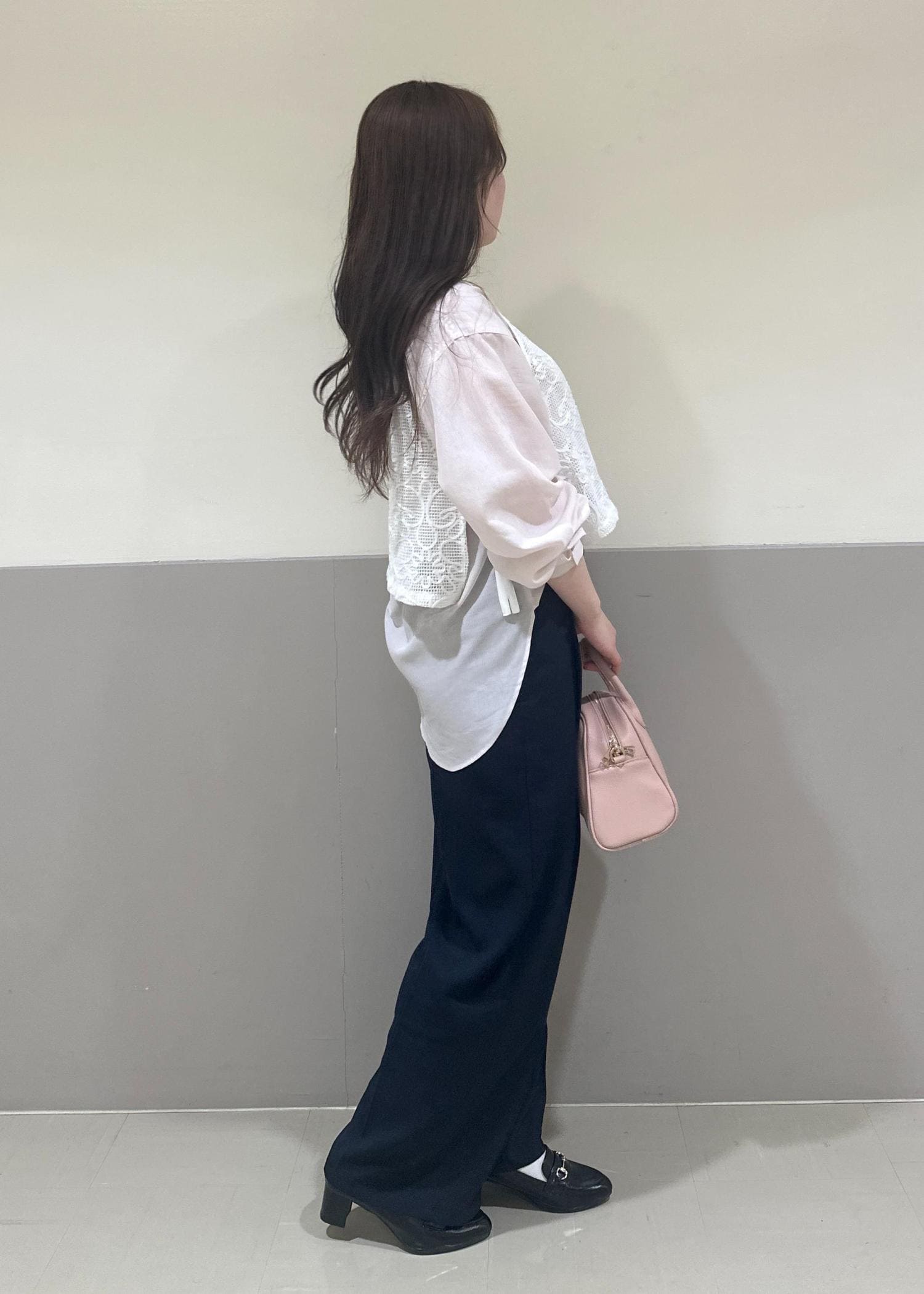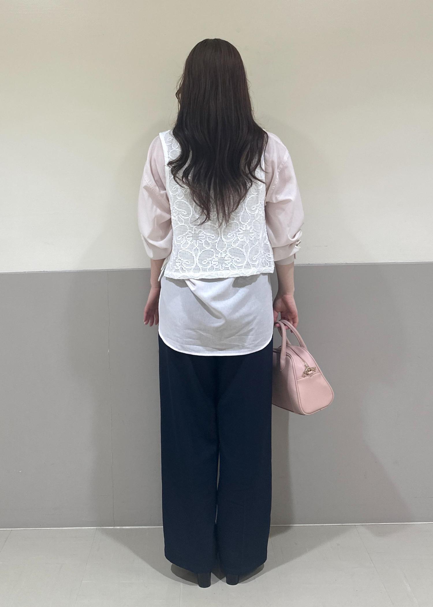 今回はブラウスと合わせましたが、Tシャツやシアーシャツとも合うので着回しが沢山できます。サイドの紐でベストのサイズも調節可能です。