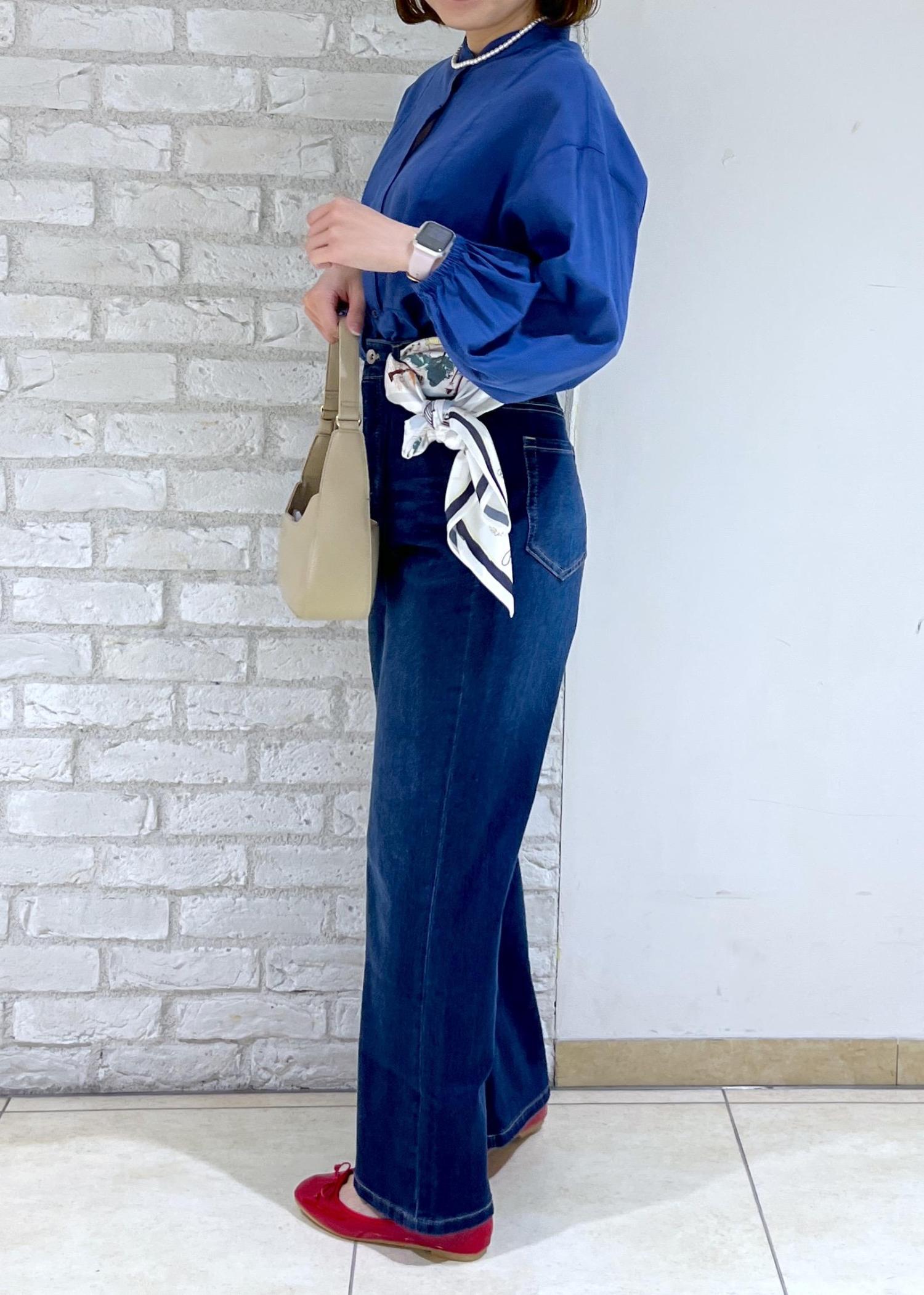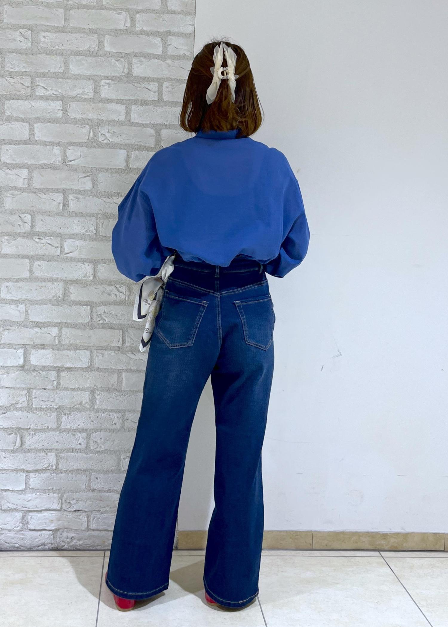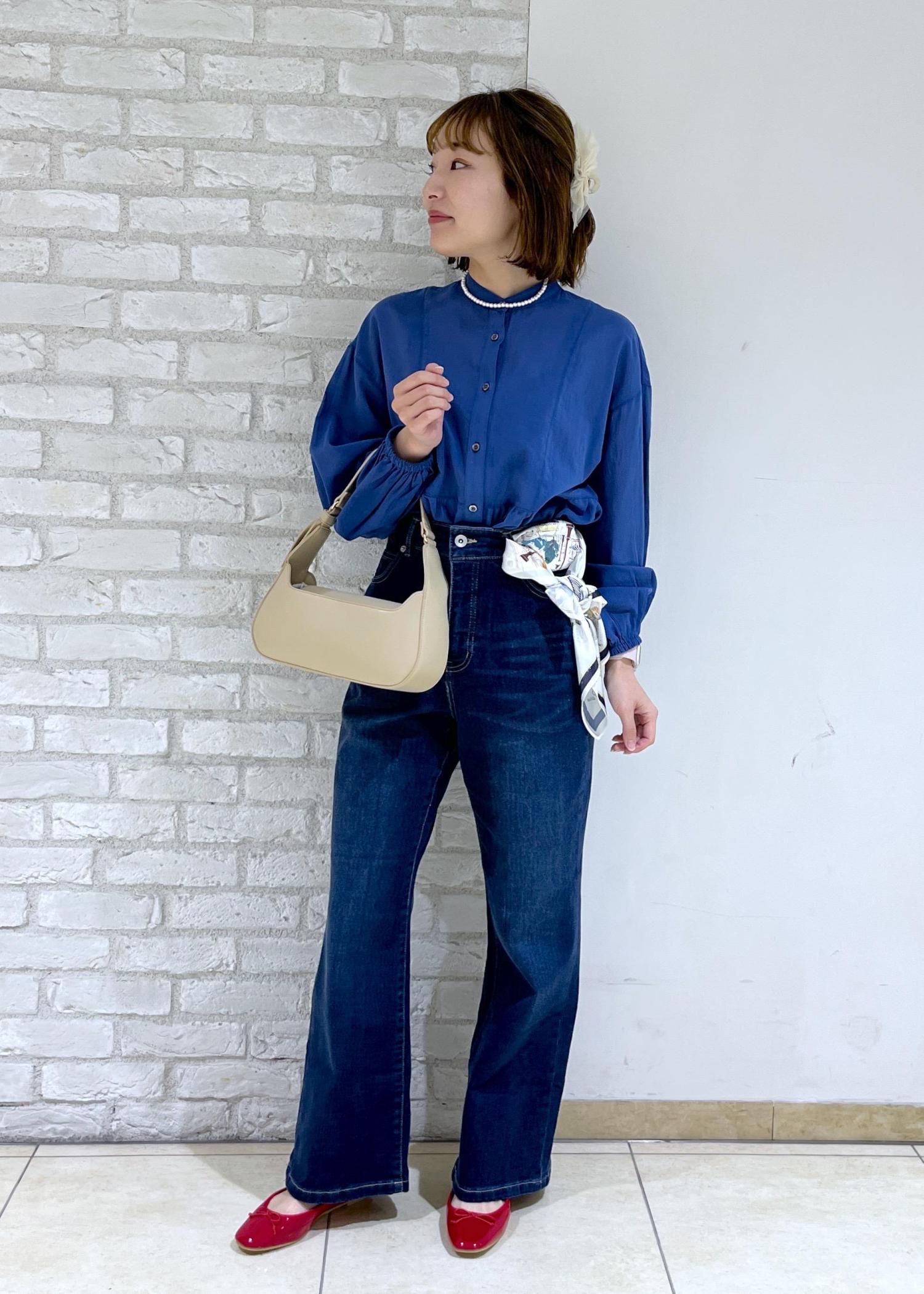 鮮やかなブルーのシャツにデニムで合わせたシンプルコーデ♪