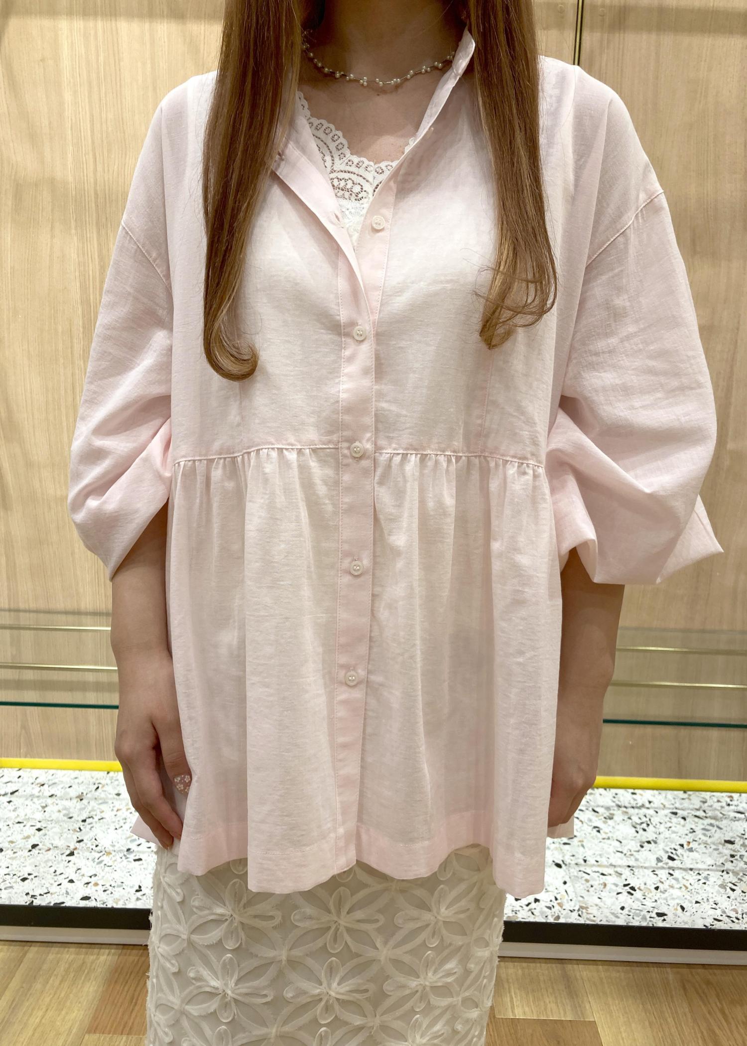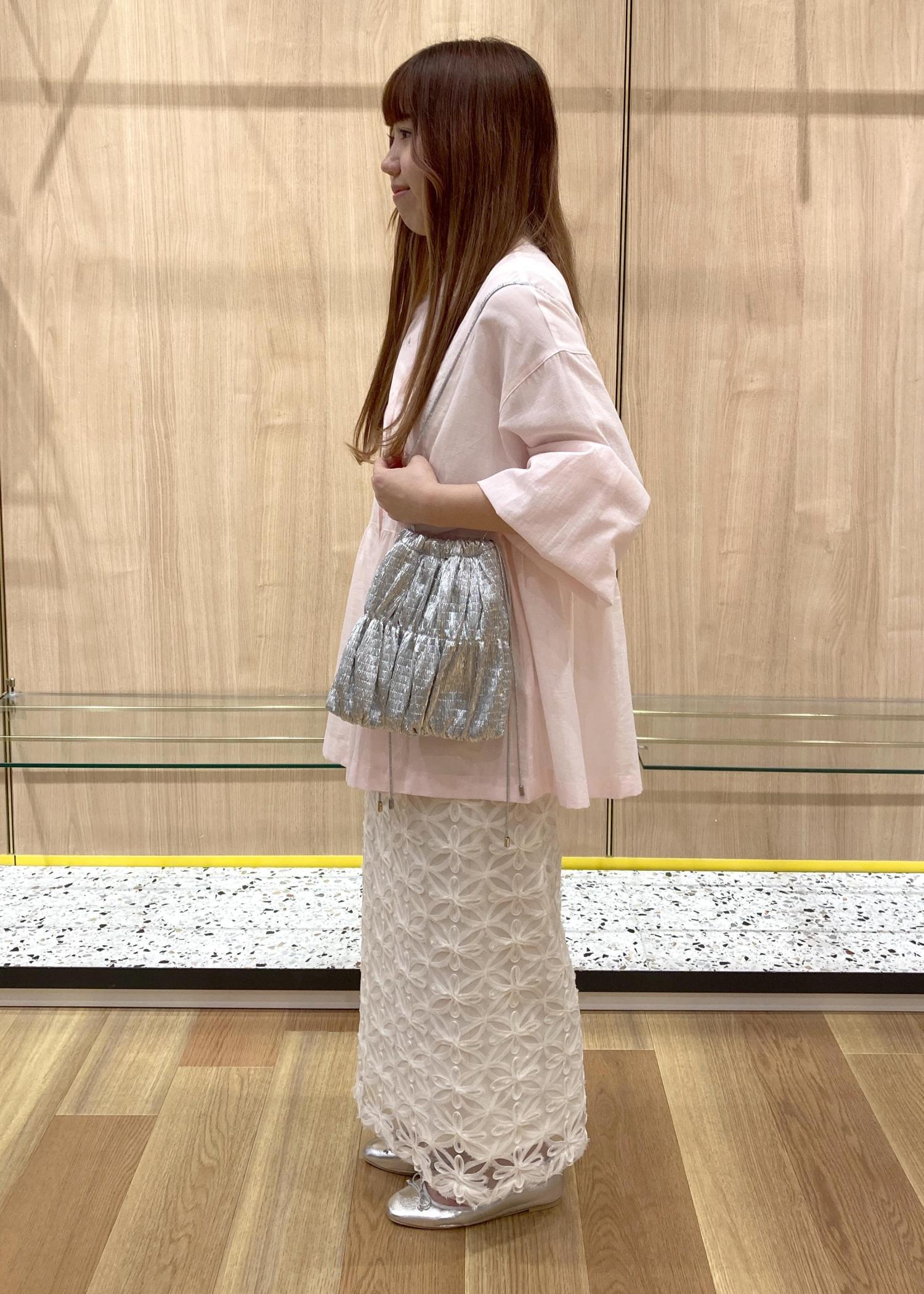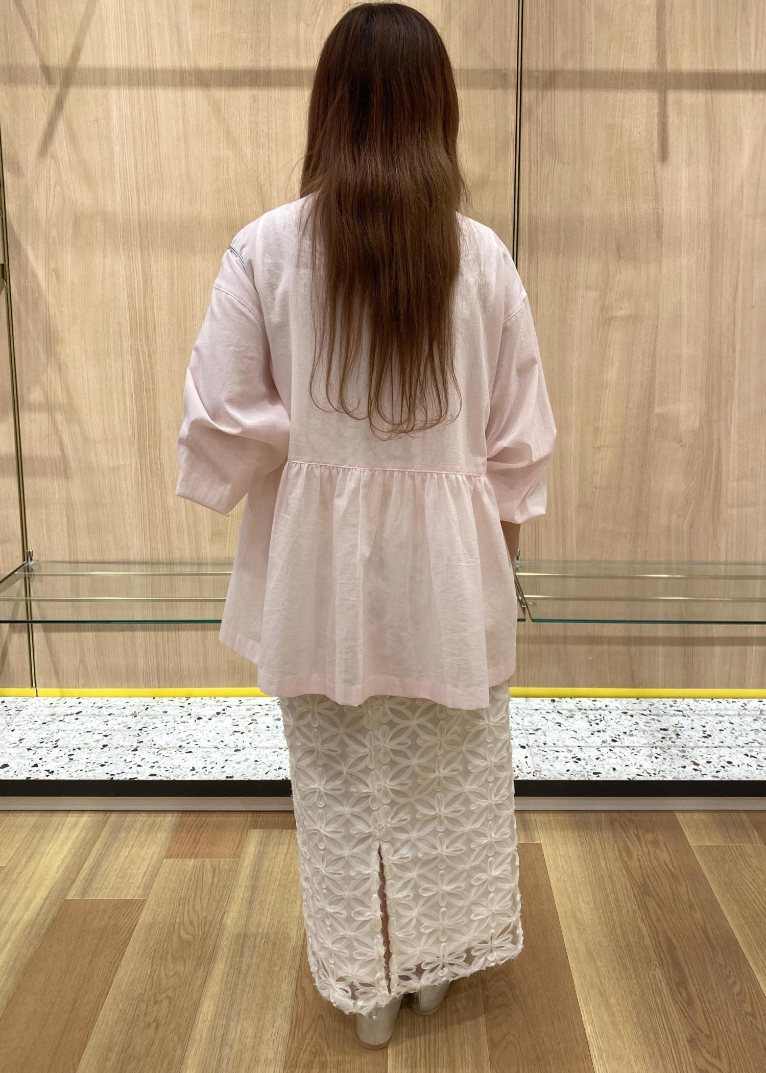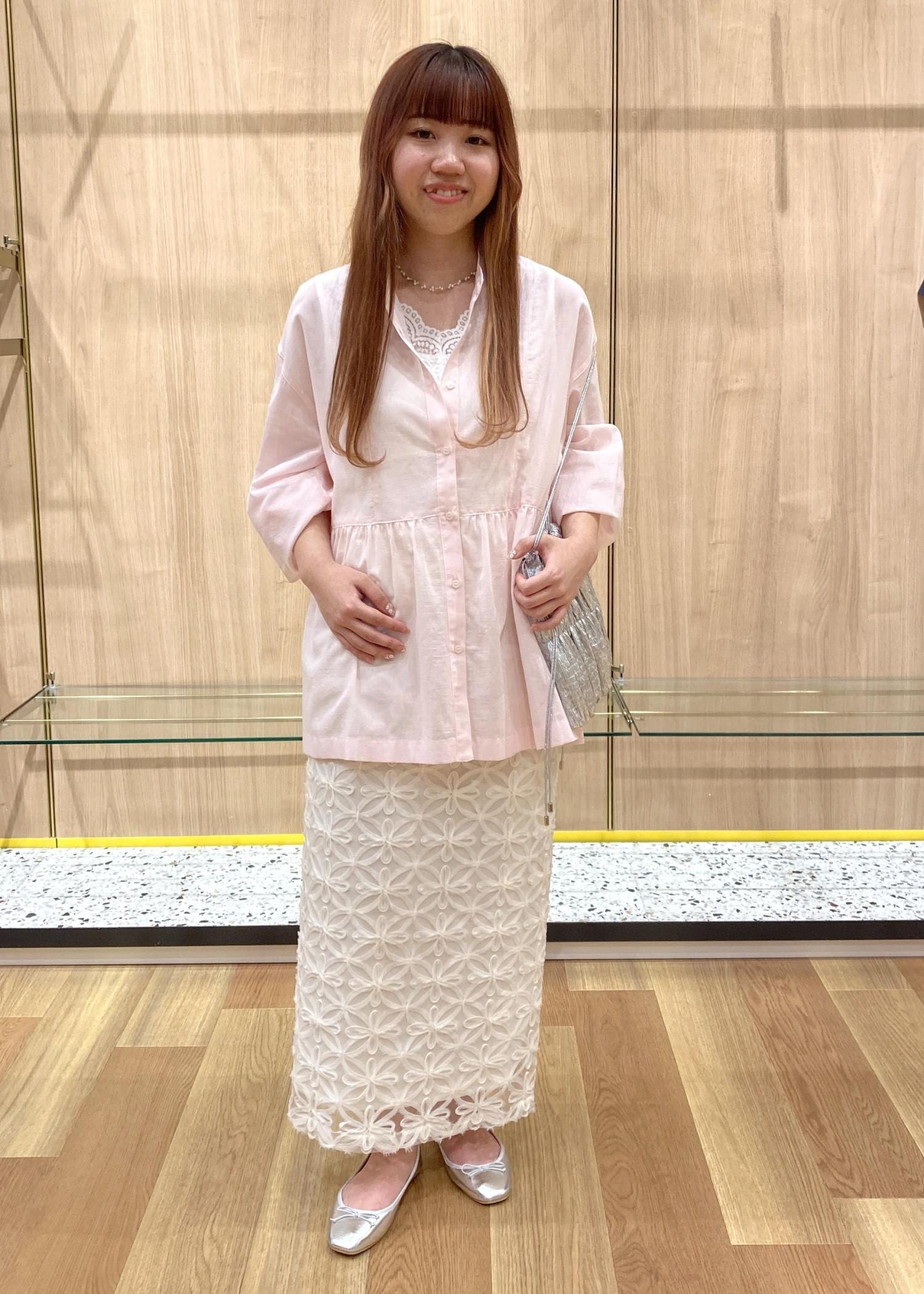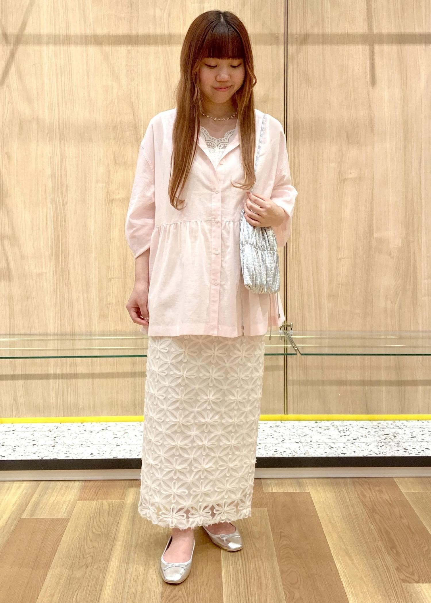 ピンクのペプラムシャツは透け感があるのでインナーはレースを少し見せて可愛らしくし、ペプラムのデザインが映えるようにスカートはタイトめにしました。