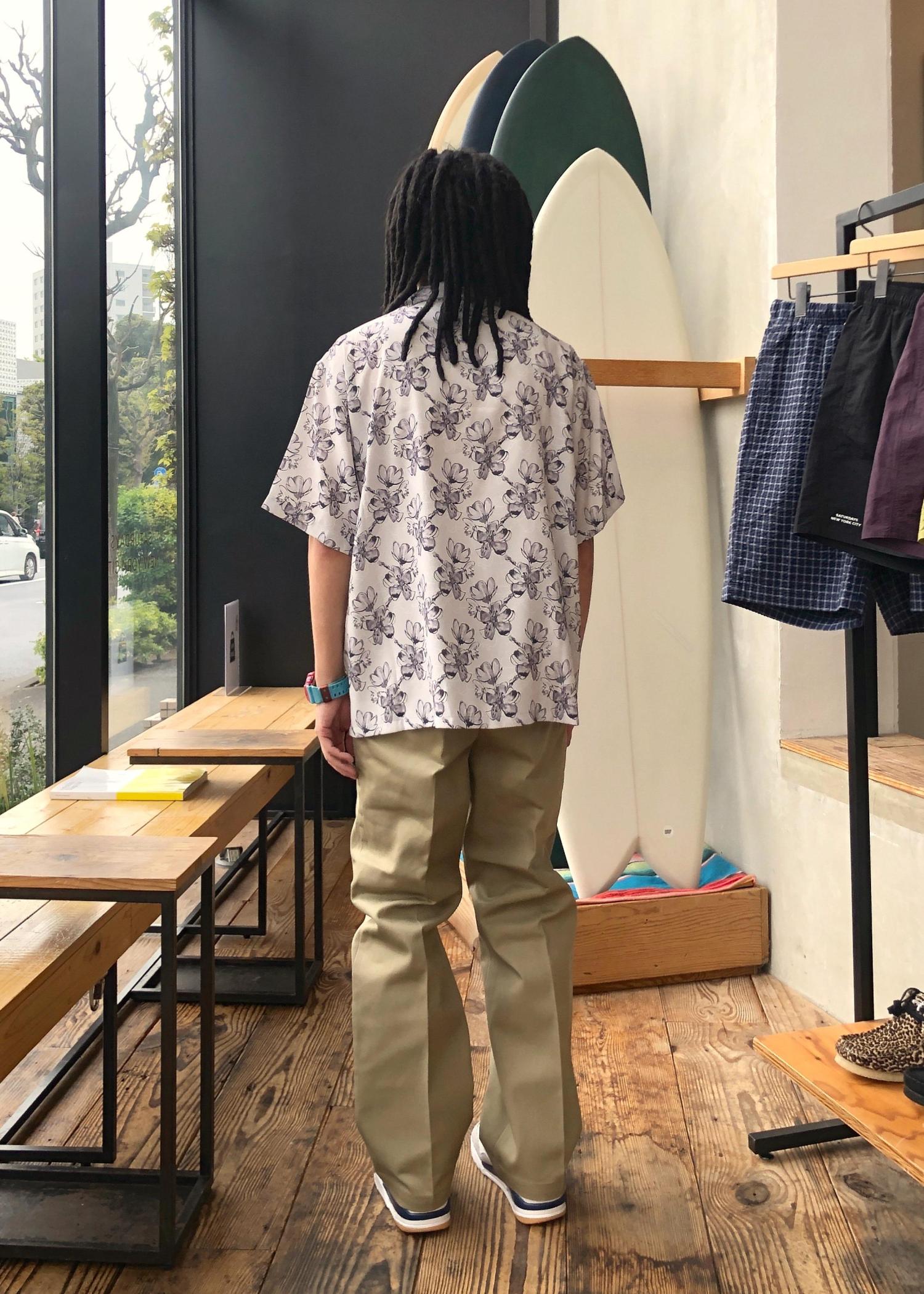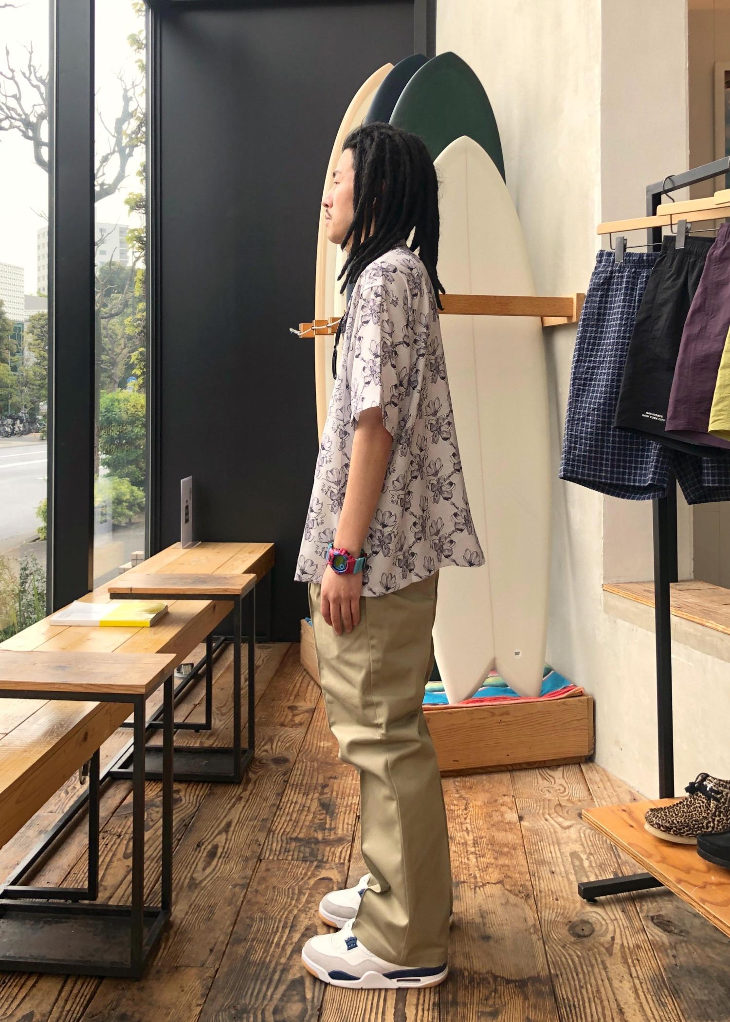 白ベースの柄物シャツにカスタムしたディッキーズでコーディネート。