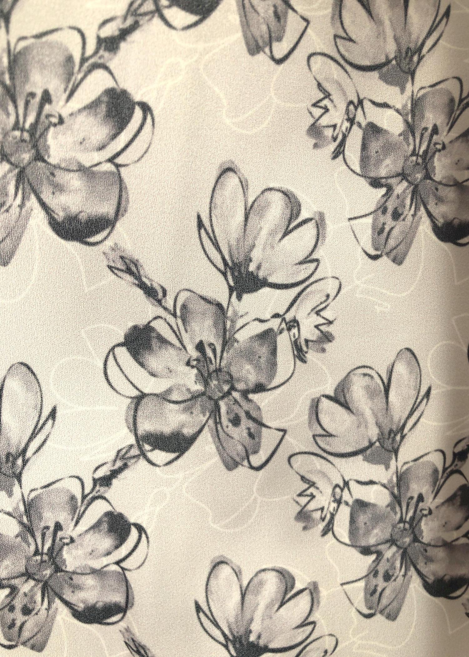 フローラル総柄プリントのシャツはポリエステル素材でテロテロ感があり、乾きやすくシワになりにくいです。