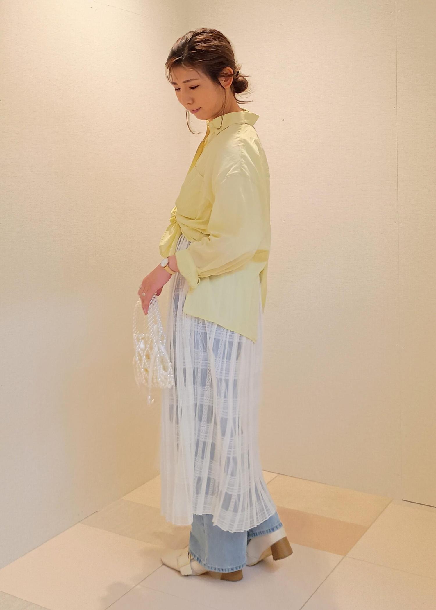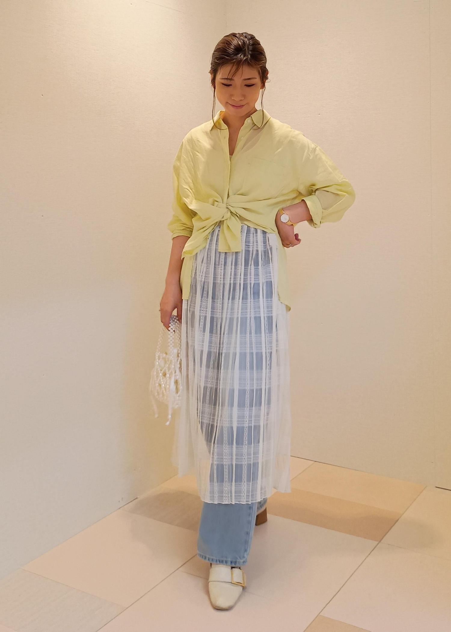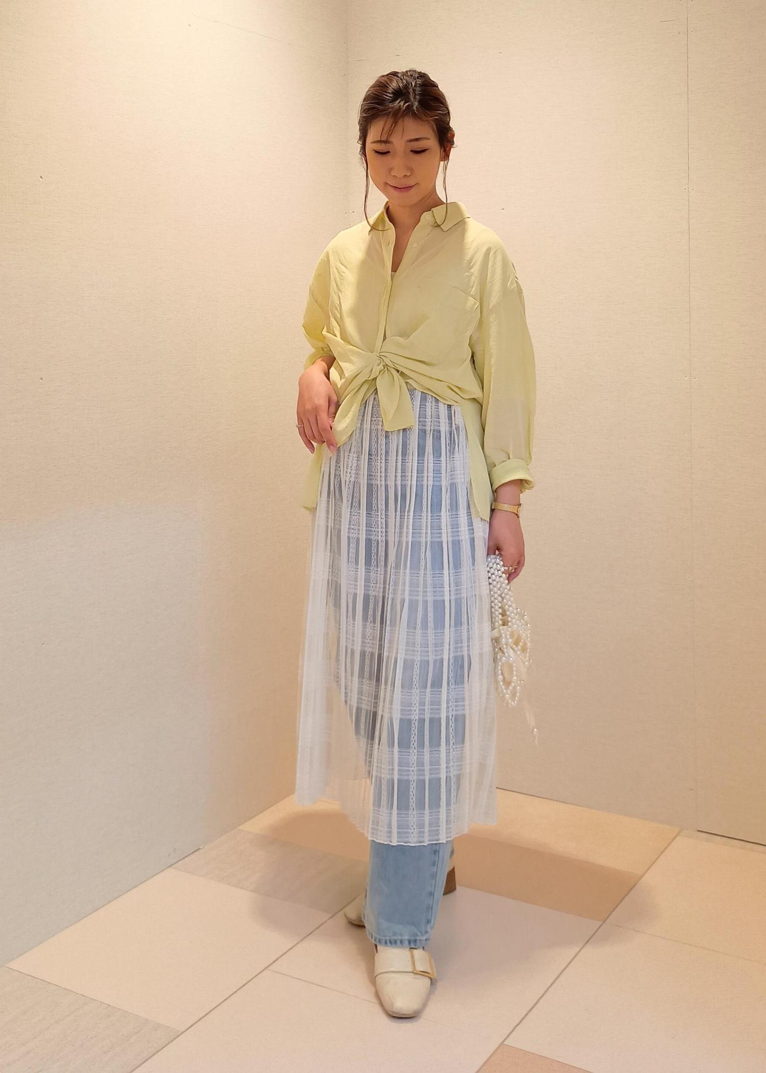 フロントをカシュクールのように魅せるスタイリンクをしてこなれ感を演出してみました!脚長効果もバツグンです!軽やかな素材感が、春の爽やかとエレガントさのエッセンスを加えてくれる大人かわいいシャツスタイルです。
