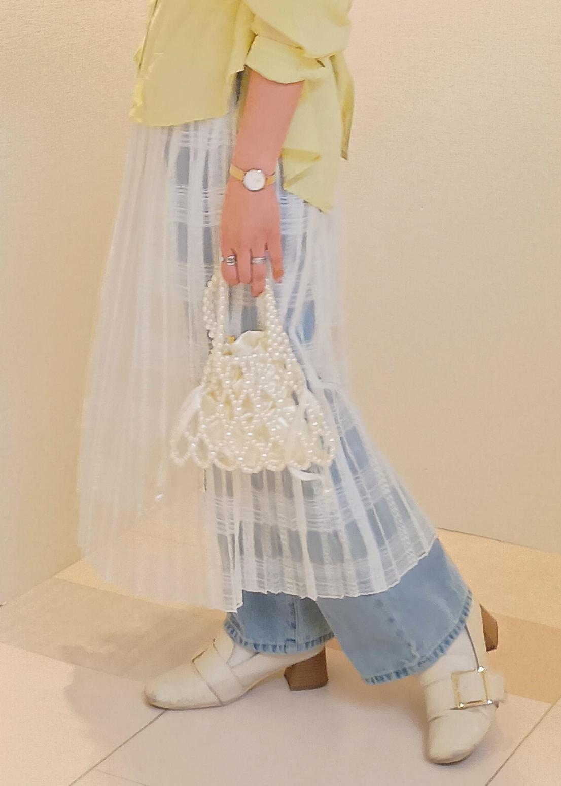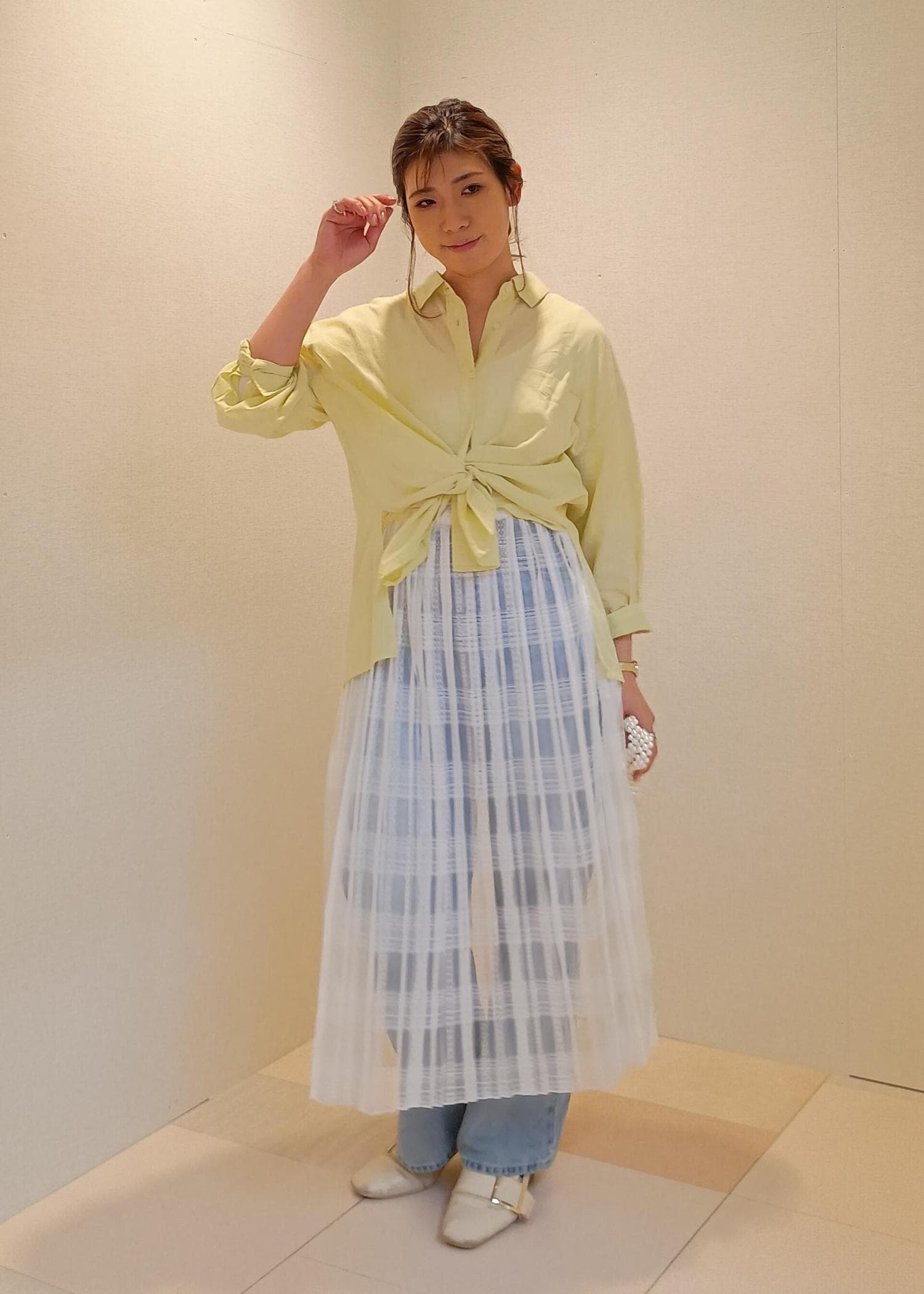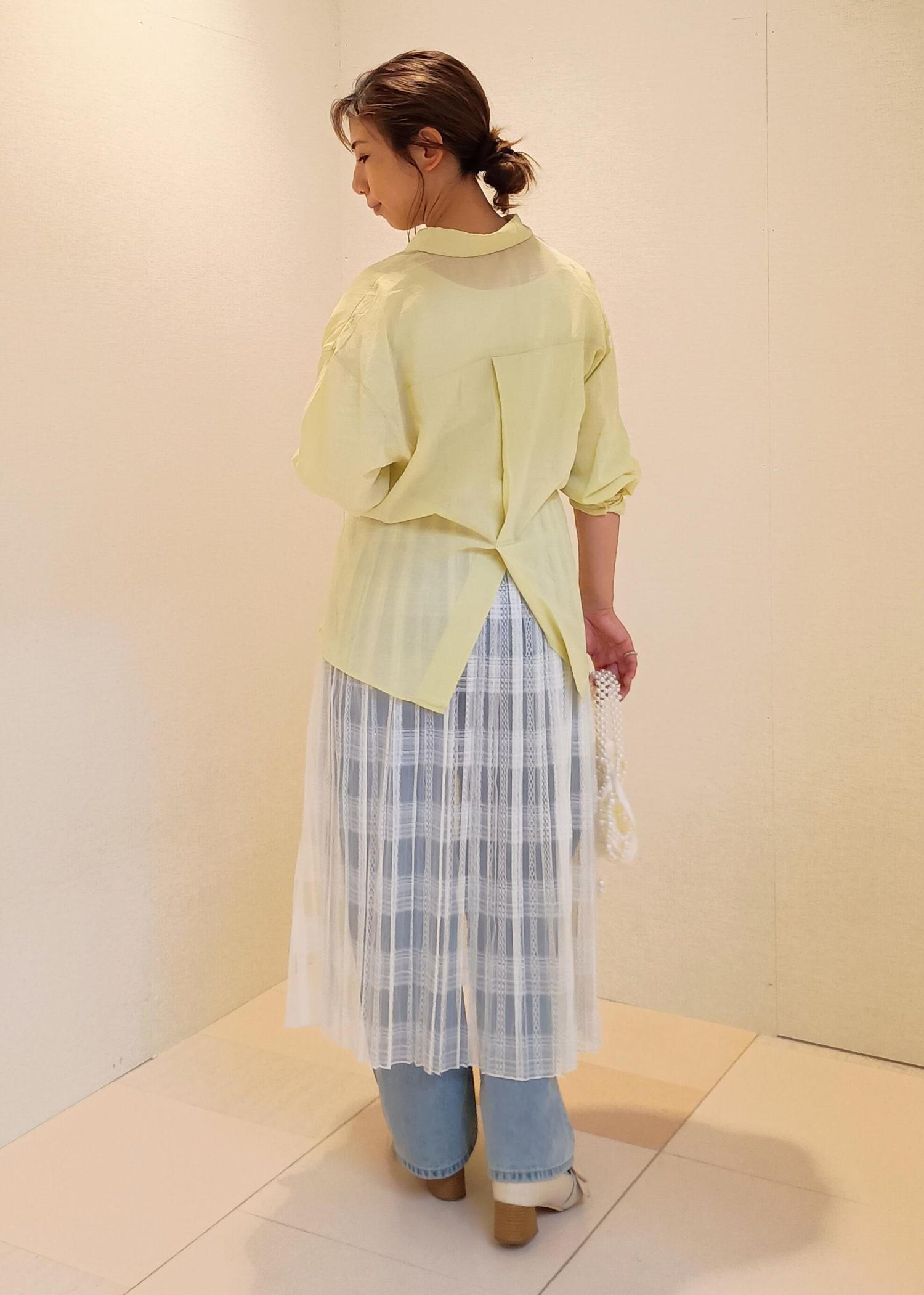 フロントをカシュクールのように魅せるスタイリンクをしてこなれ感を演出してみました!脚長効果もバツグンです!軽やかな素材感が、春の爽やかとエレガントさのエッセンスを加えてくれる大人かわいいシャツスタイルです。