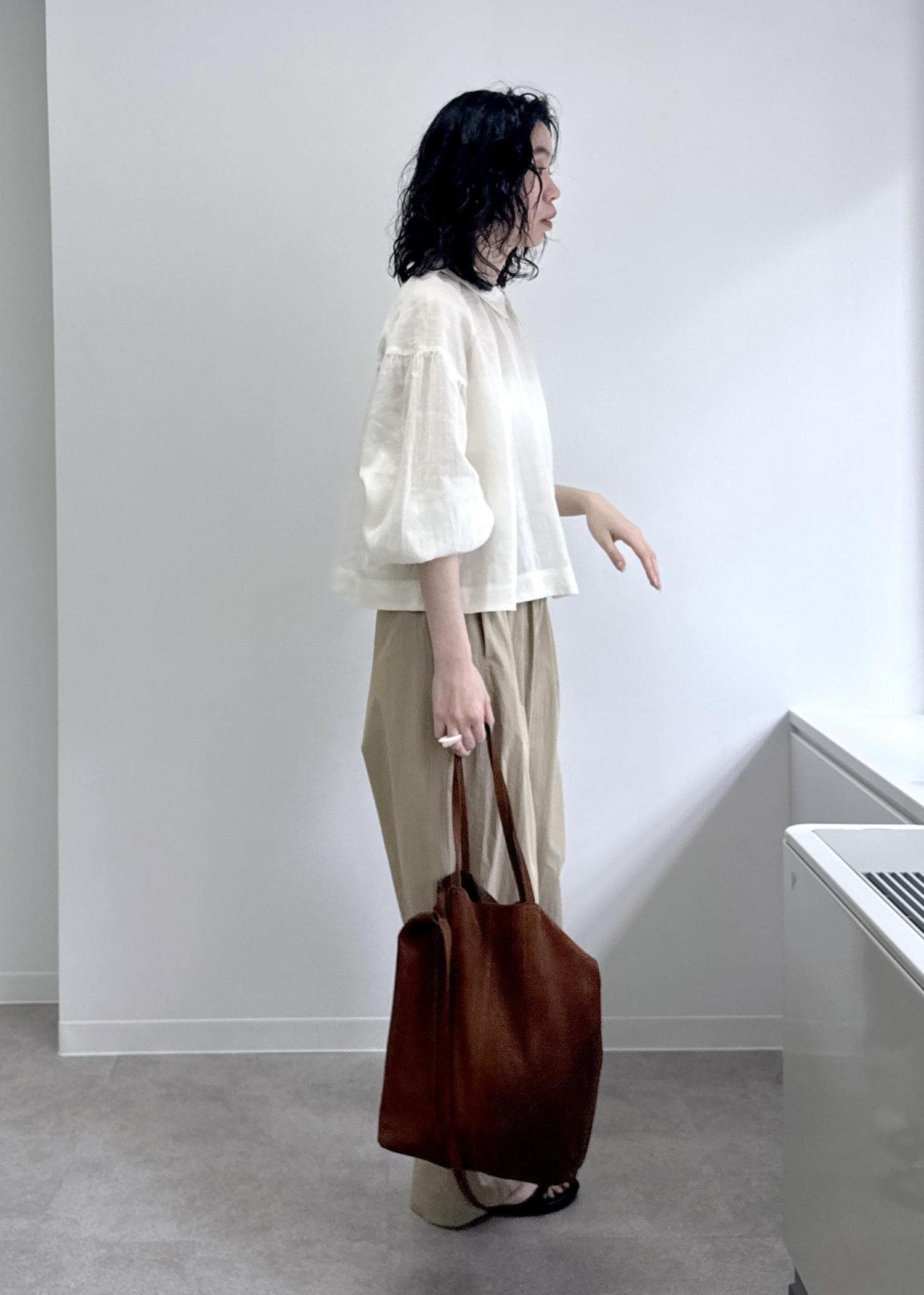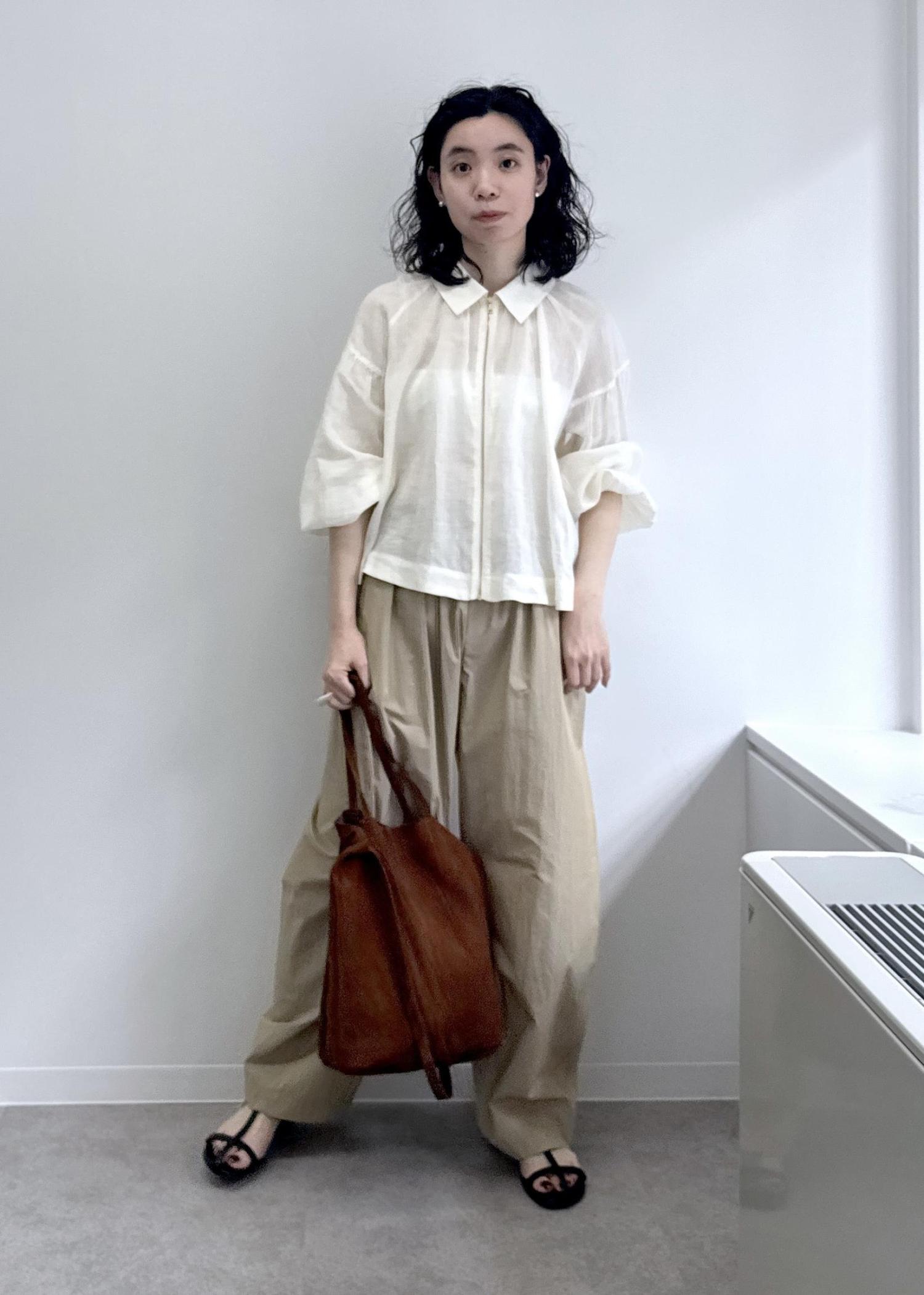 全体のボリュームに対して腰回りをすっきりさせたメリハリのあるシルエットなので、コントラストでウエストが細く見えます。