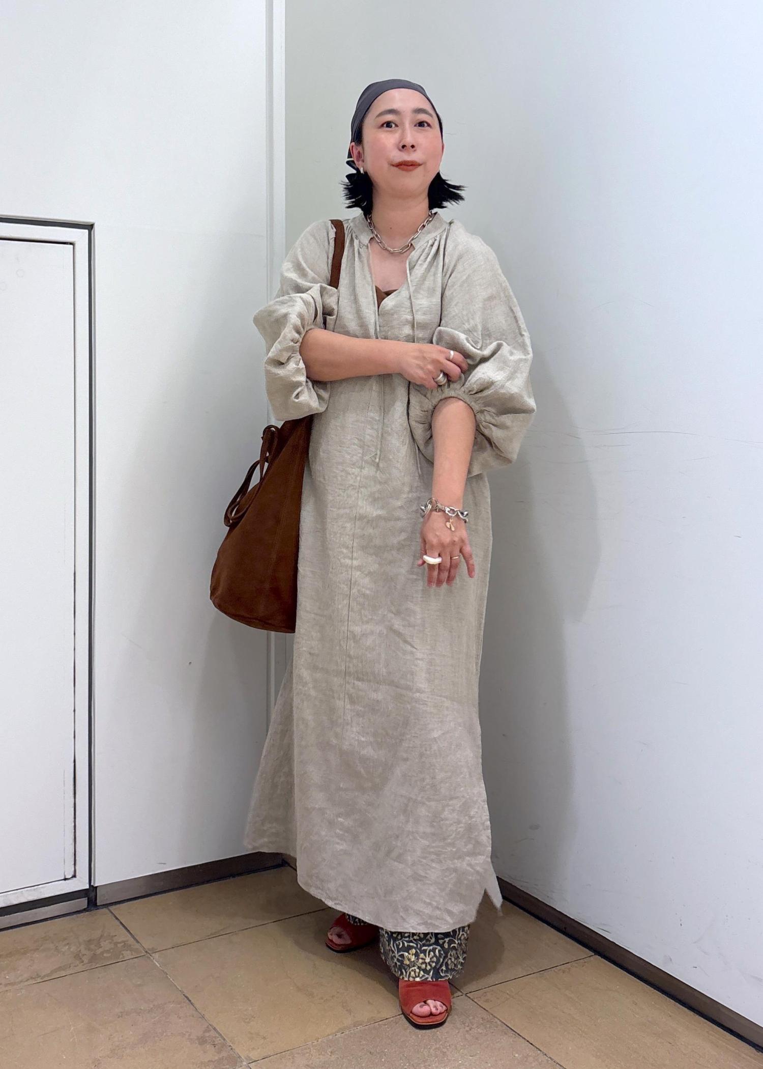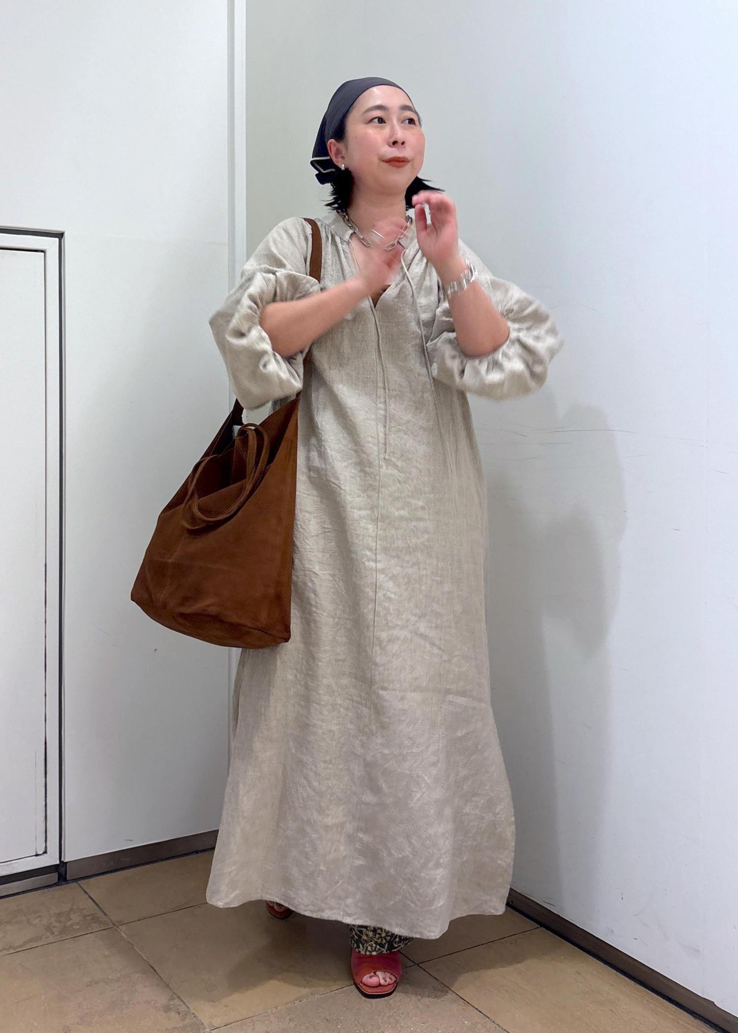 大好きなリネンワンピ。低身長なのでナチュラルな雰囲気になりがちなので、スカーフとヒールできゅっと引き締めて合わせてみました。