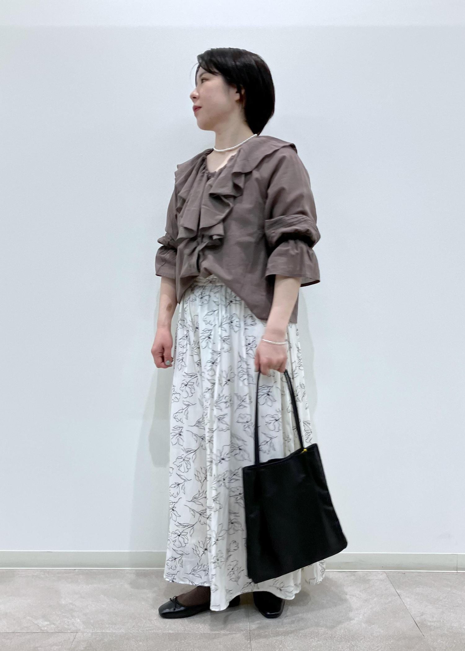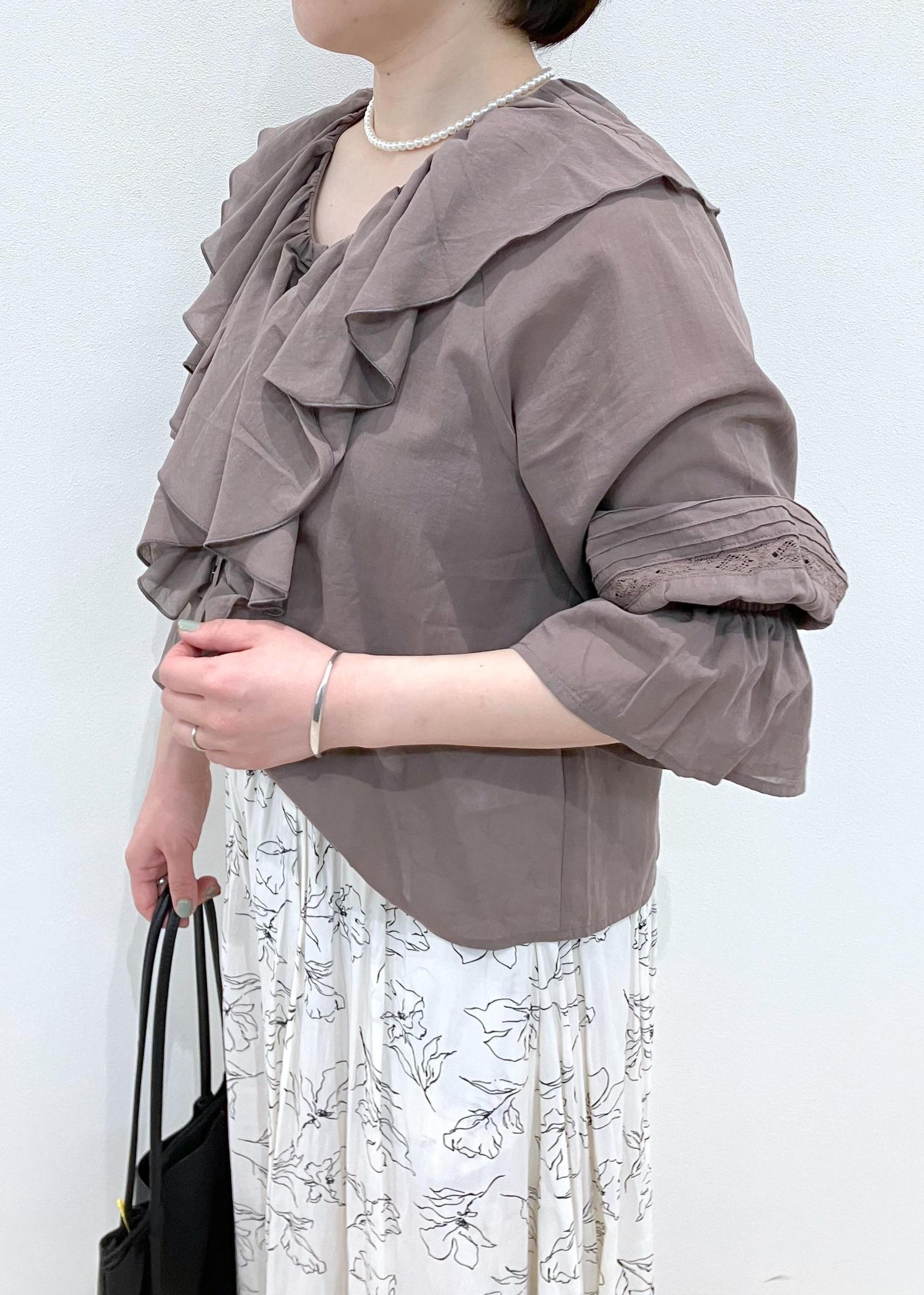 フリルブラウスですが、ブラウンは甘すぎずに着れます。