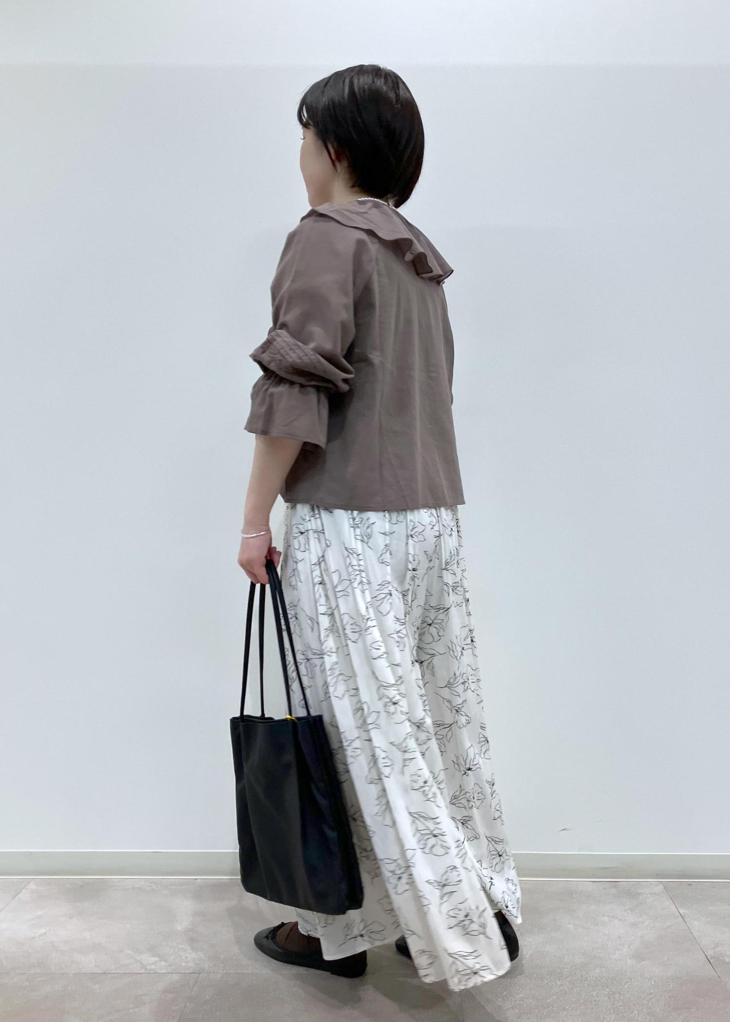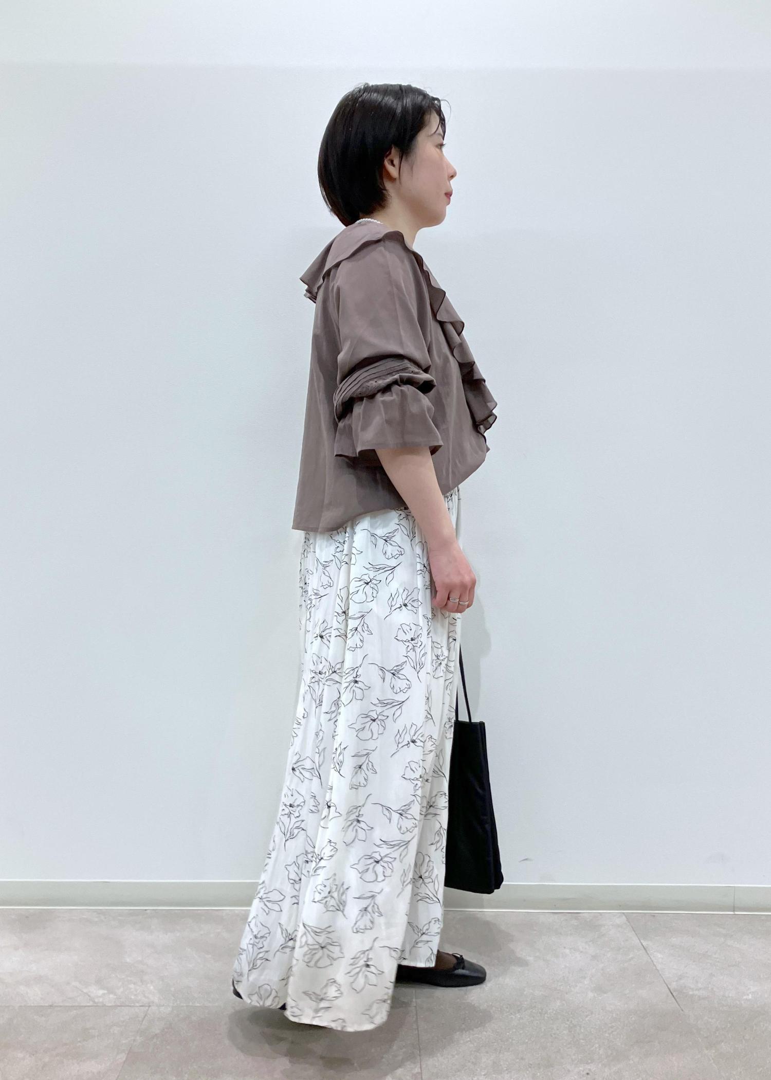 フリルブラウスはブラウンだと甘すぎずに着れるので、