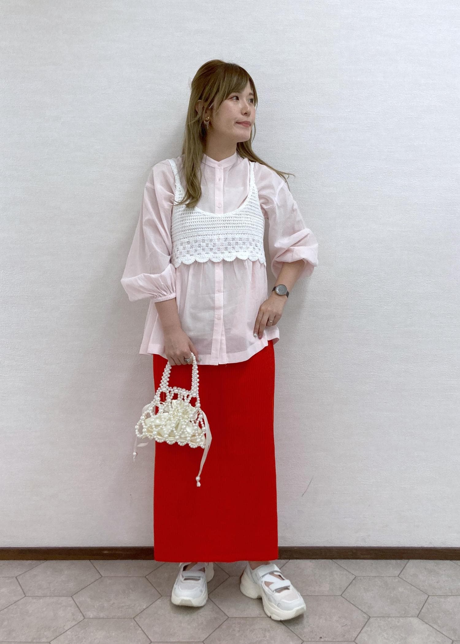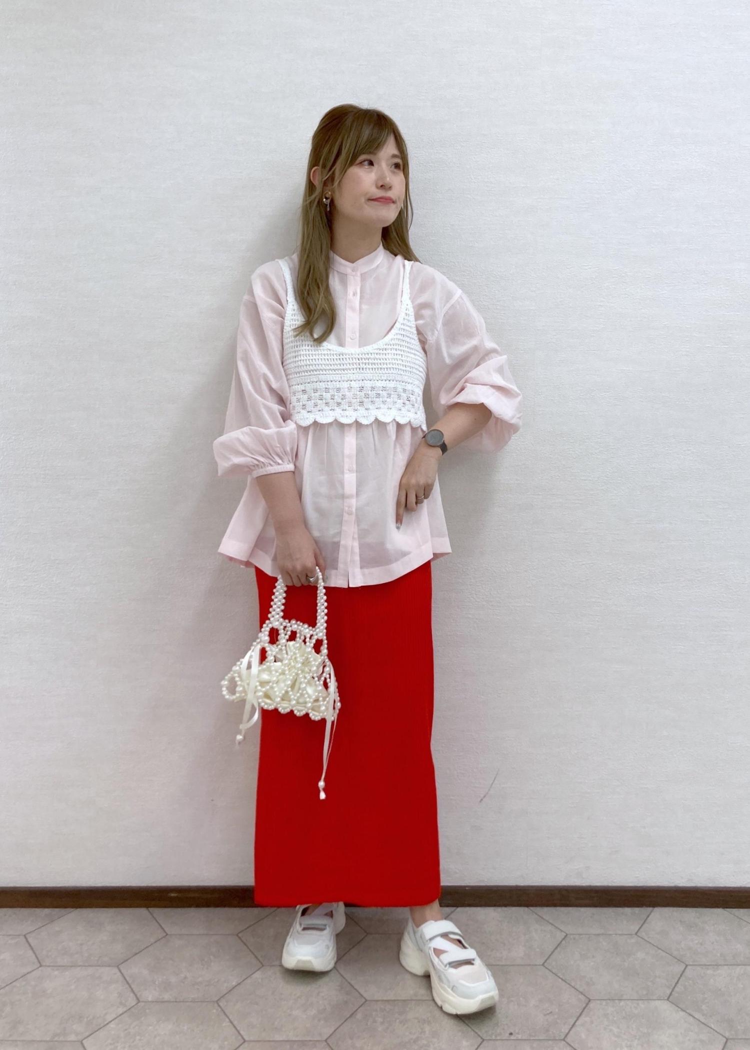 ピンク×赤のインパクトのあるカラーあわせでワンランク上のコーディネートに!シルエットもすっきりでスタイルアップできます。スニーカーでカジュアルダウンさせました!