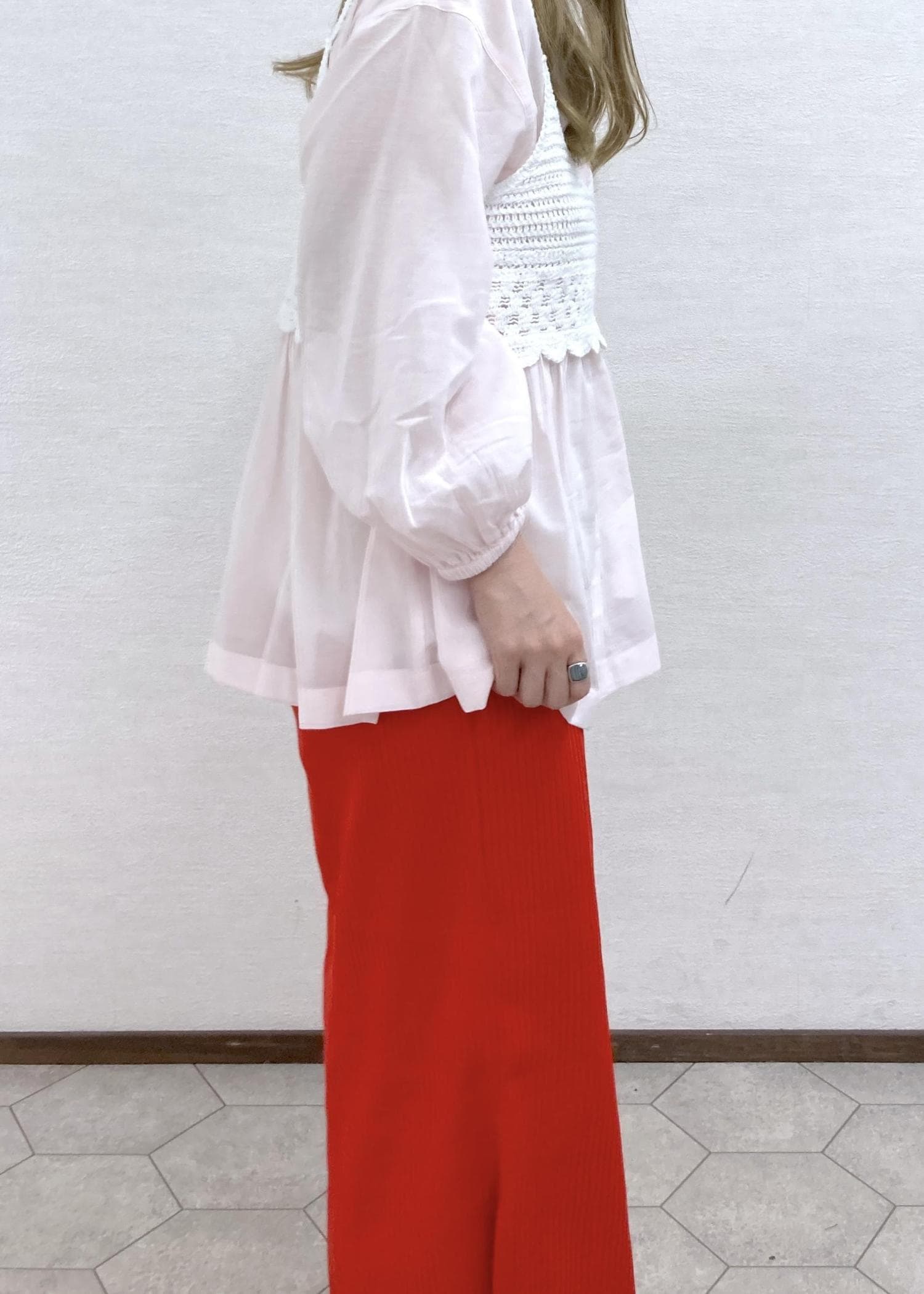 ・ヒップラインからストンと落ちるシルエットで、脚のラインが響きにくい。 -