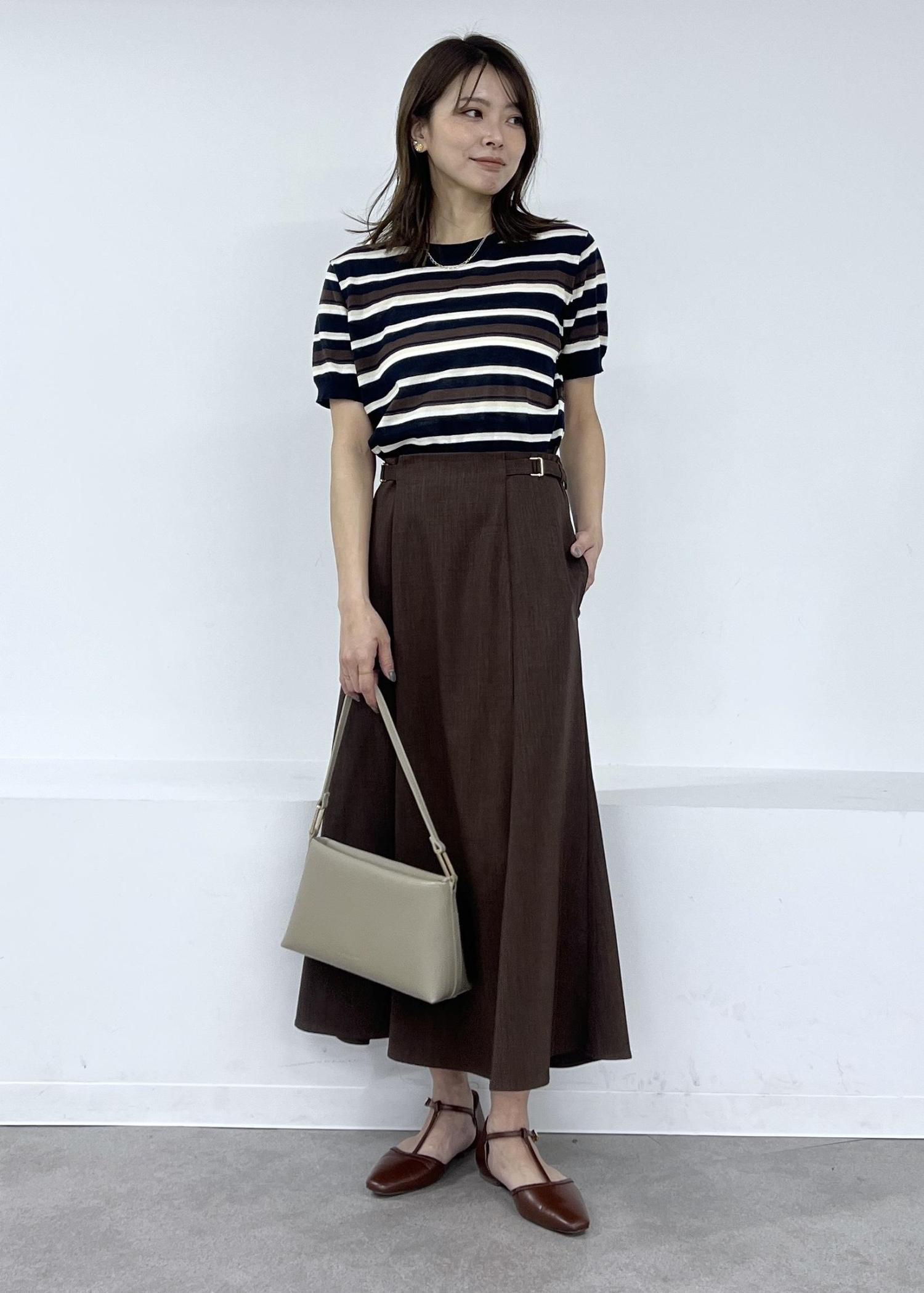 スカートのカラーが鮮やかなので小物はシンプルなアイテム合わせがおすすめです。