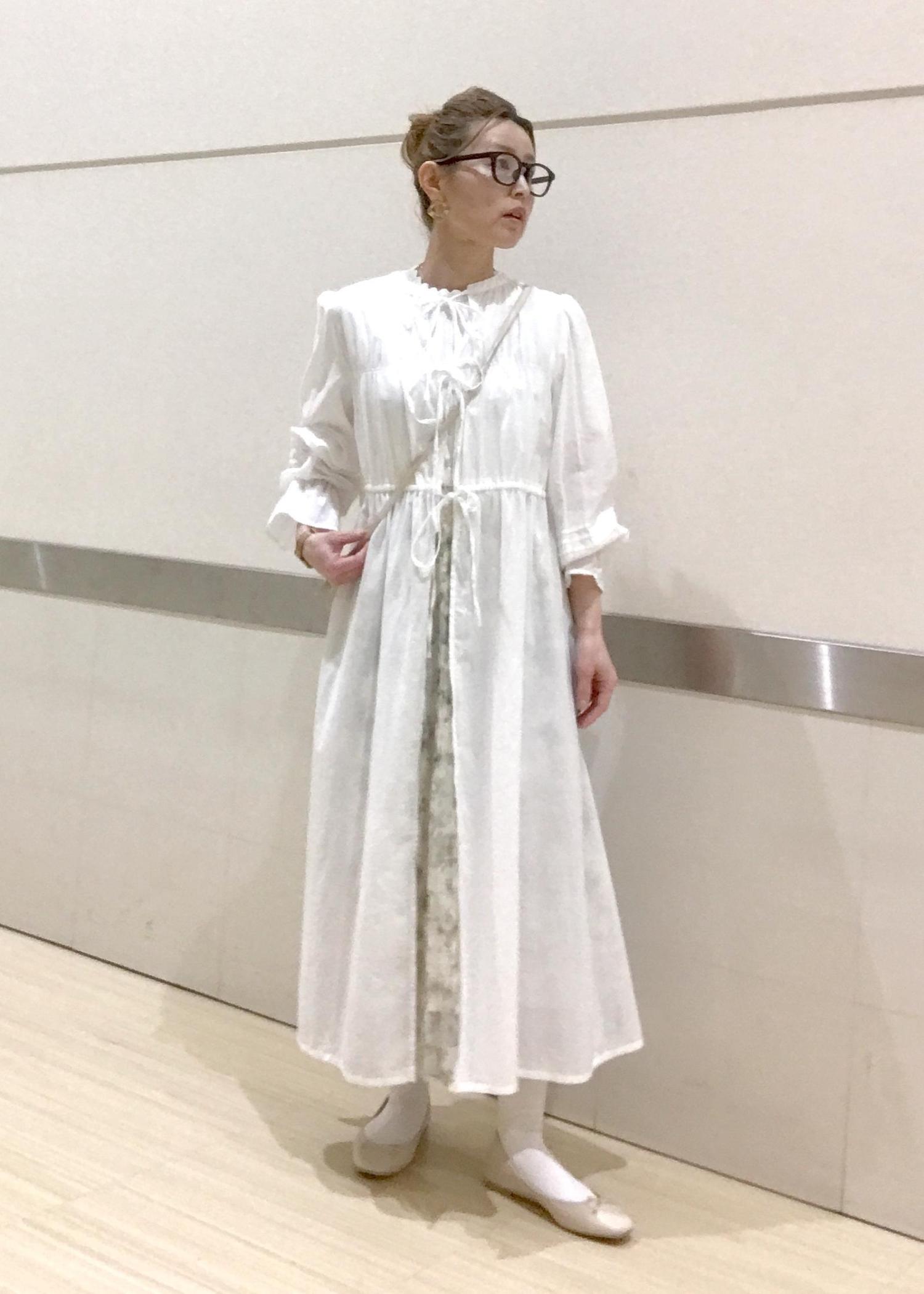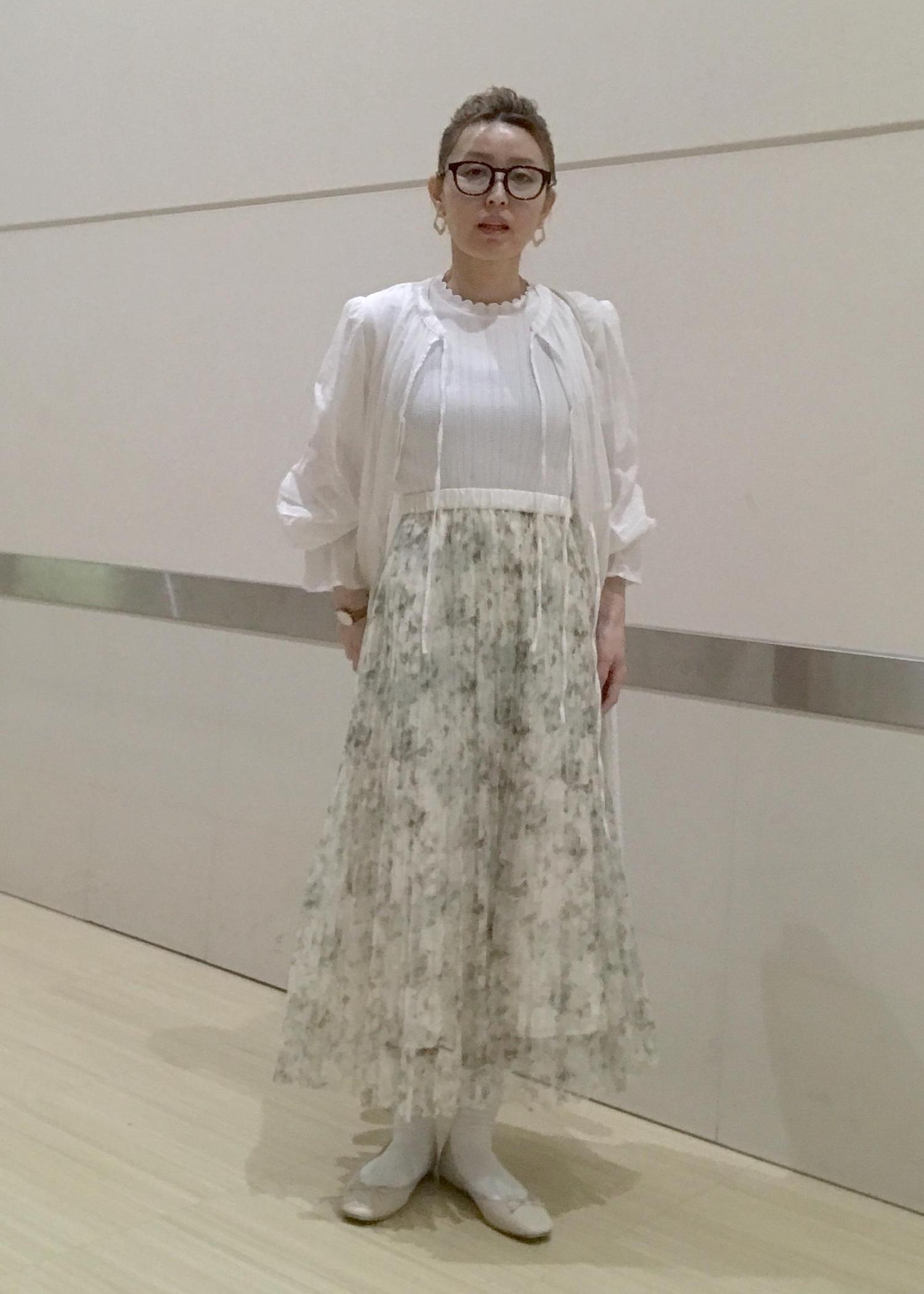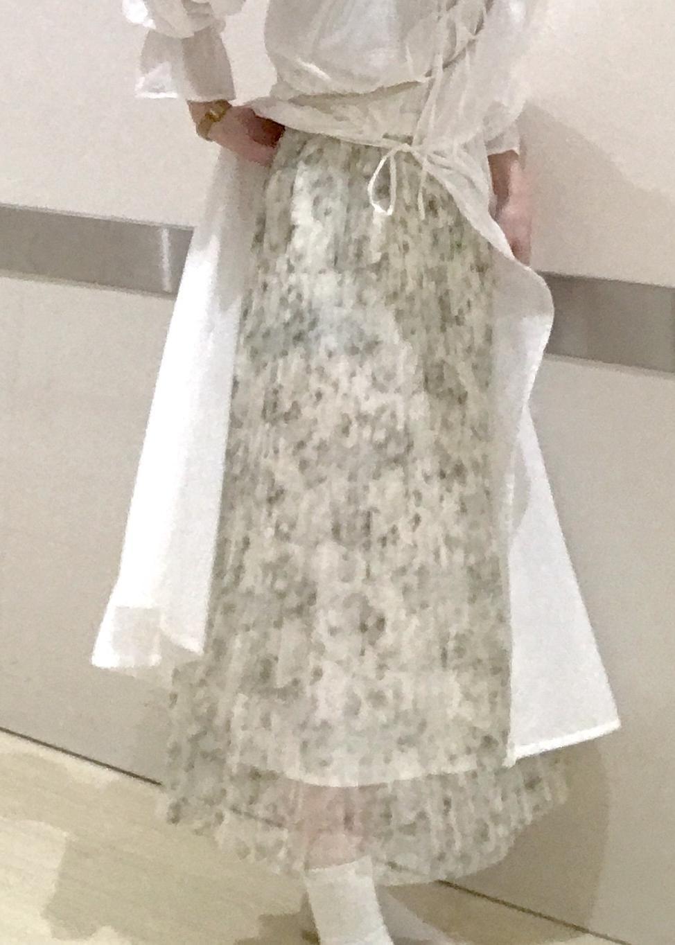 ふんわりとした雰囲気がかわいいガウンワンピースに、さり気なくチラ見えするカーキ系のシアースカートで柔らかい色合いと素材感で春らしいコーデにしました♫
