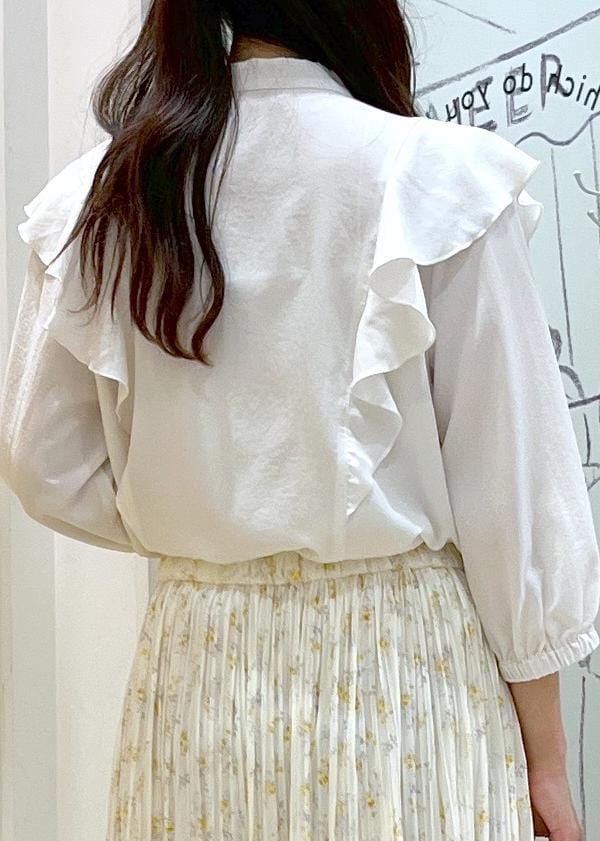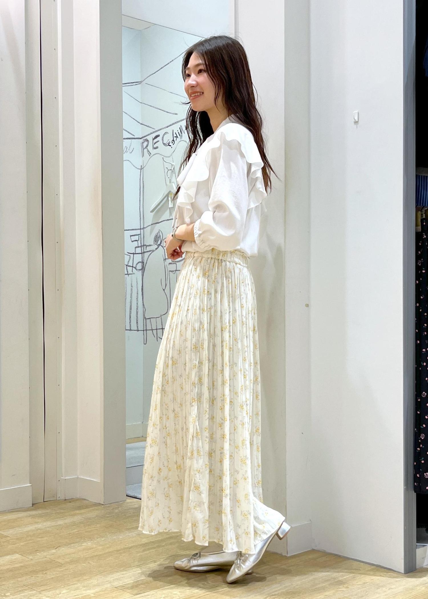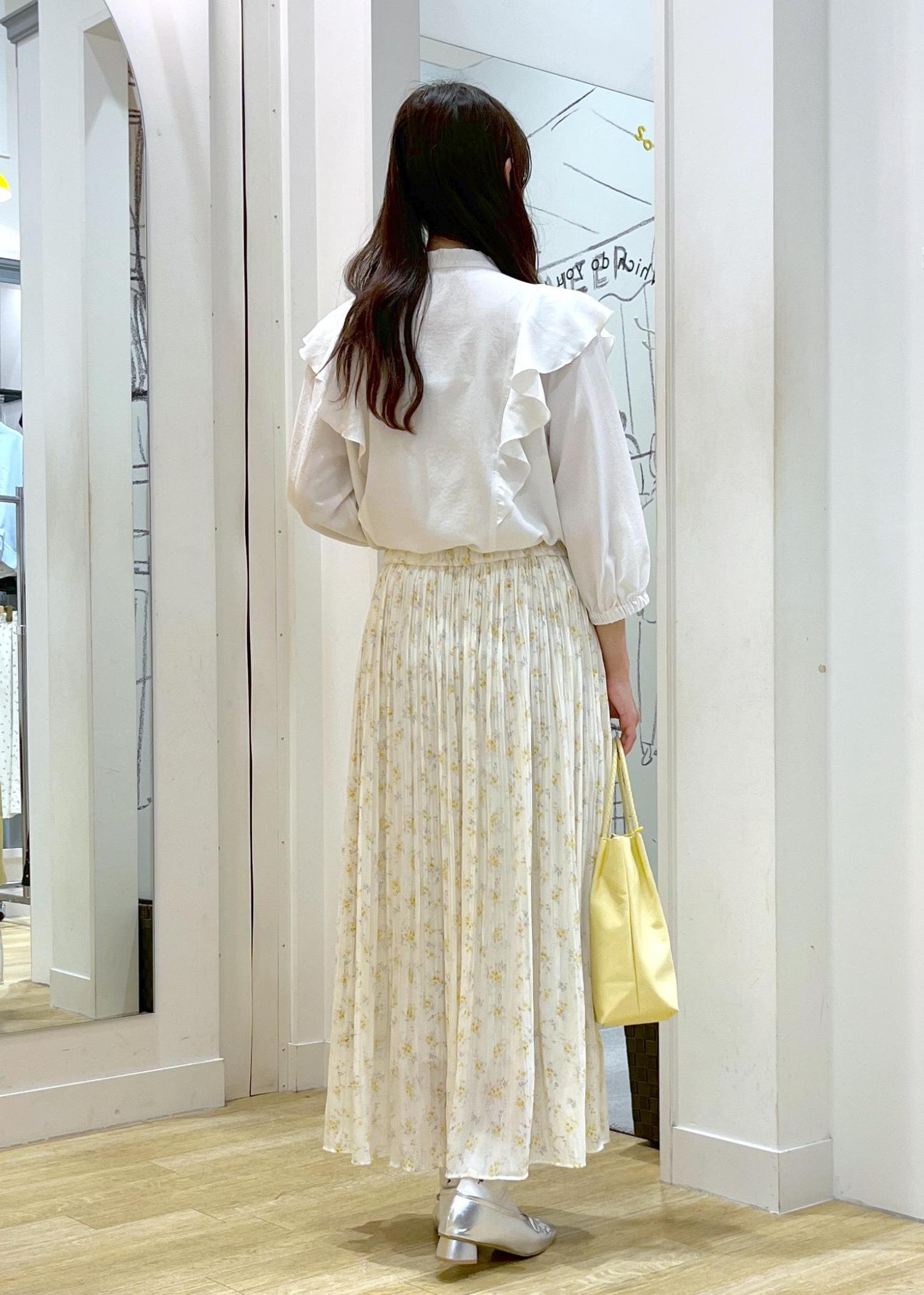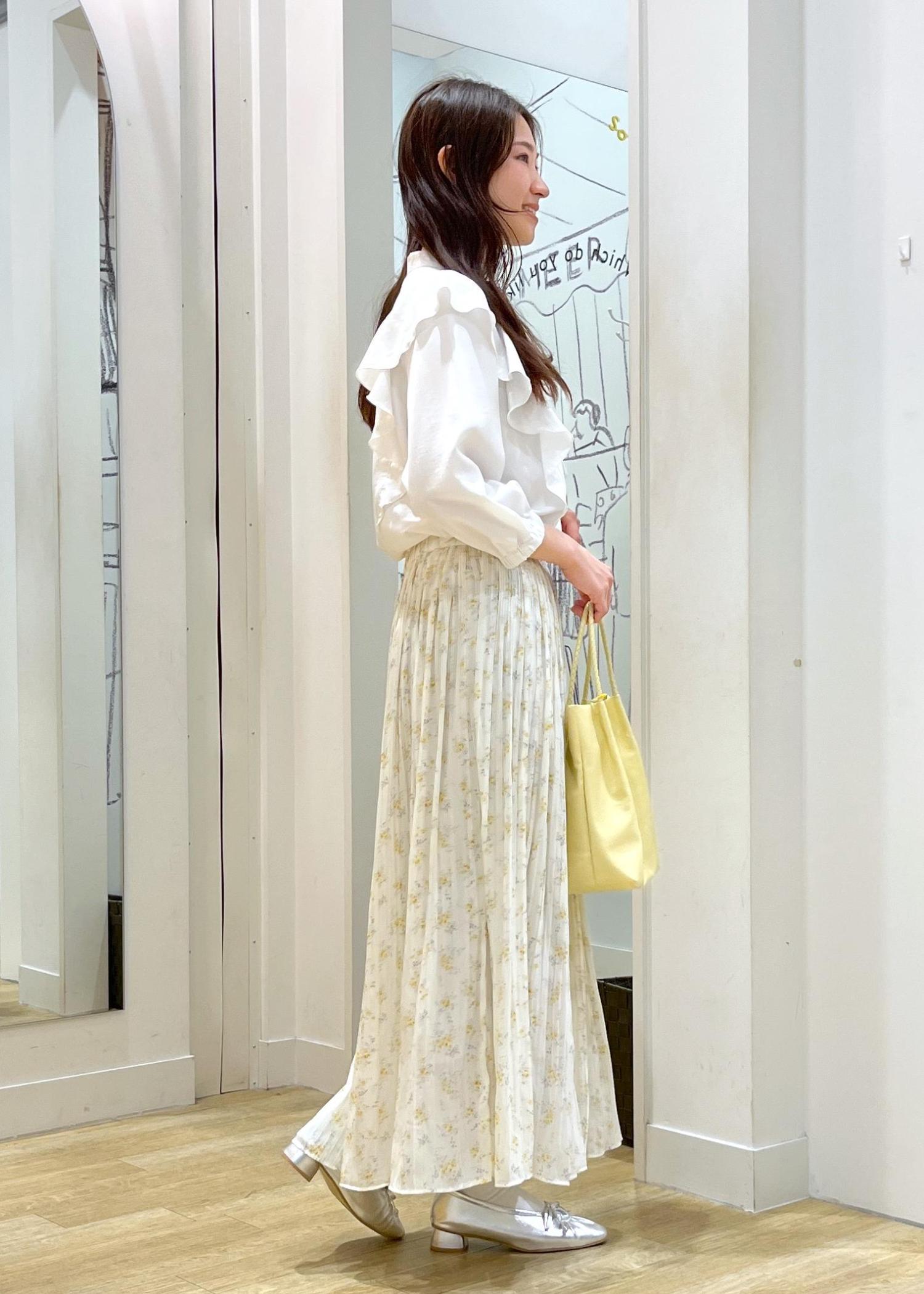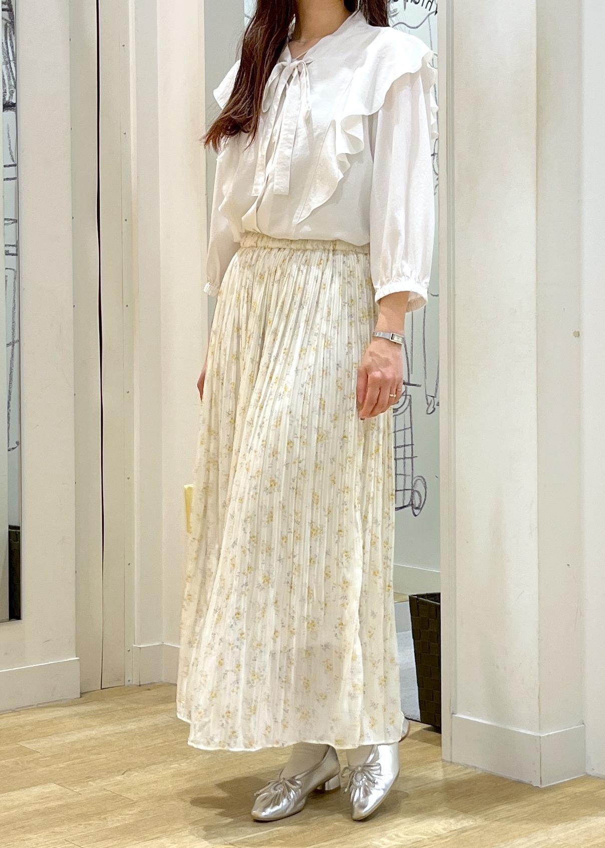 フリルのブラウスに動きのある柔らかいプリーツスカートを合わせたコーデです。