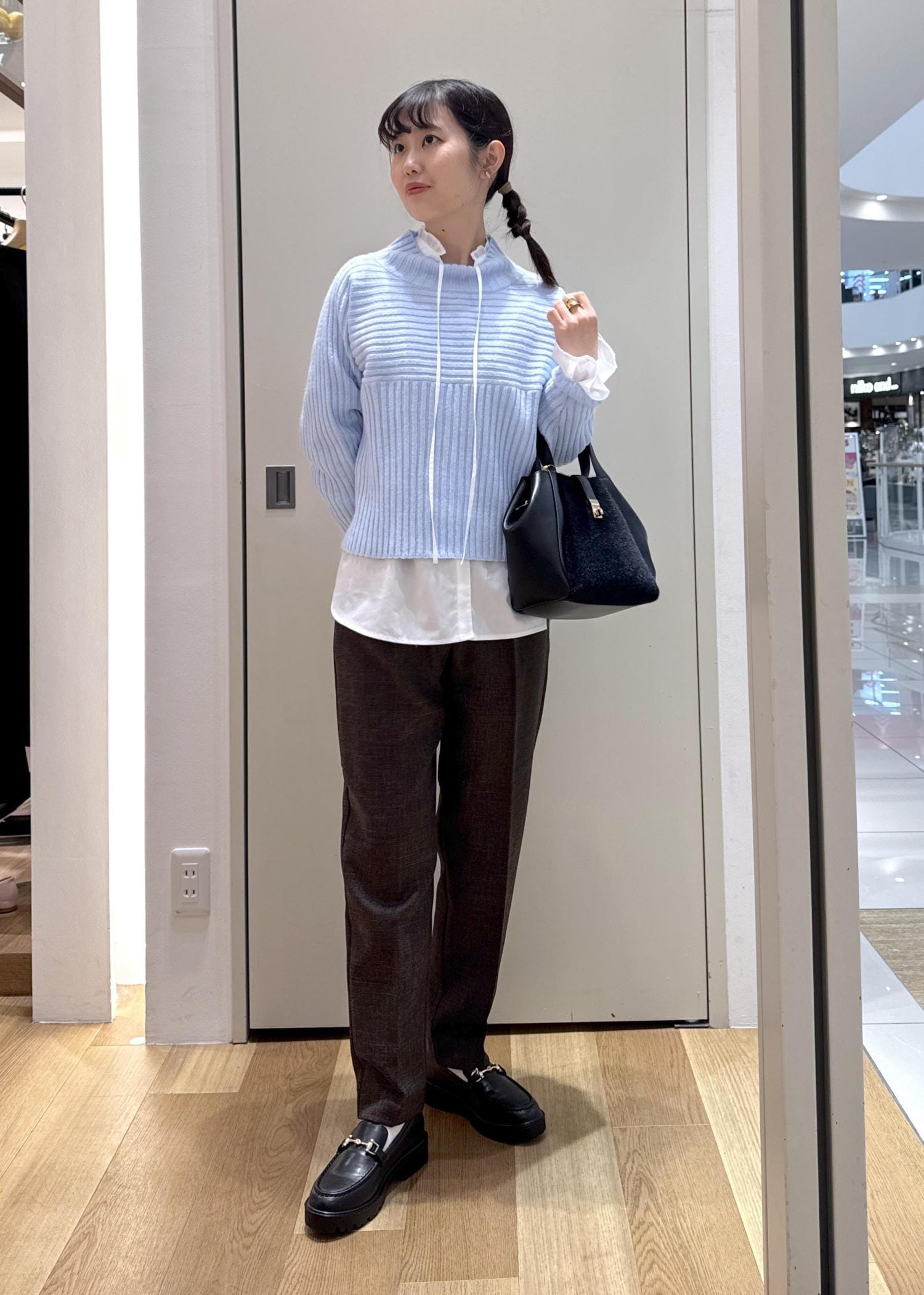 さらっとした手触りのサマーニットは接触冷感で、羽織りで着ているブルゾンも透け感のある薄手の素材で、暑い日が続くこれからの時期におすすめ◎