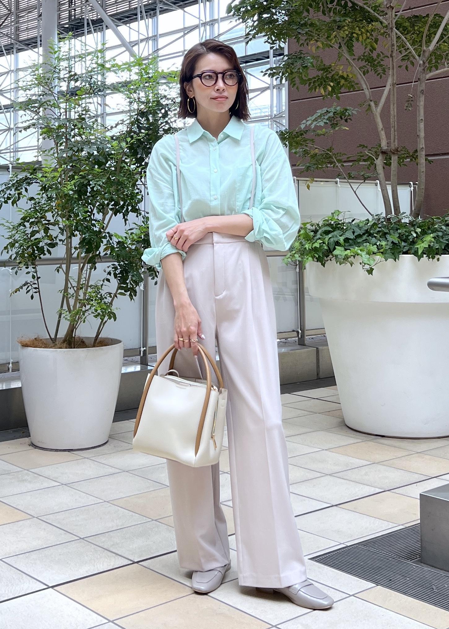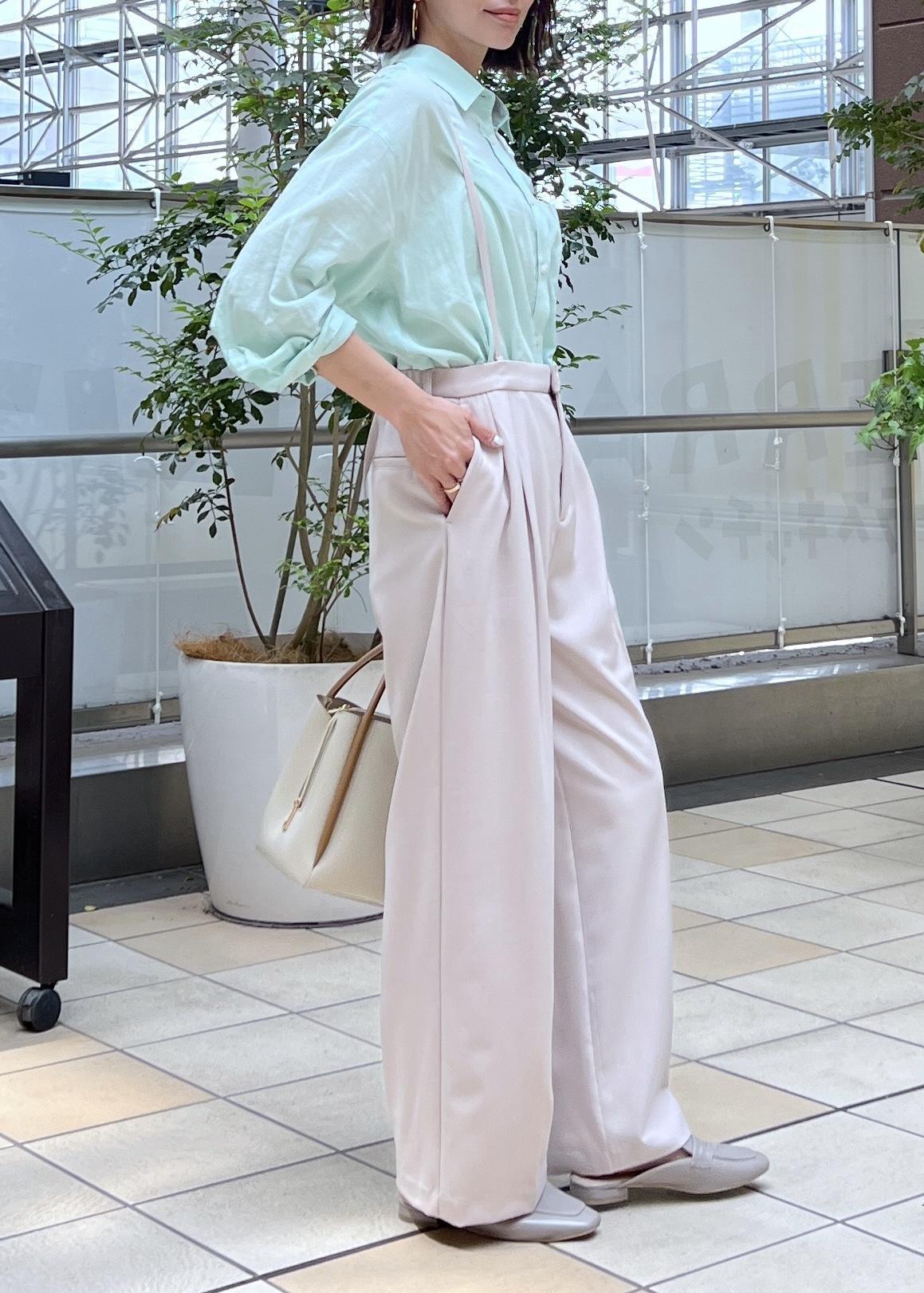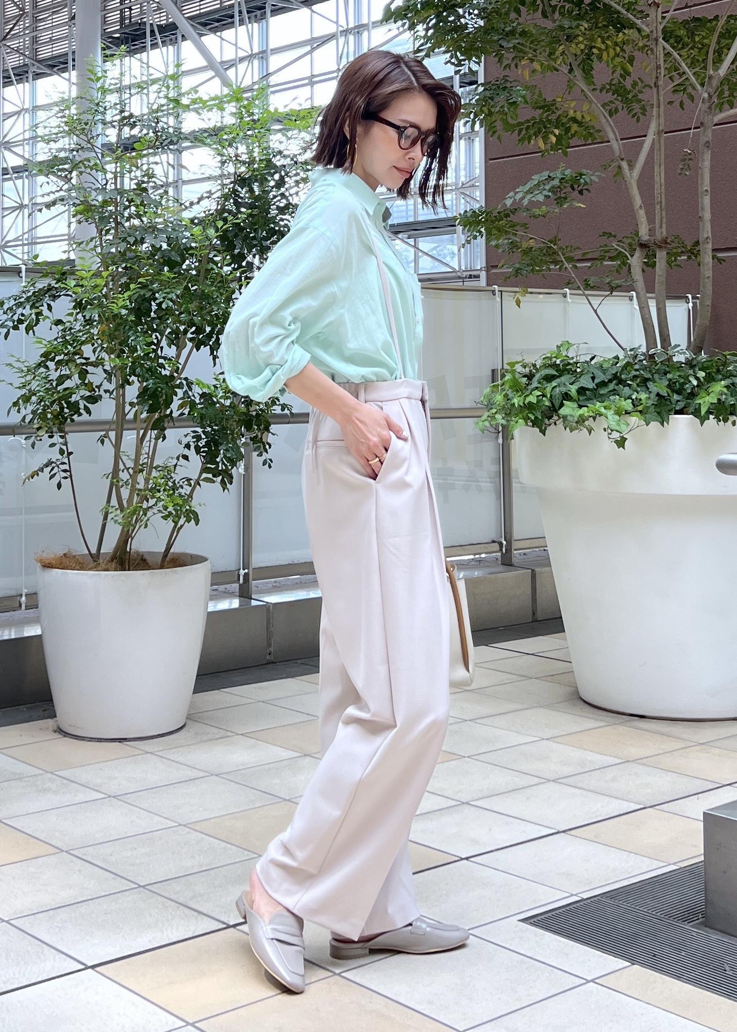 春夏らしい爽やかなライトグリーンのシャツは、ベージュのパンツを合わせてシンプルコーデに。
