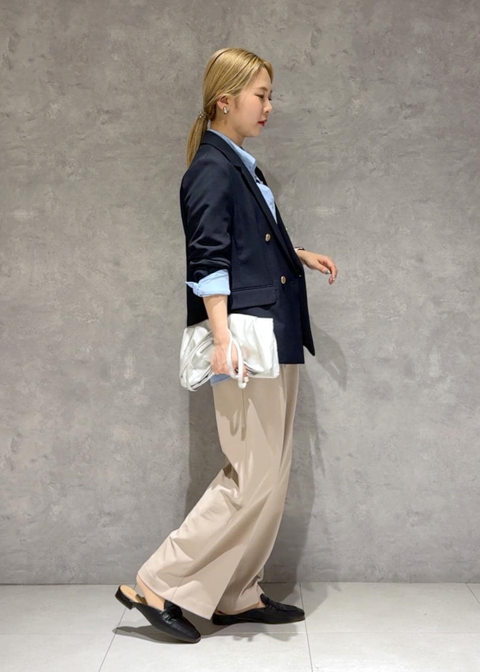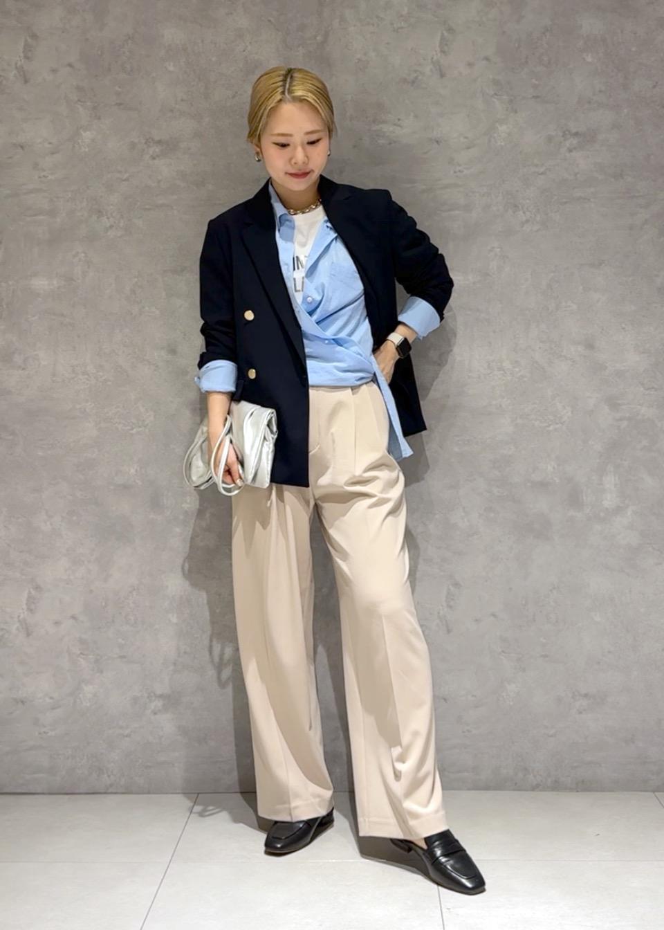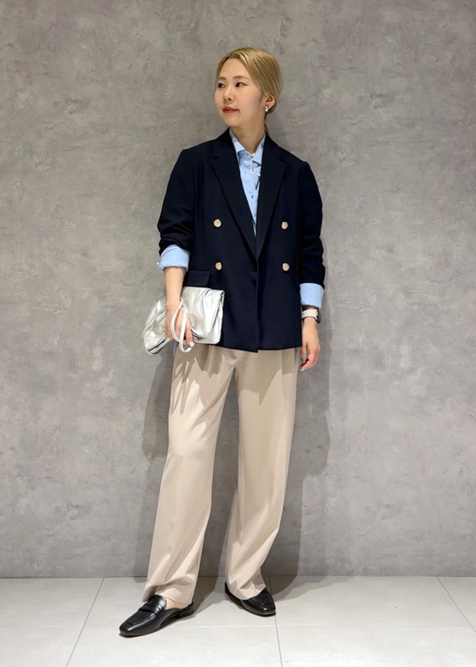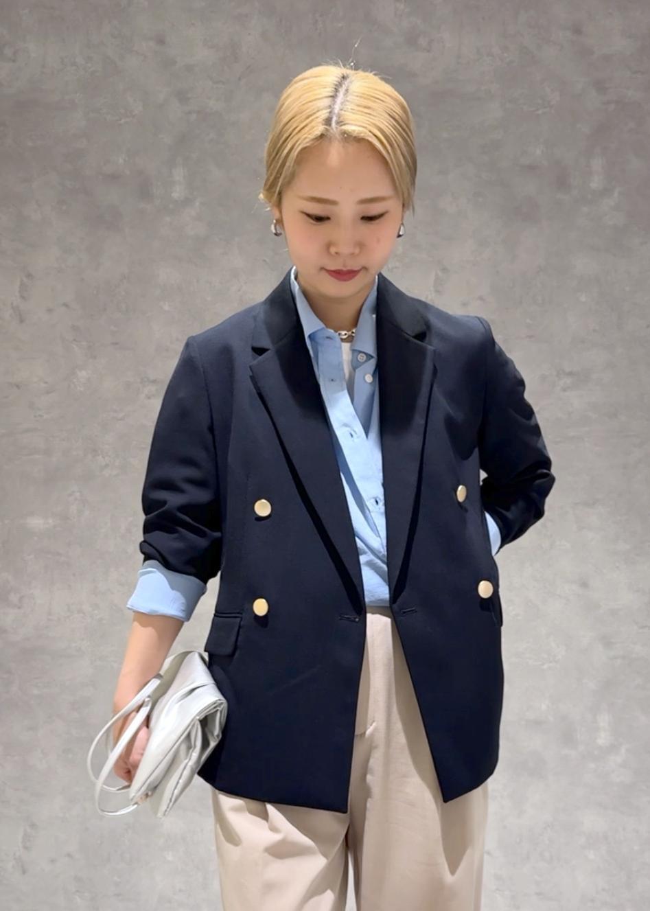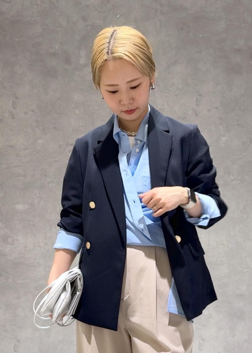 定番で使いやすい金釦ジャケットにTシャツとシャツをレイヤードして、少しカジュアルめなアイテムで崩しキメすぎないコーデにしました。
