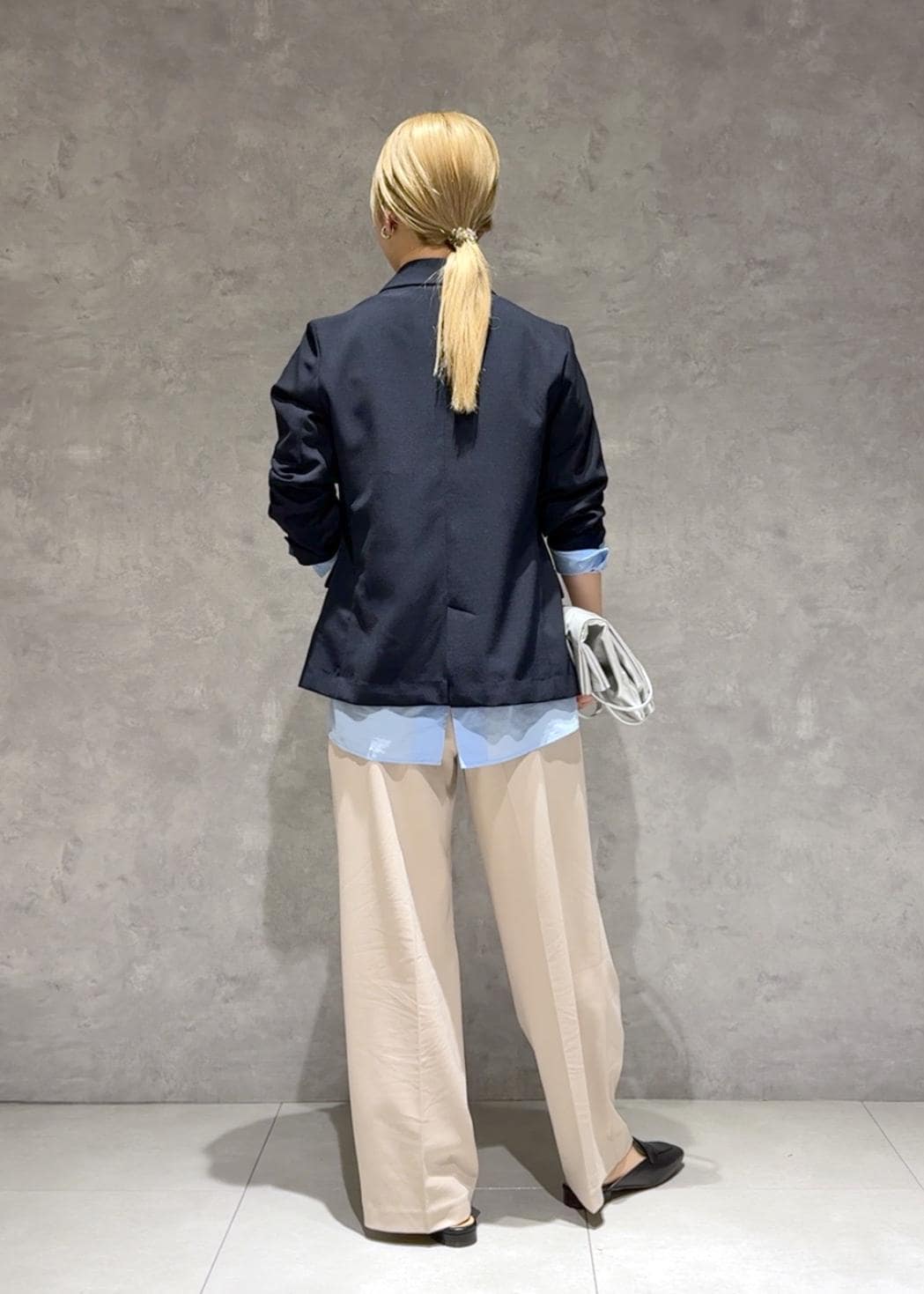 私には少し着丈が長めでフラットシューズだと床につくので、ヒールや厚底スニーカーやサンダルと合わせると良さそうです。 -