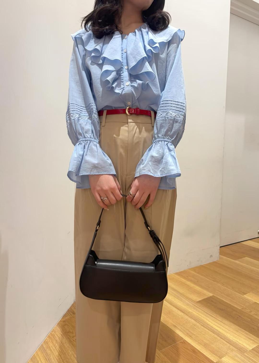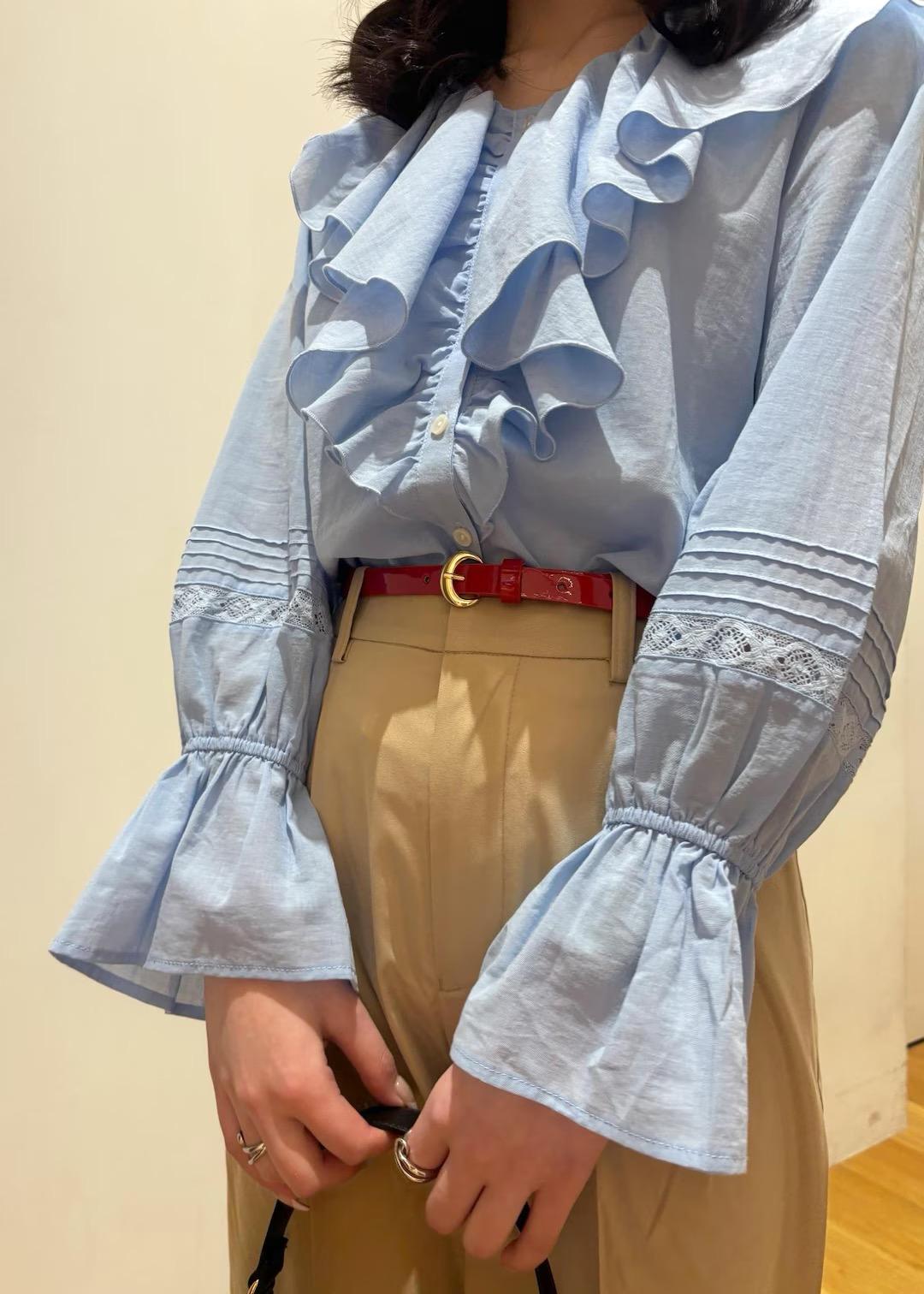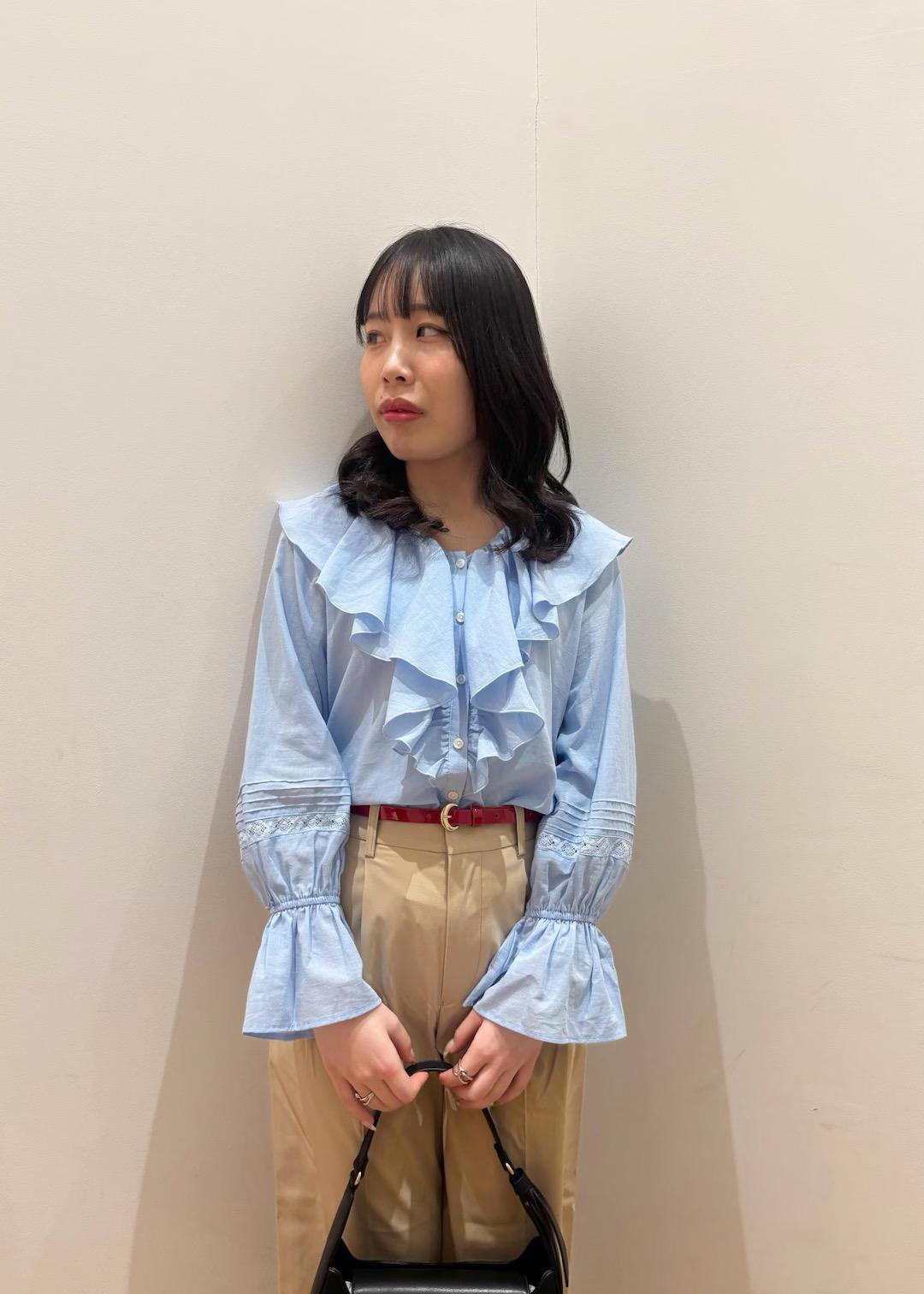 アウトレットROPÉ PICNIC【接触冷感・通気性】お着軽シャツシリーズ/綿ボイルフリルブラウスサックス / 38¥4,391レビュー首元が割とあいていて涼しく、アクセサリーが見える。