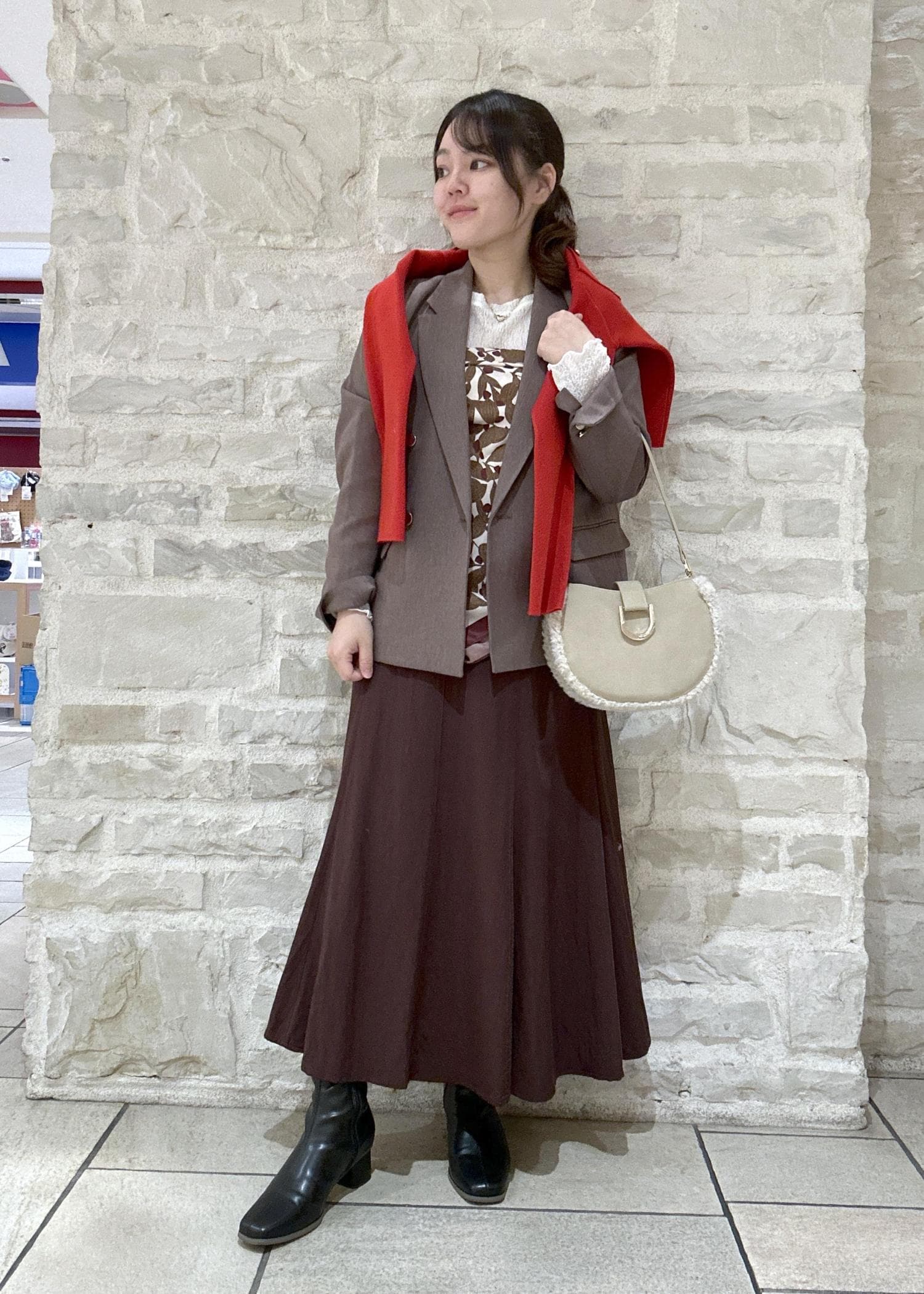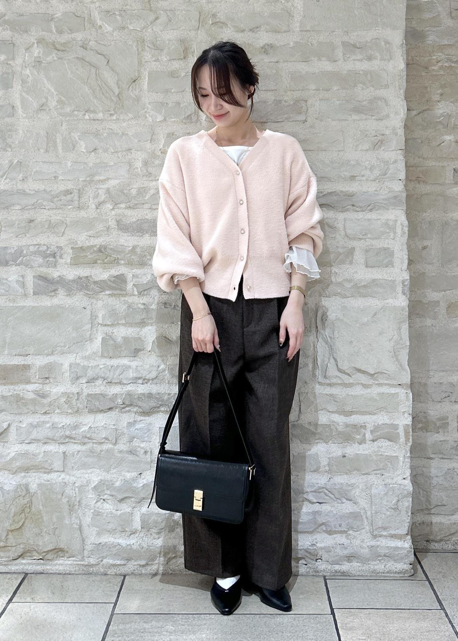ベージュ×ブラックでベーシックなカラーにバレエシューズで赤を取り入れ大人カジュアルなスタイリングにしました。