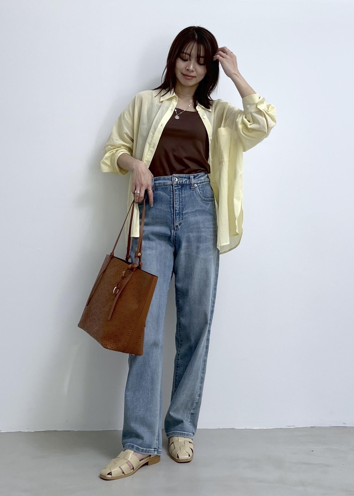 パンツスタイルでかっこよさのあるコーデには、フリルバッグをポイントにして大人カジュアルなスタイリングに。