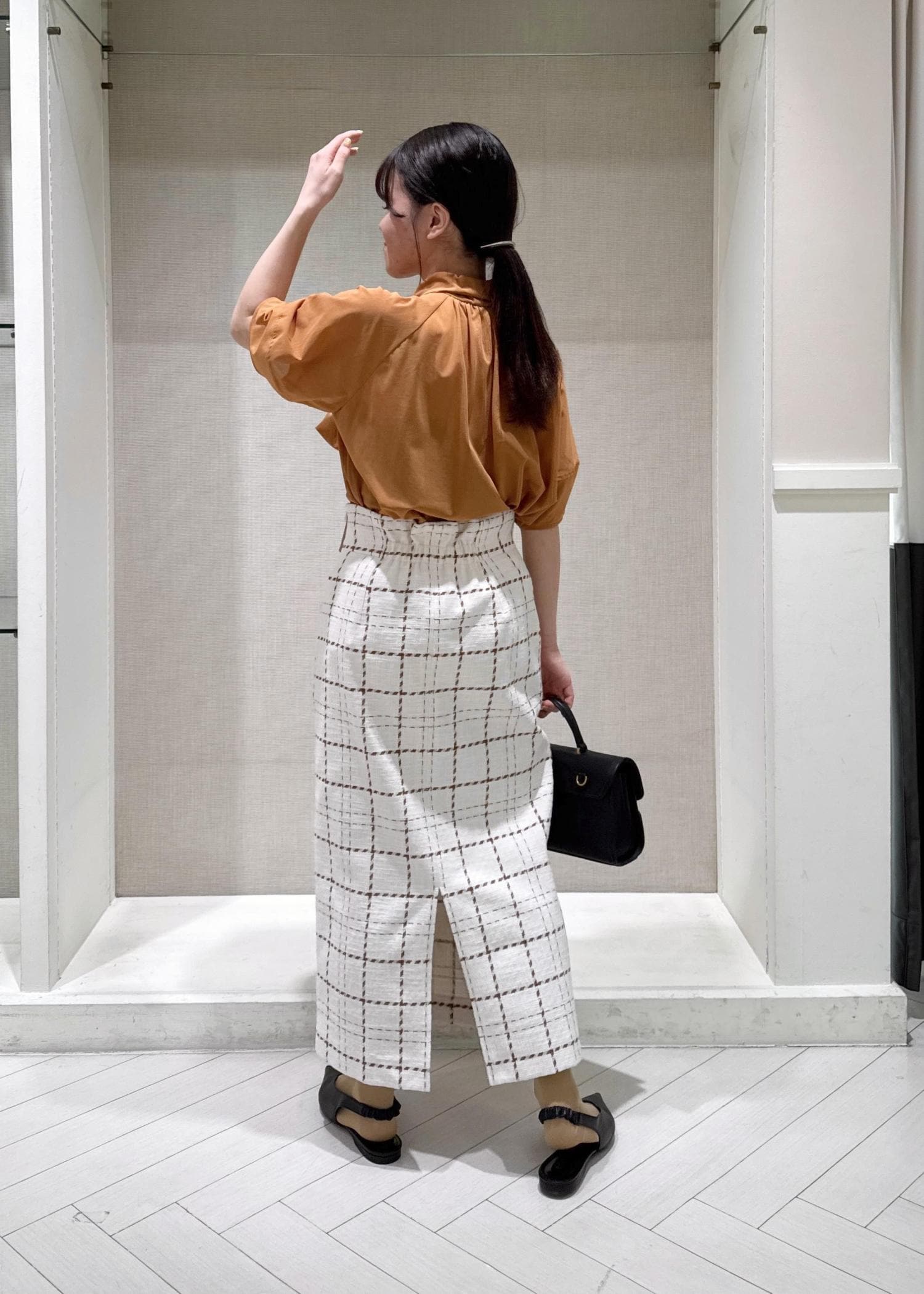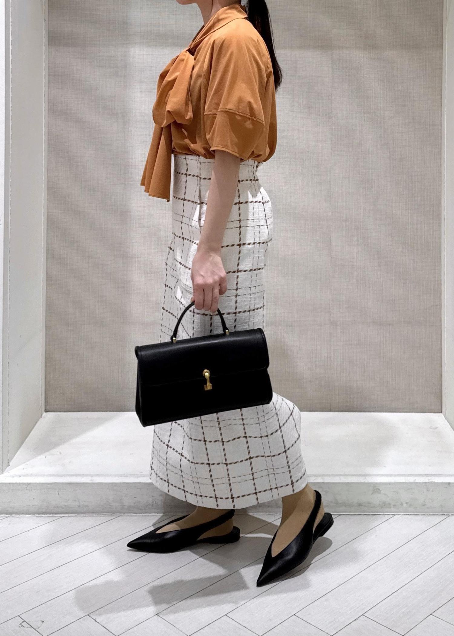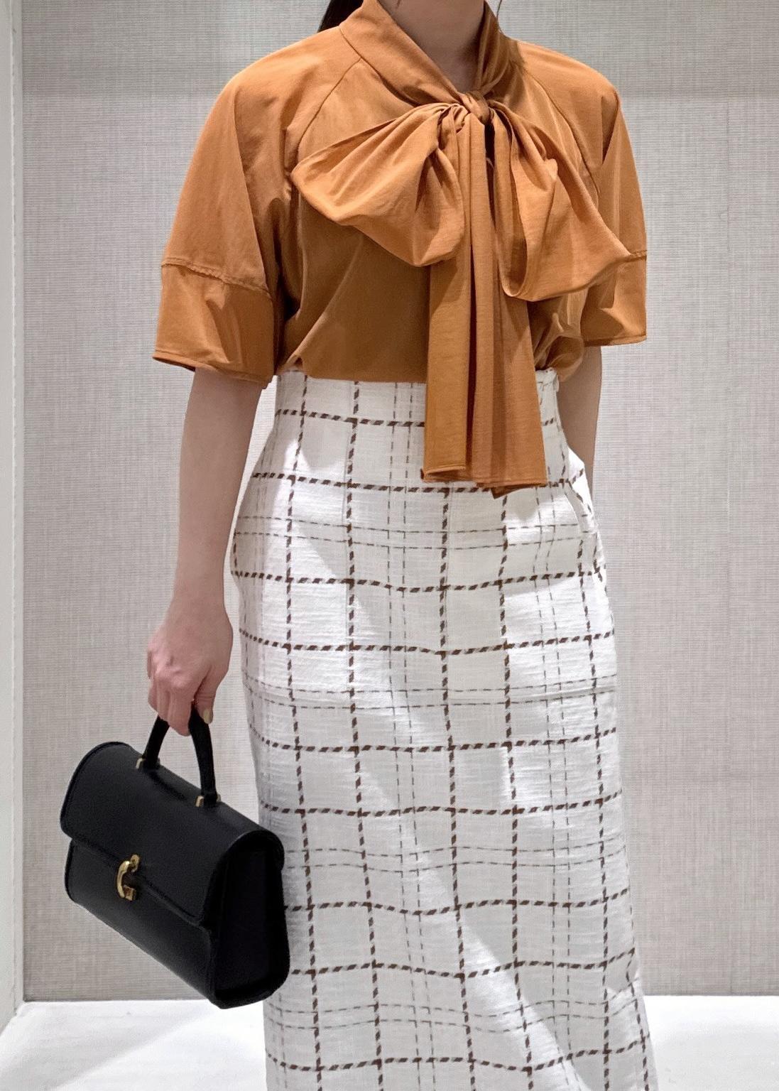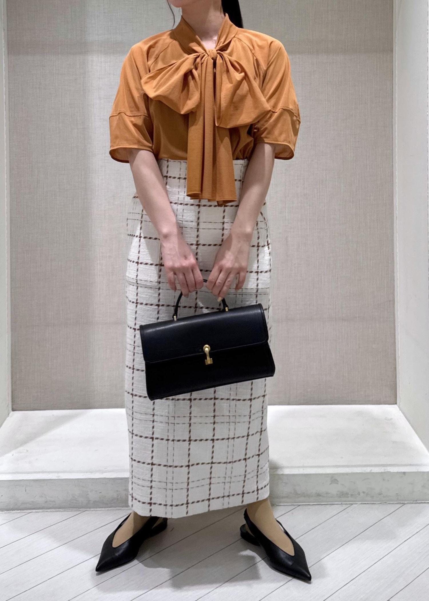 ボリューム感のあるボウタイが存在感のあるブラウスで、コーディネートを組んでみました♩