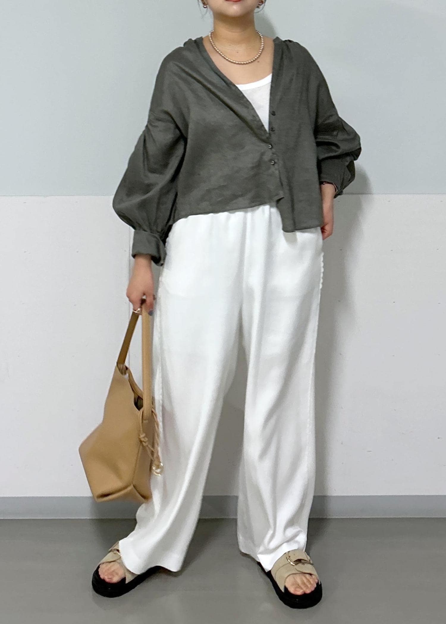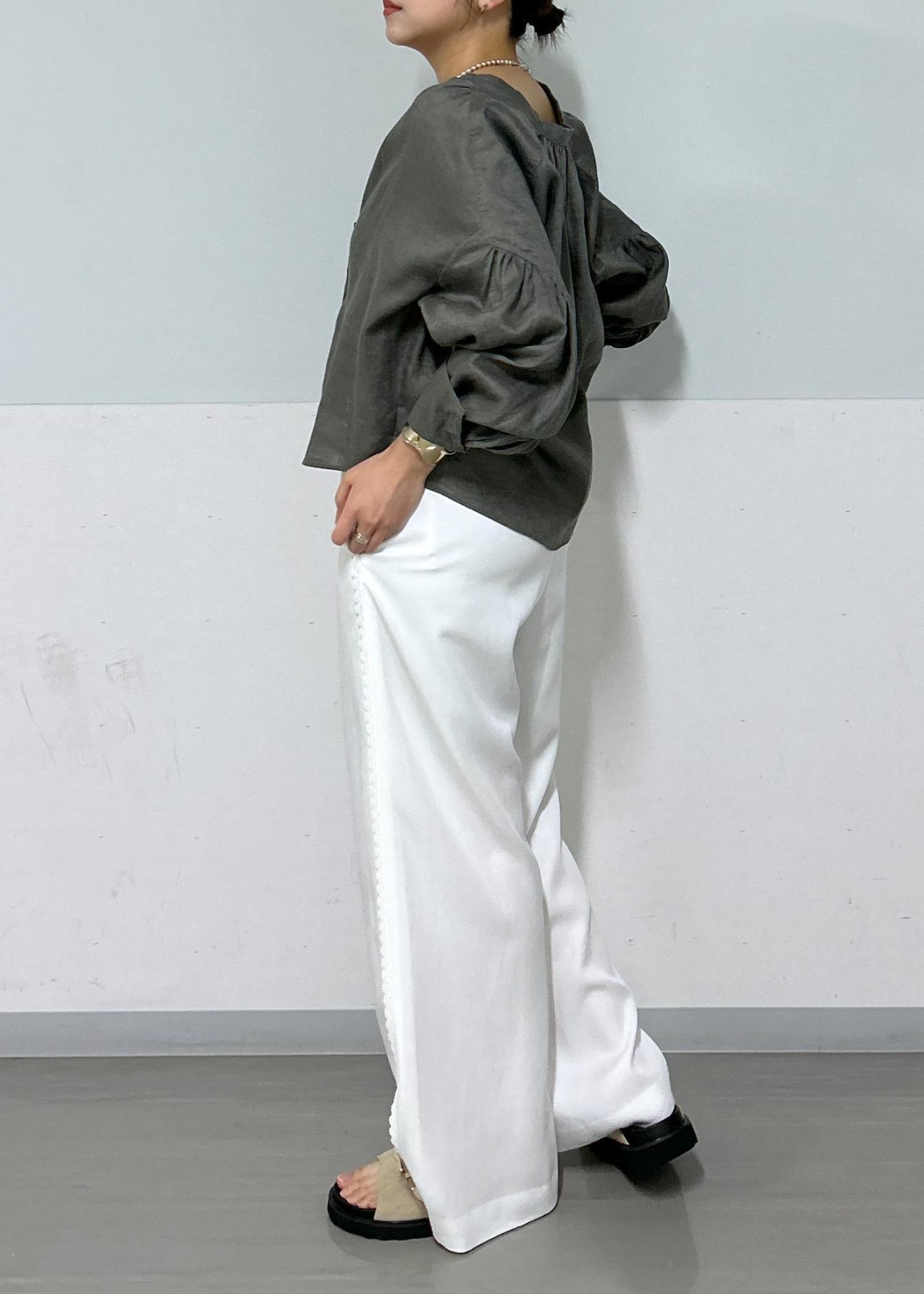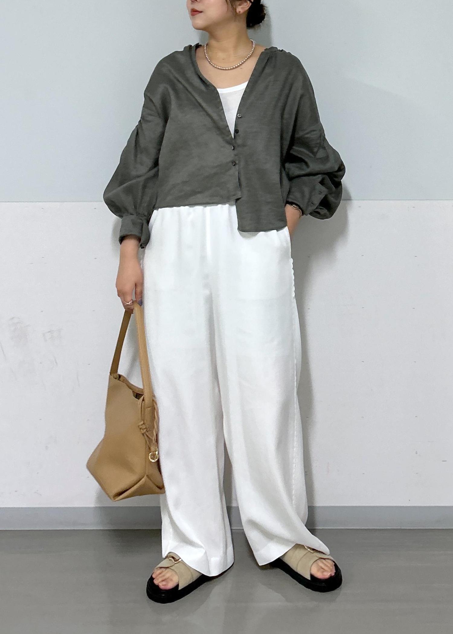 リネン100%の素材で夏場でもサラっと着れるアイテム。おうちでお洗濯可能なのが嬉しいポイントです。 -