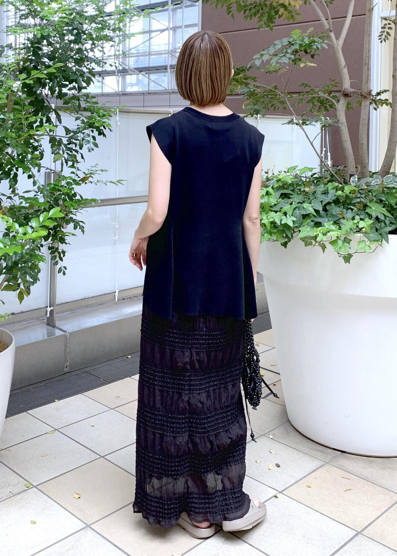 広がりにくい素材だが、身体のラインも拾いにくいシルエットが大人も着やすい。