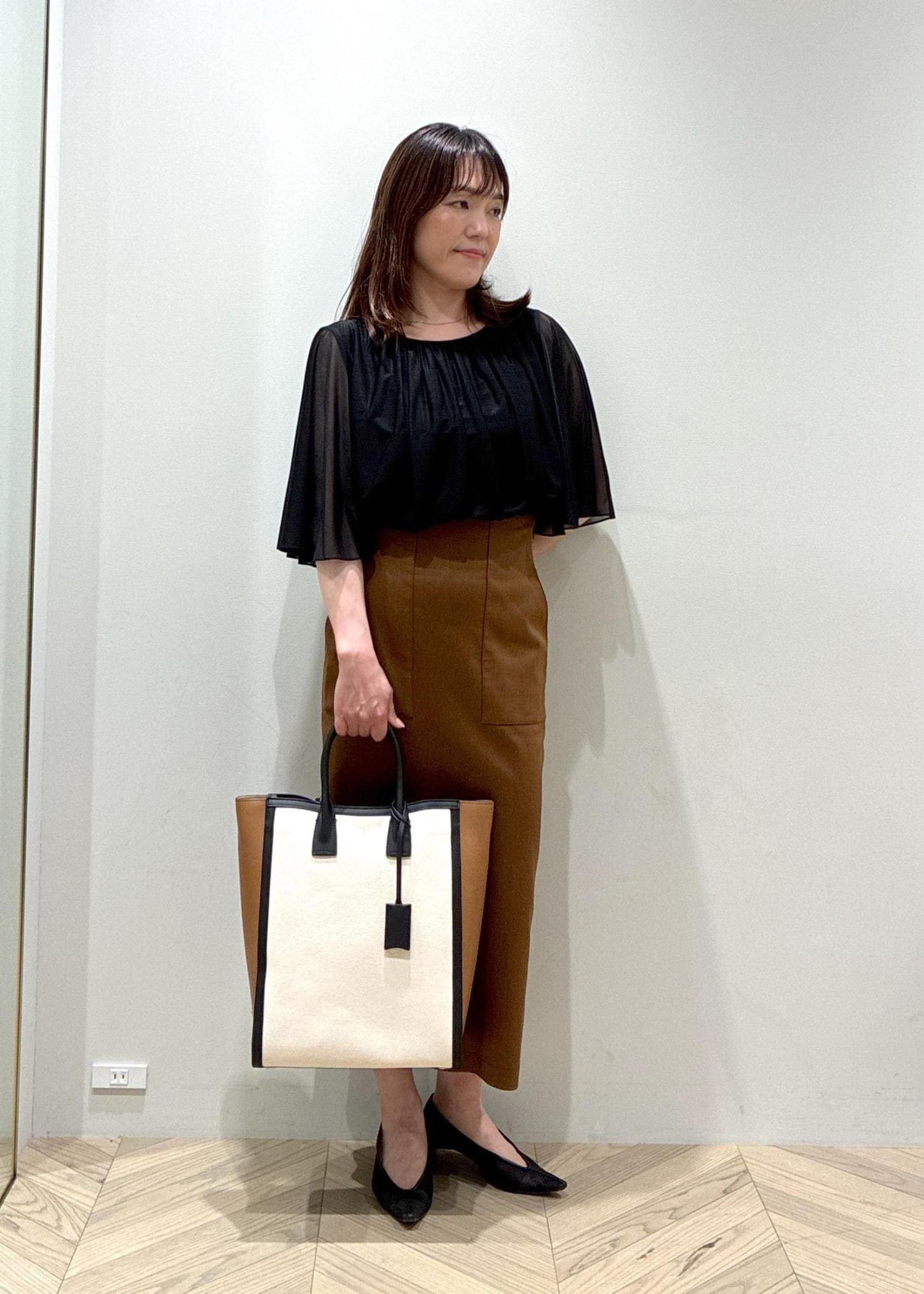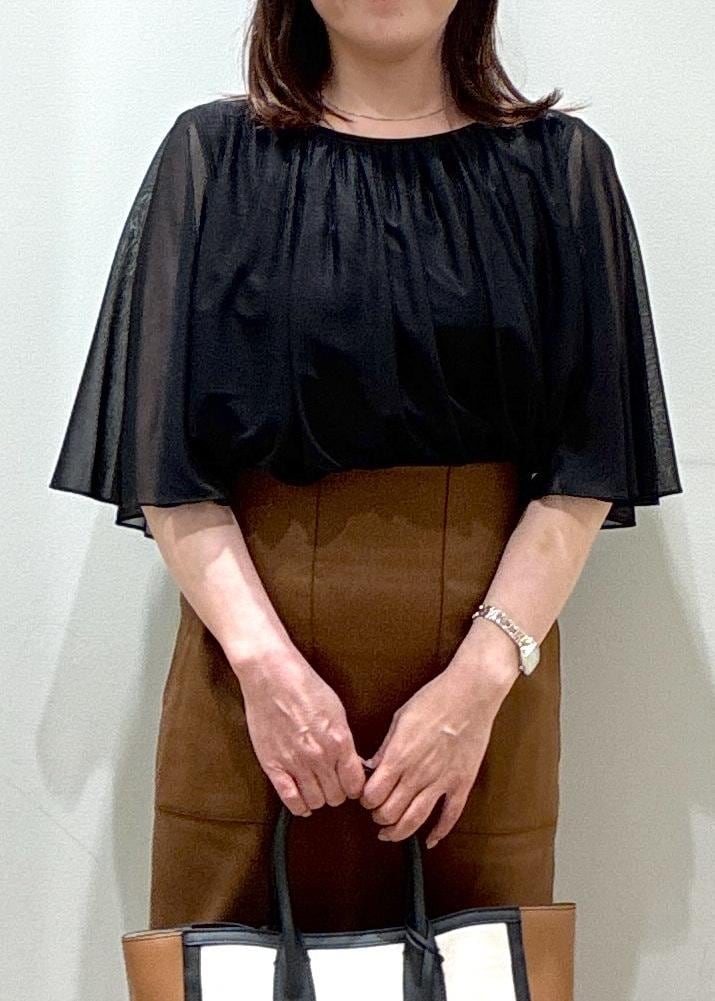 アウトレットROPÉ【洗える】ブライトネスヤーンギャザーブラウス/セットアップ対応ブラック / F¥12,320レビュー158cmフリーサイズ着用。