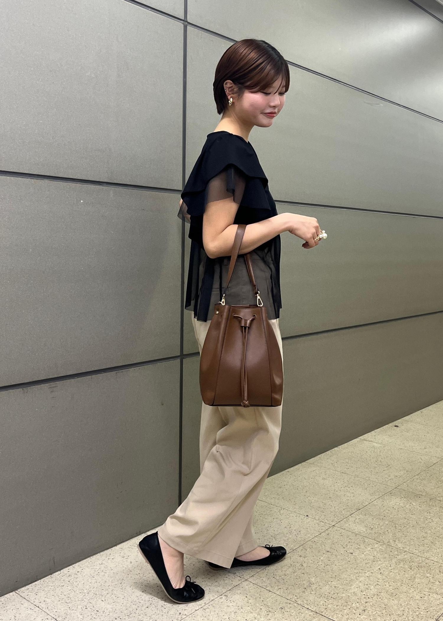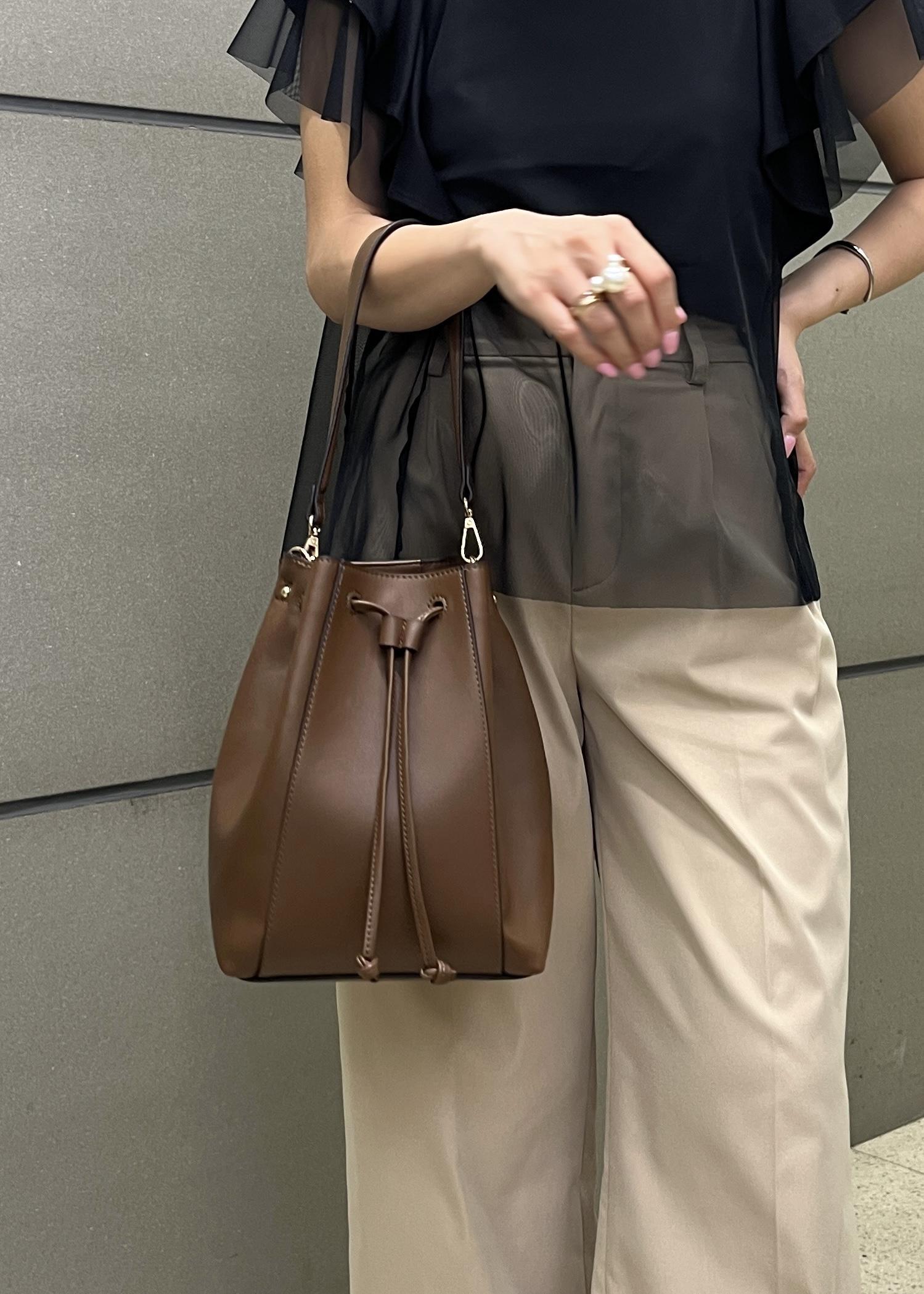 バッグにはトレンドのブラウンを取り入れて、