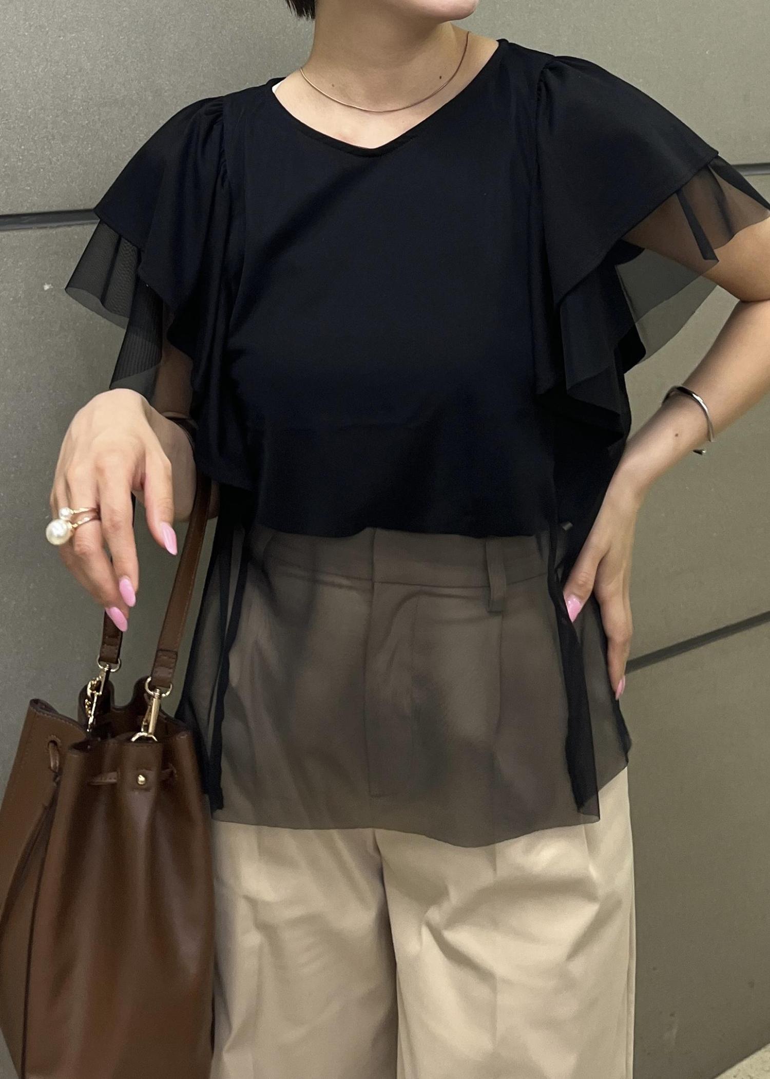 体のラインを拾わないゆとりのあるシルエットで、チュールの部分で二の腕周りも自然とカバーしてくれます◎
