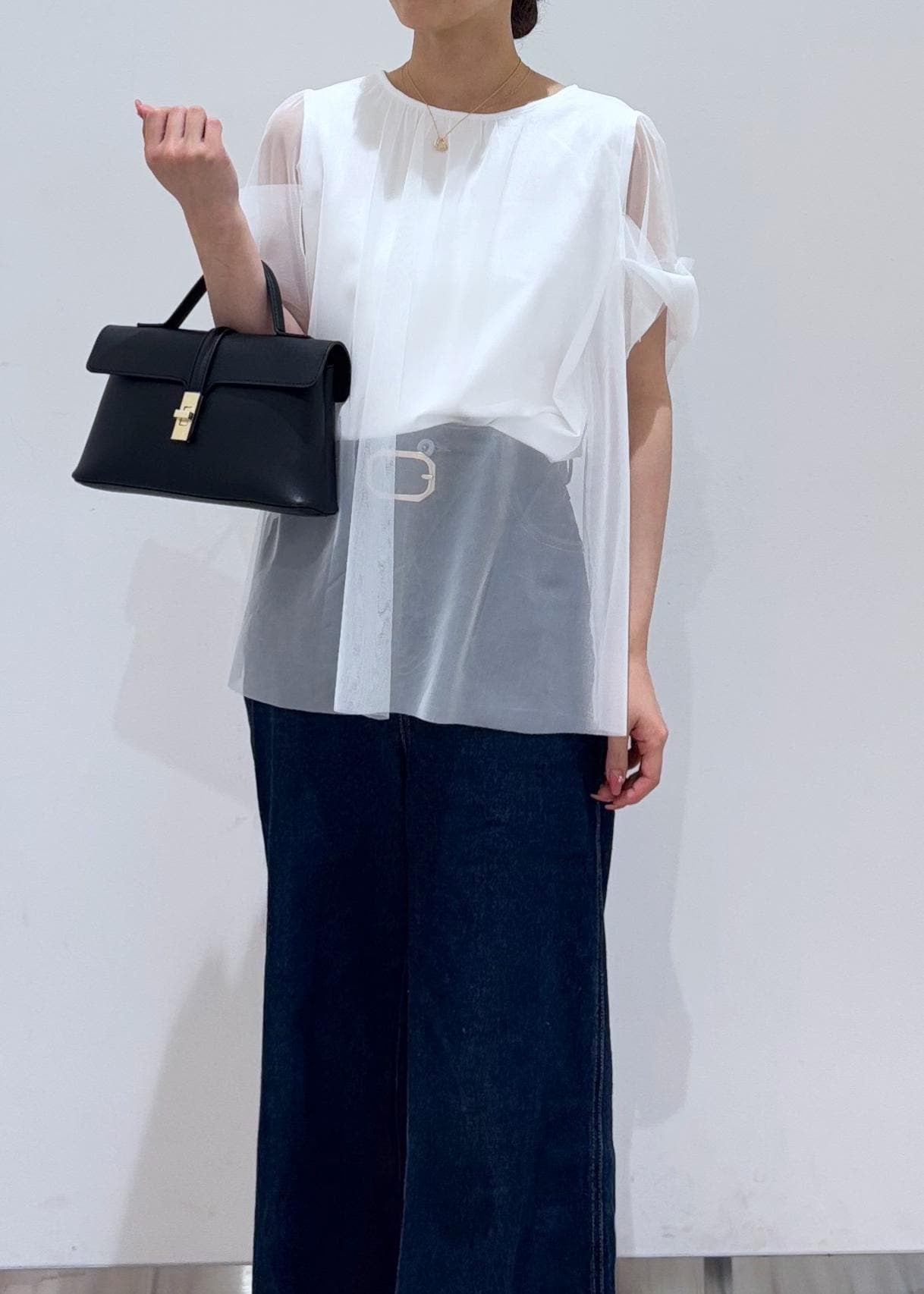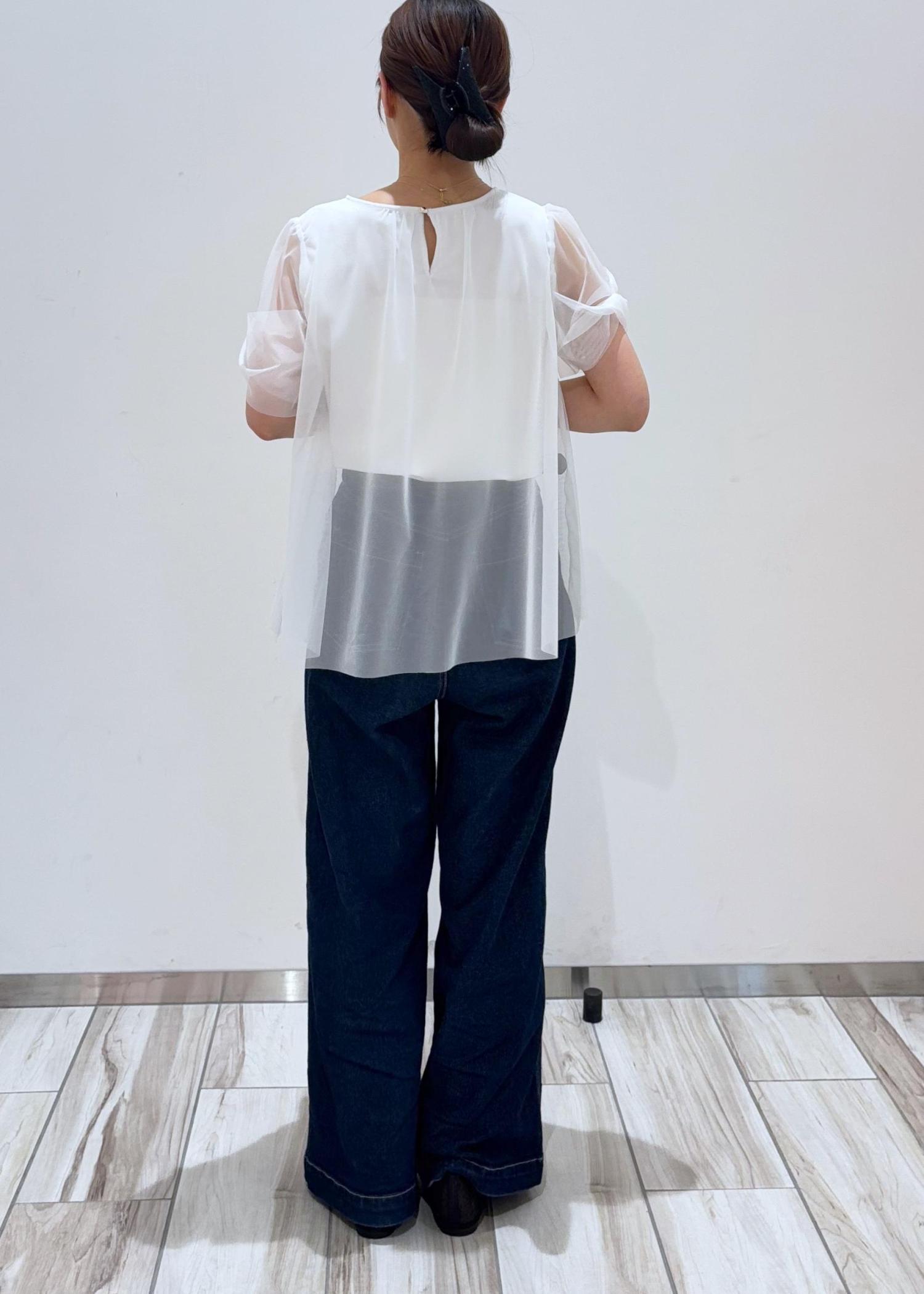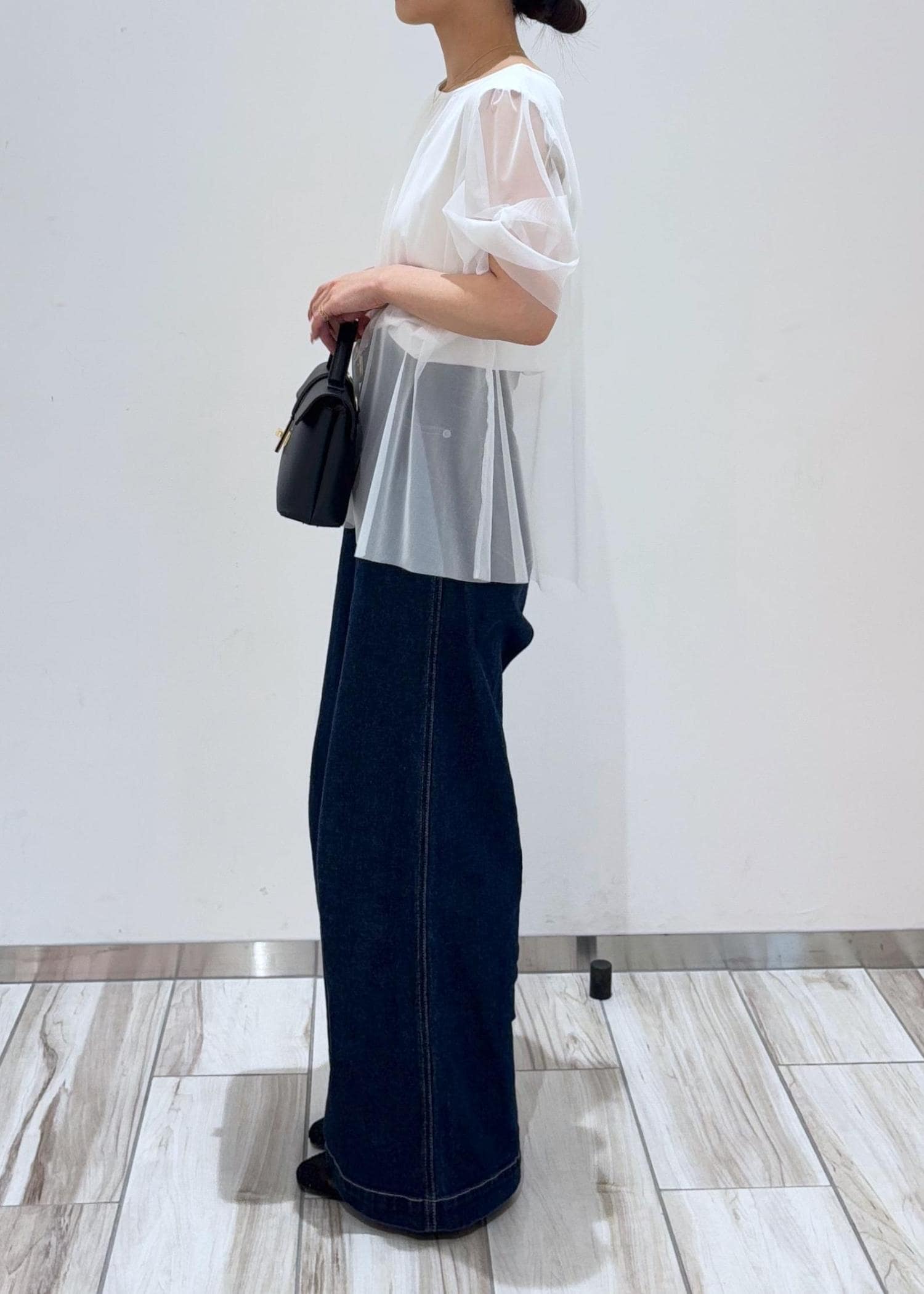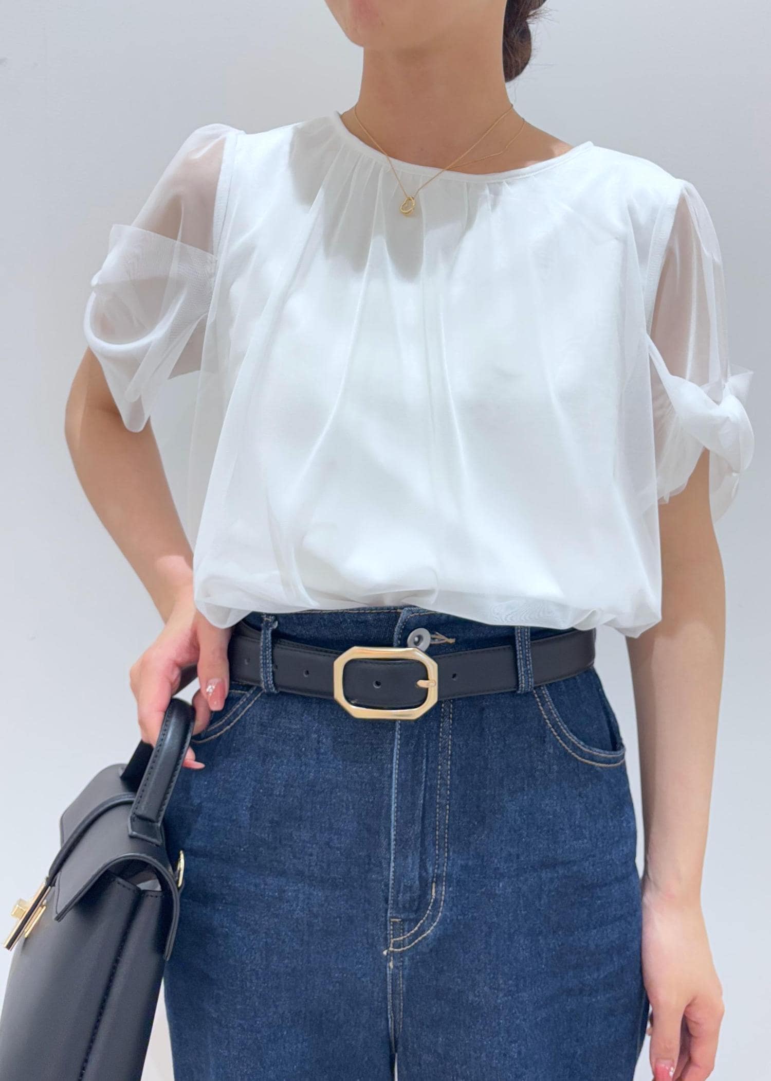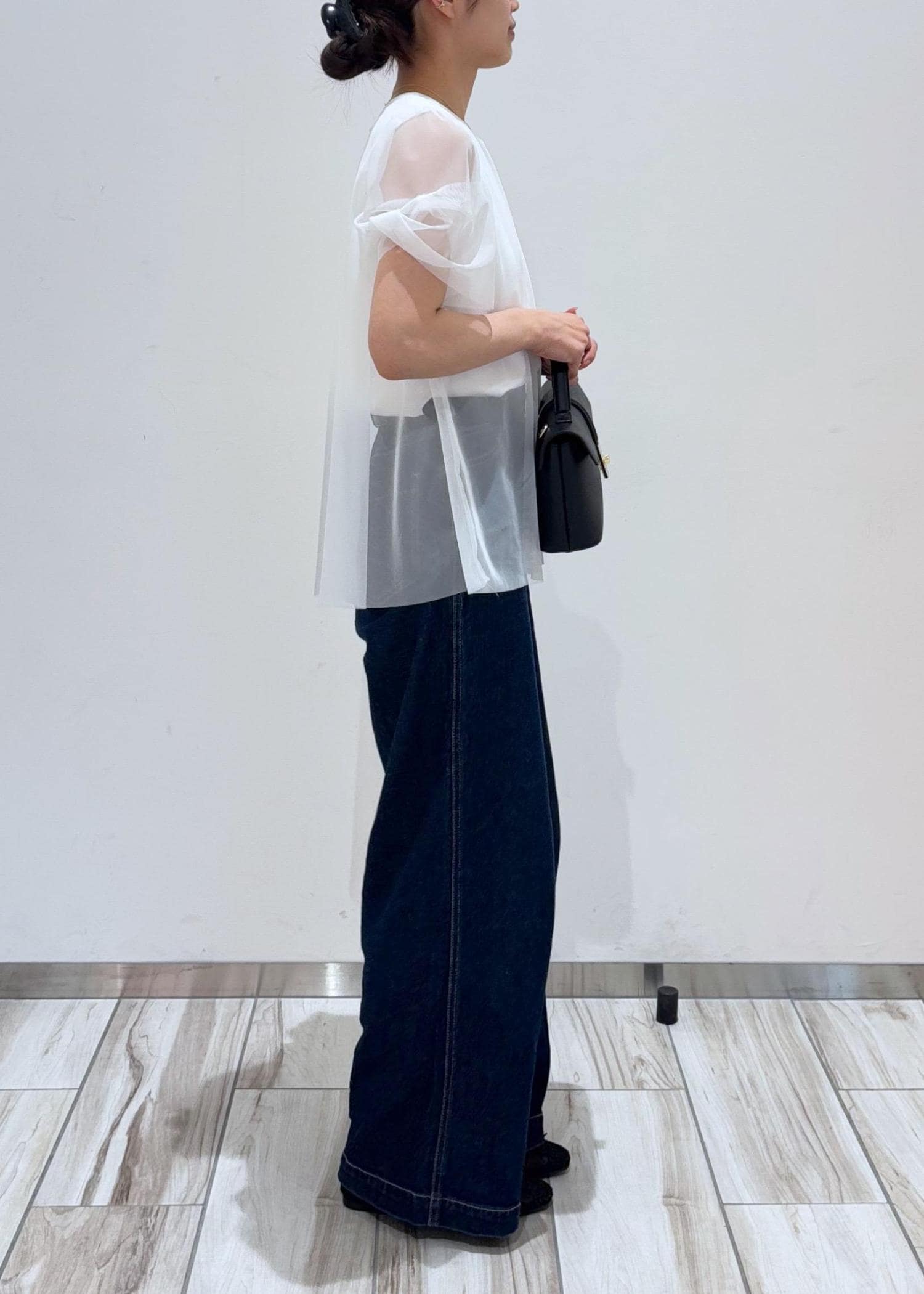 ホワイトのチュールトップスをデニムと合わせることで大人かわいいコーデにしてみました。夏に向けて一枚で着映えするオススメのコーデです♪
