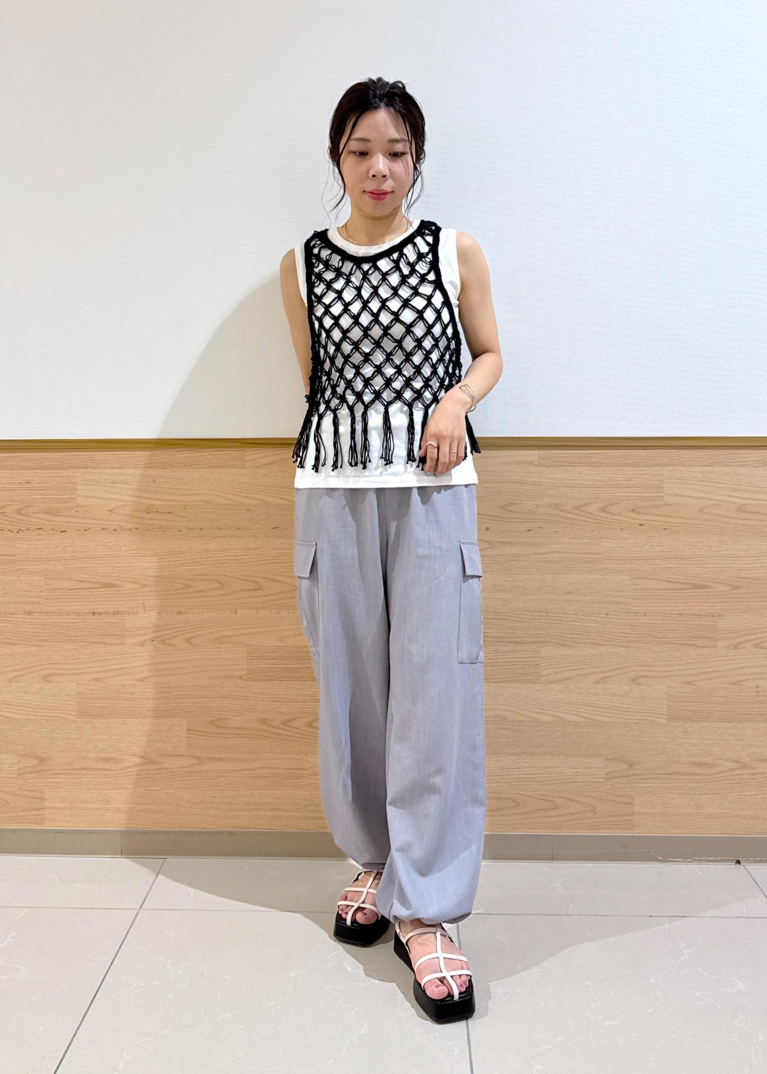 涼しげなアイテムを使っで夏まで着れるおすすめスタイルです。