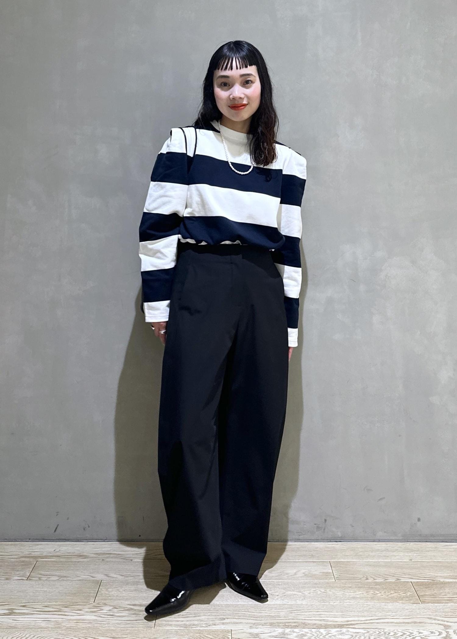 その分、ネックのVゾーンは広めに取っており、着用しているベルテッドパンツと合わせた際のバランスは秀逸です!