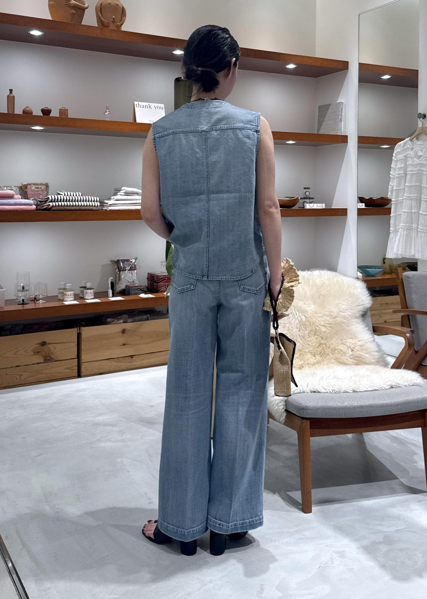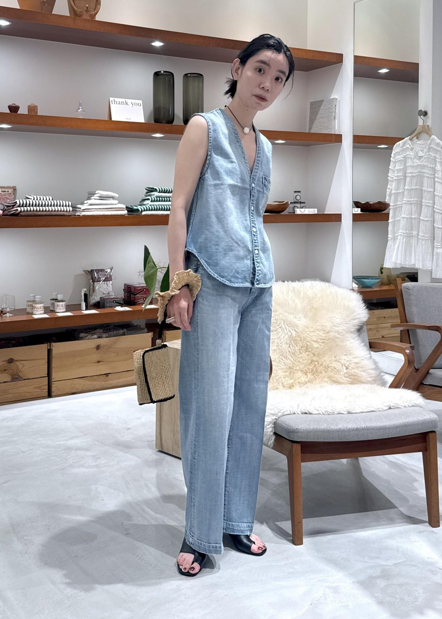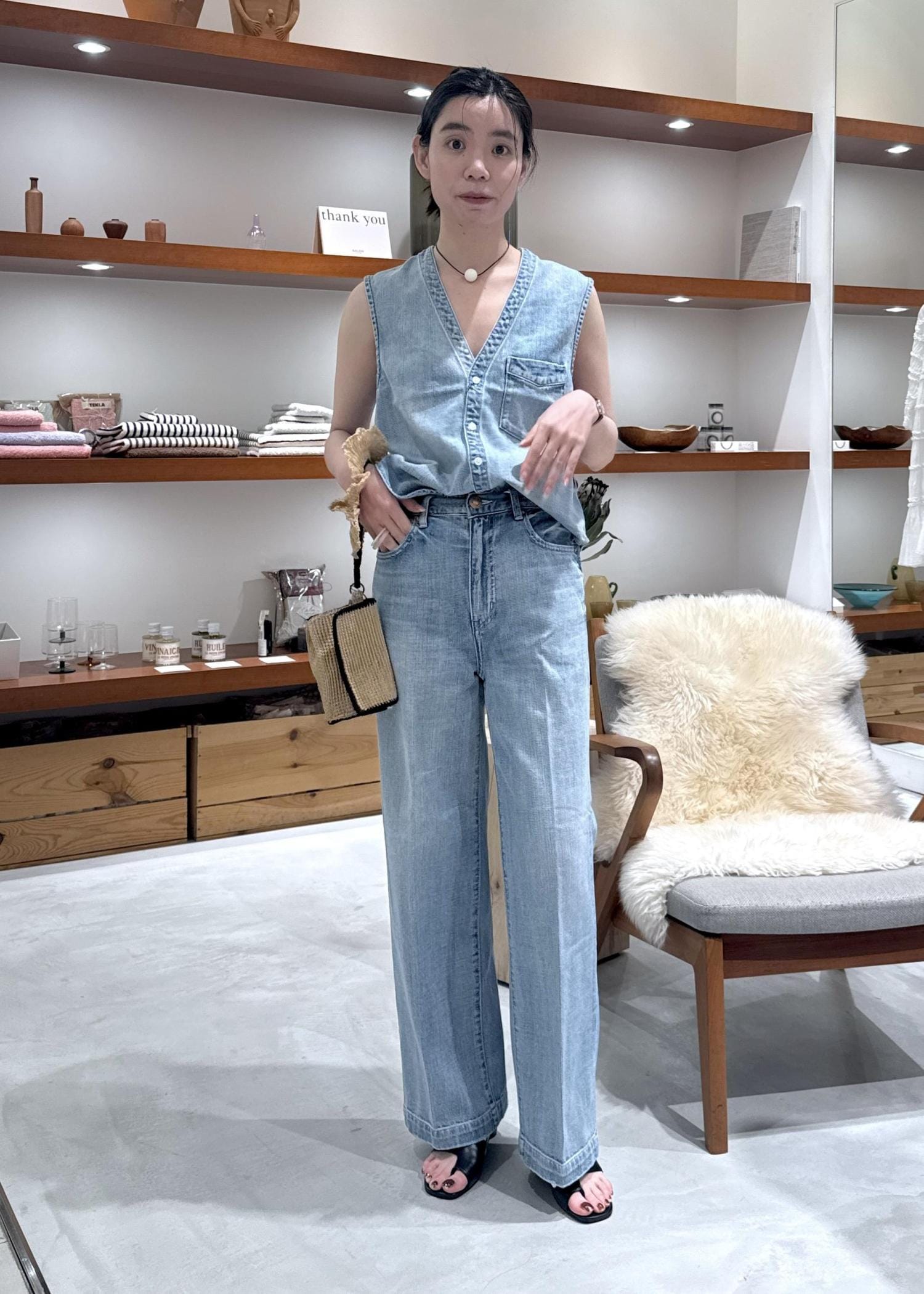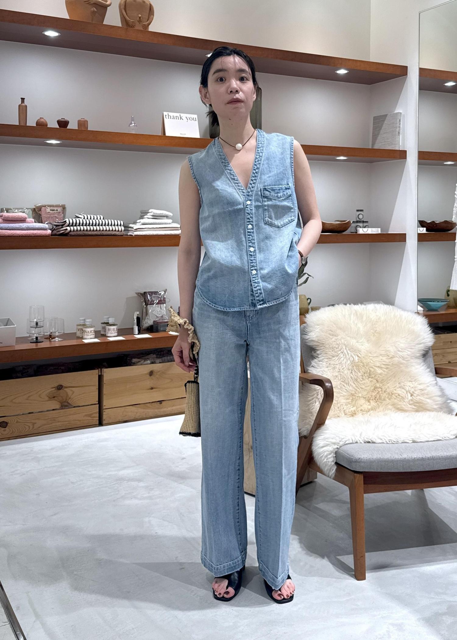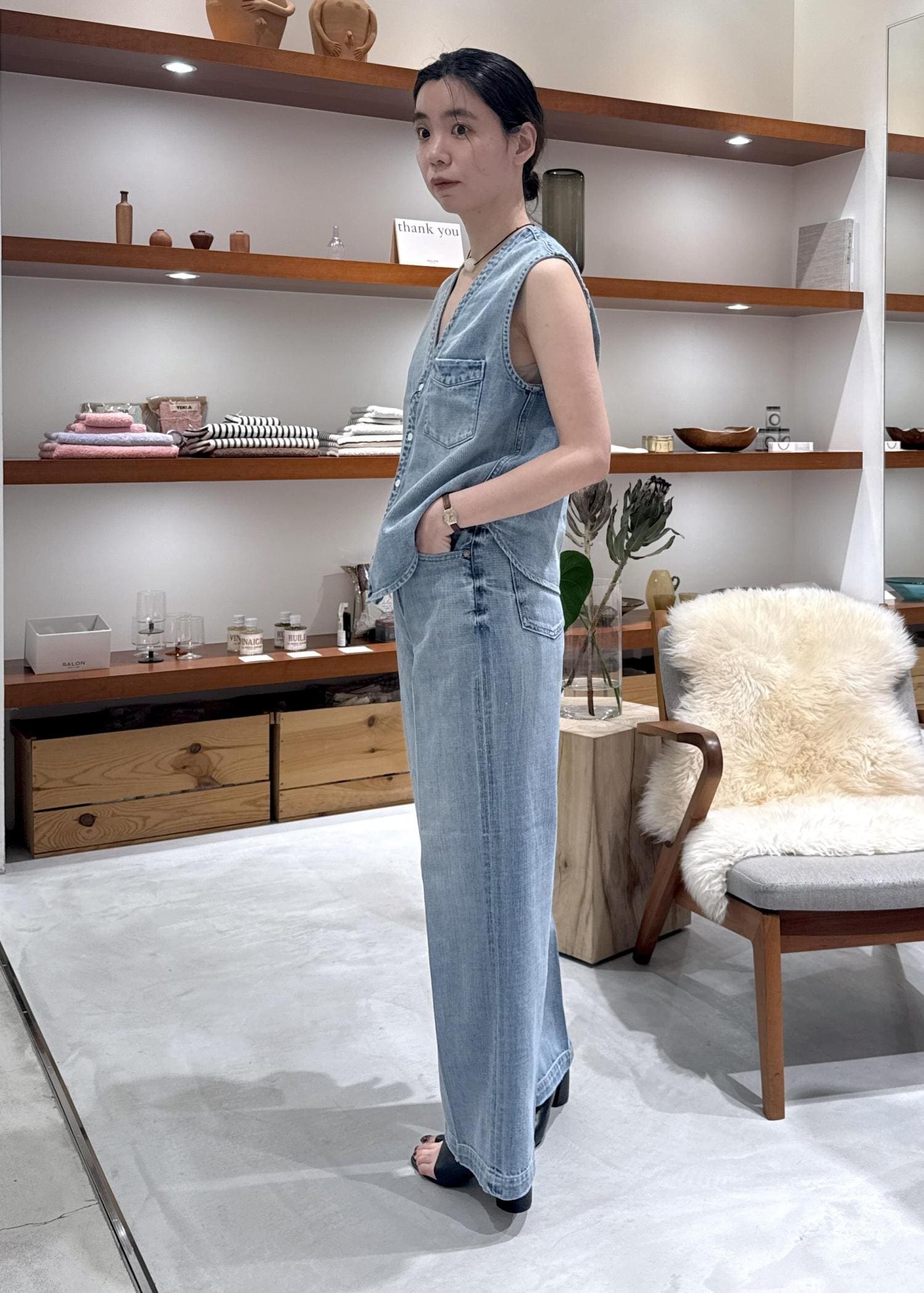 身体のラインを拾わないストレートシルエットですが、ウエストからヒップにかけてはコンパクト美脚に見える!と大人気のスローガンサイドゴムでさらに楽ちん、