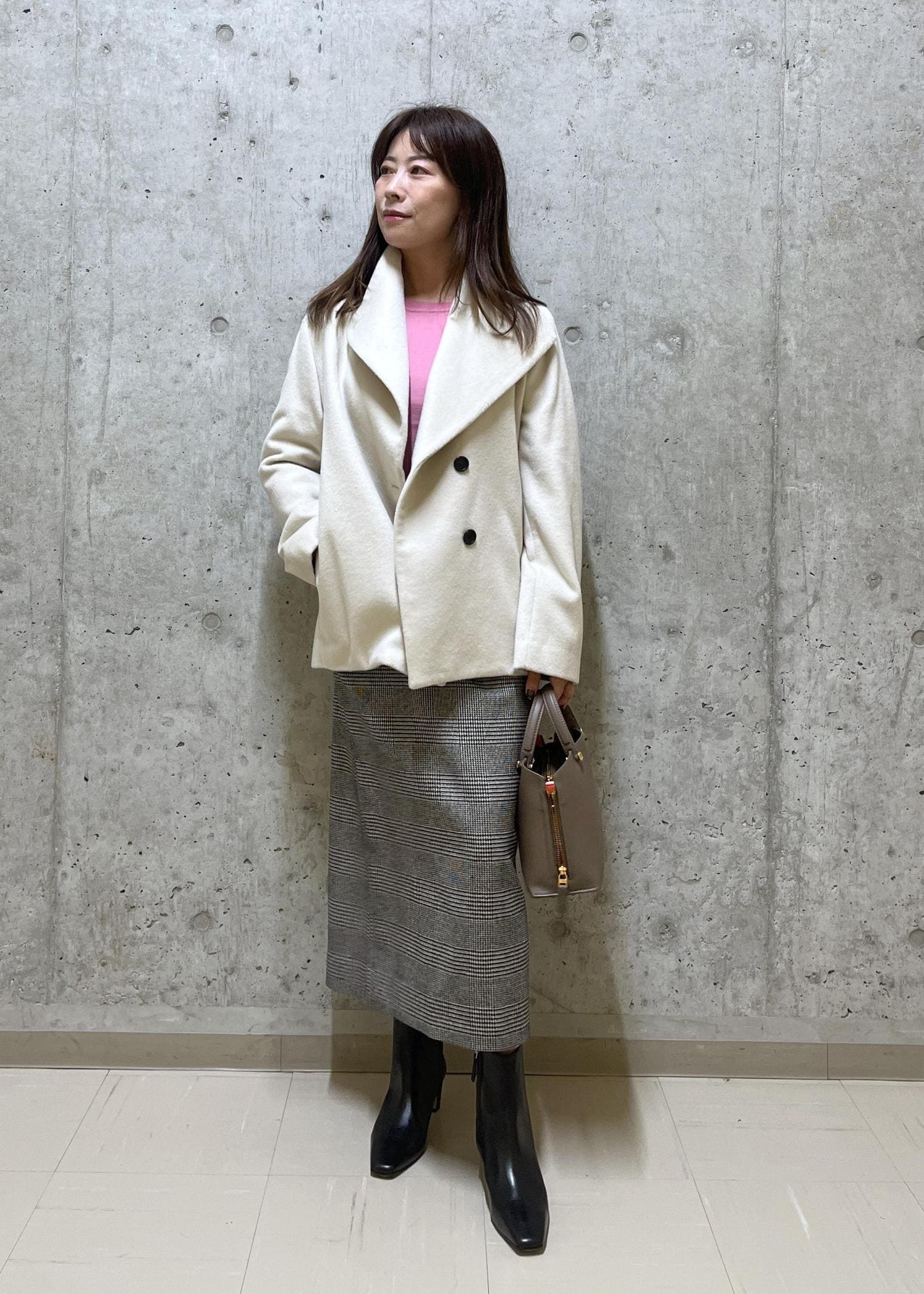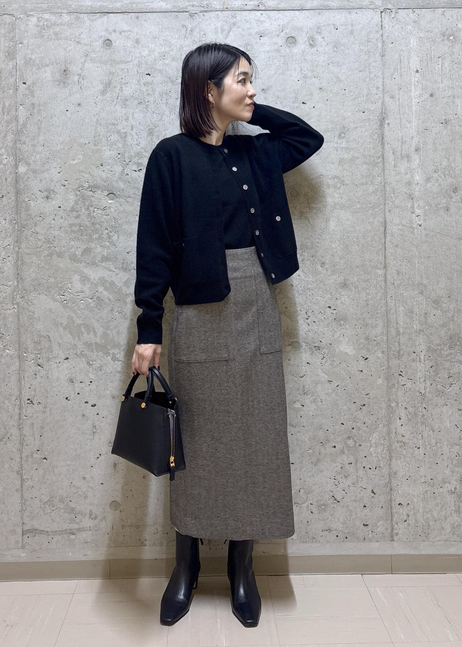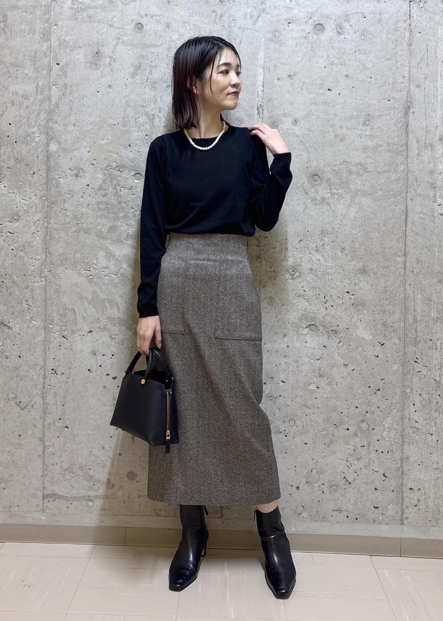 着丈はヒップにかかる長さで、トップスインでもアウトスタイルでも決まる1枚です。トップスインをした際も腰回りがもたつきなく着用することが出来ました。