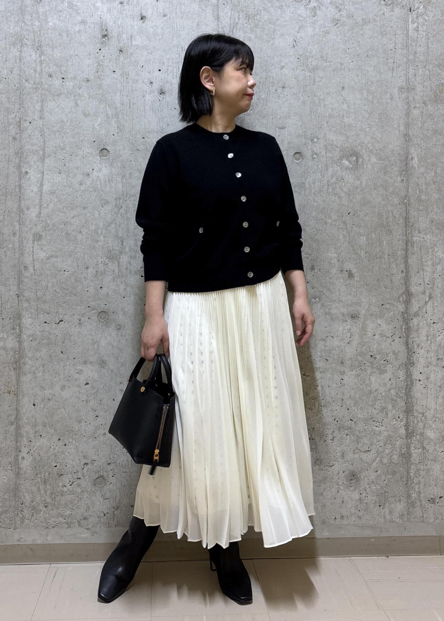 ギャザーたっぷりのブラウスにワイドパンツを合わせたブラックコーデ。