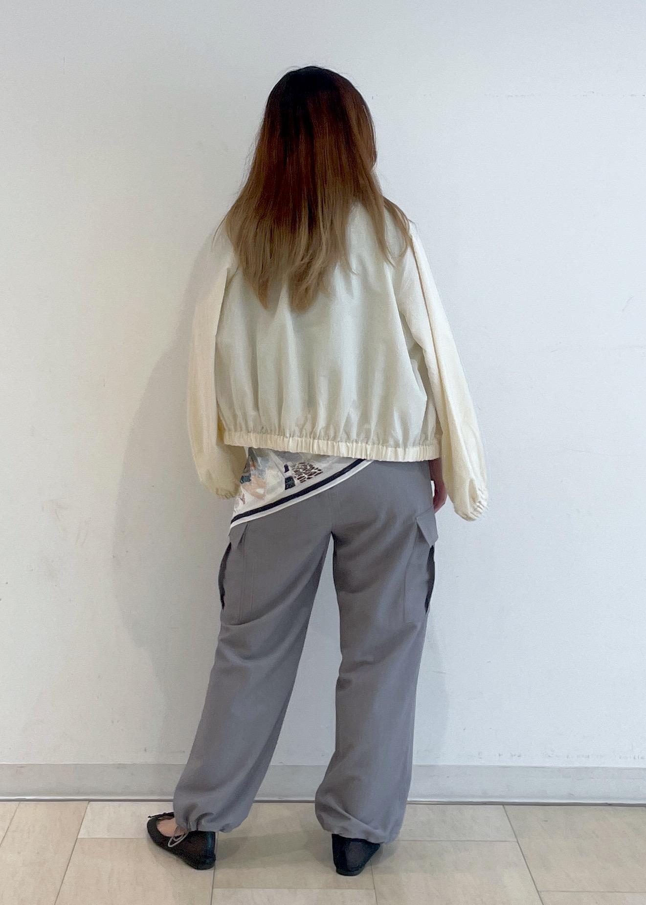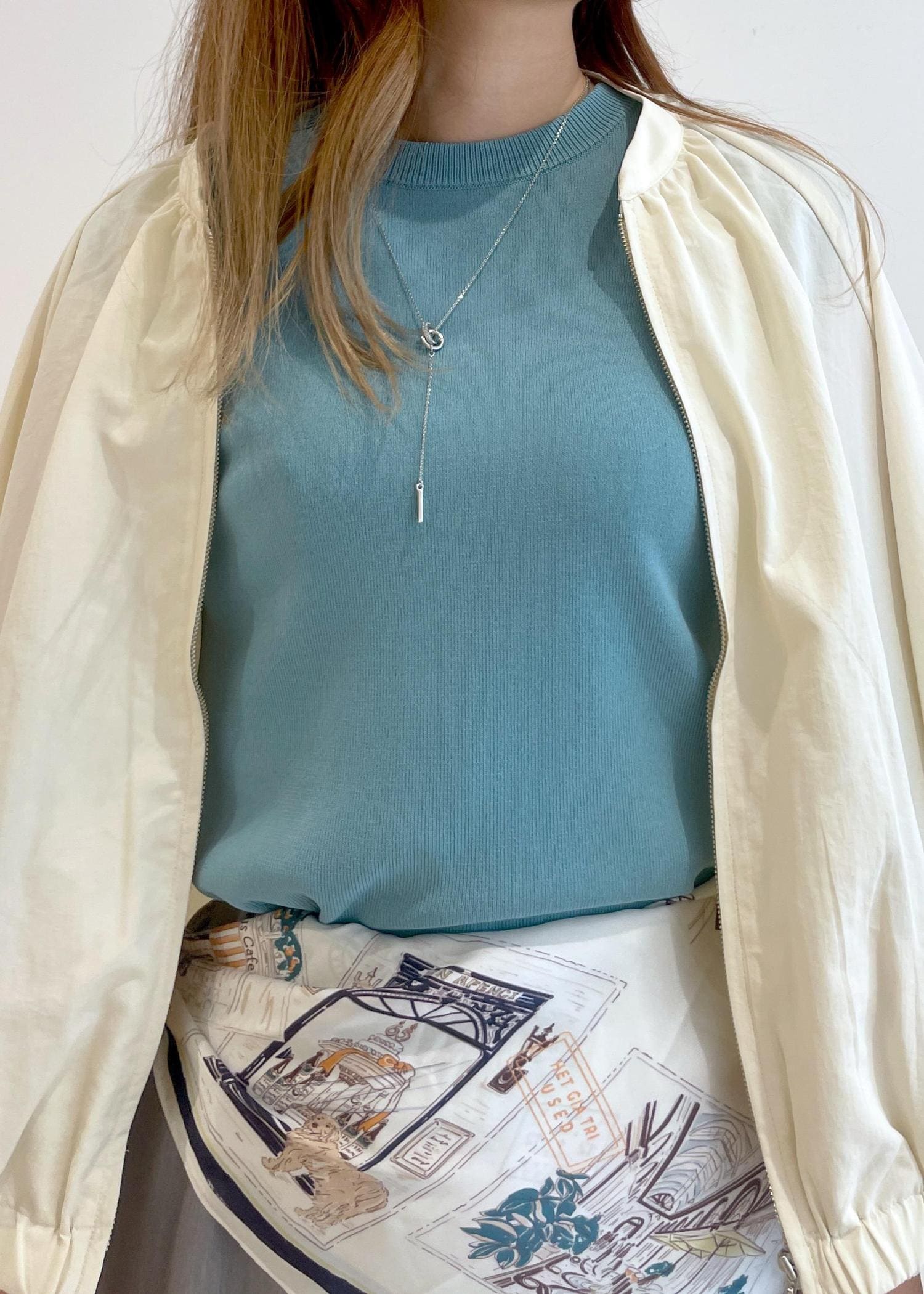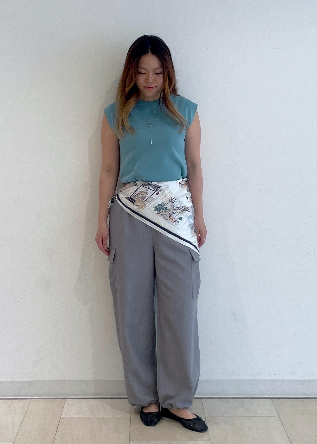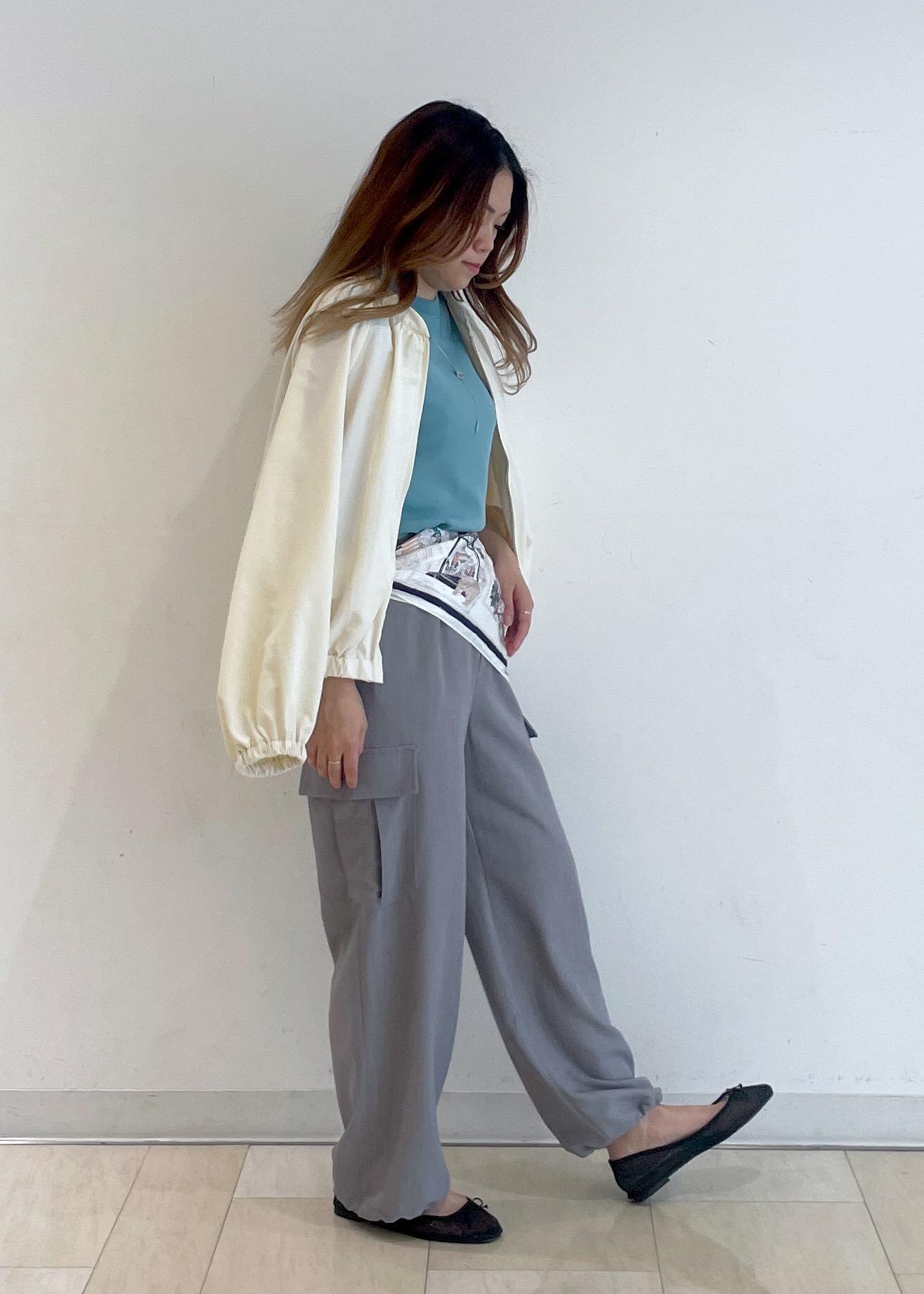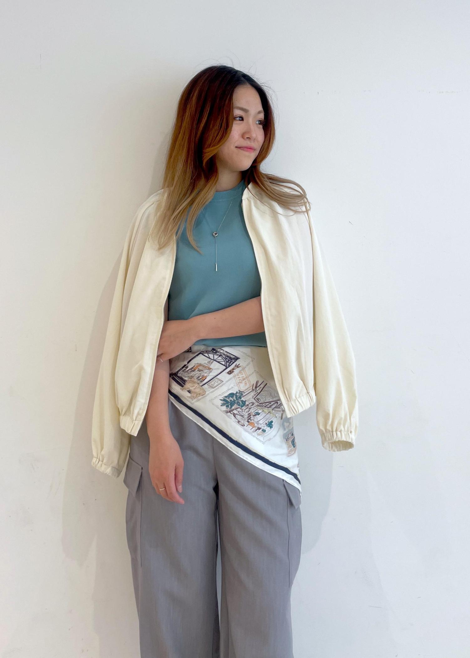 二の腕隠したい派なのでブルゾンを肩掛けして隠しつつ、涼し気な印象にしました!