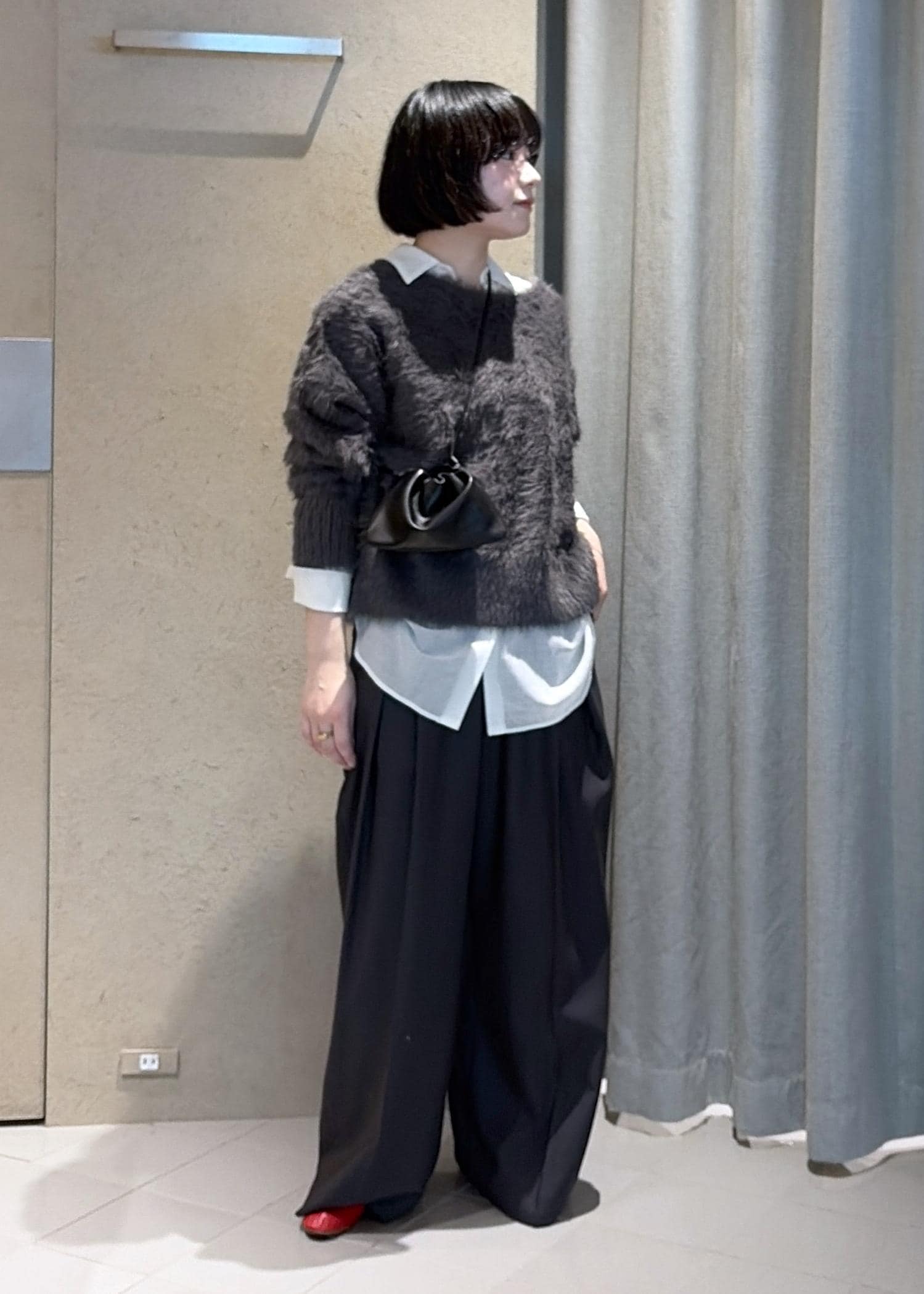 身幅はゆったりめですが、生地がかなり薄いので身体に沿って落ち感がありすっきりまとまります。