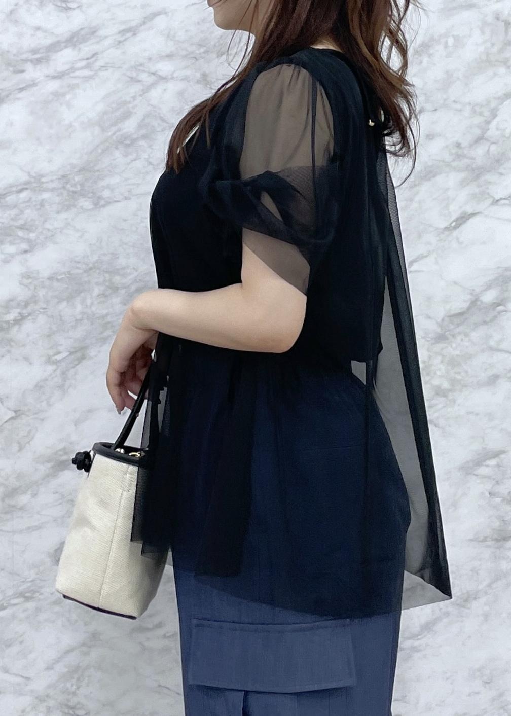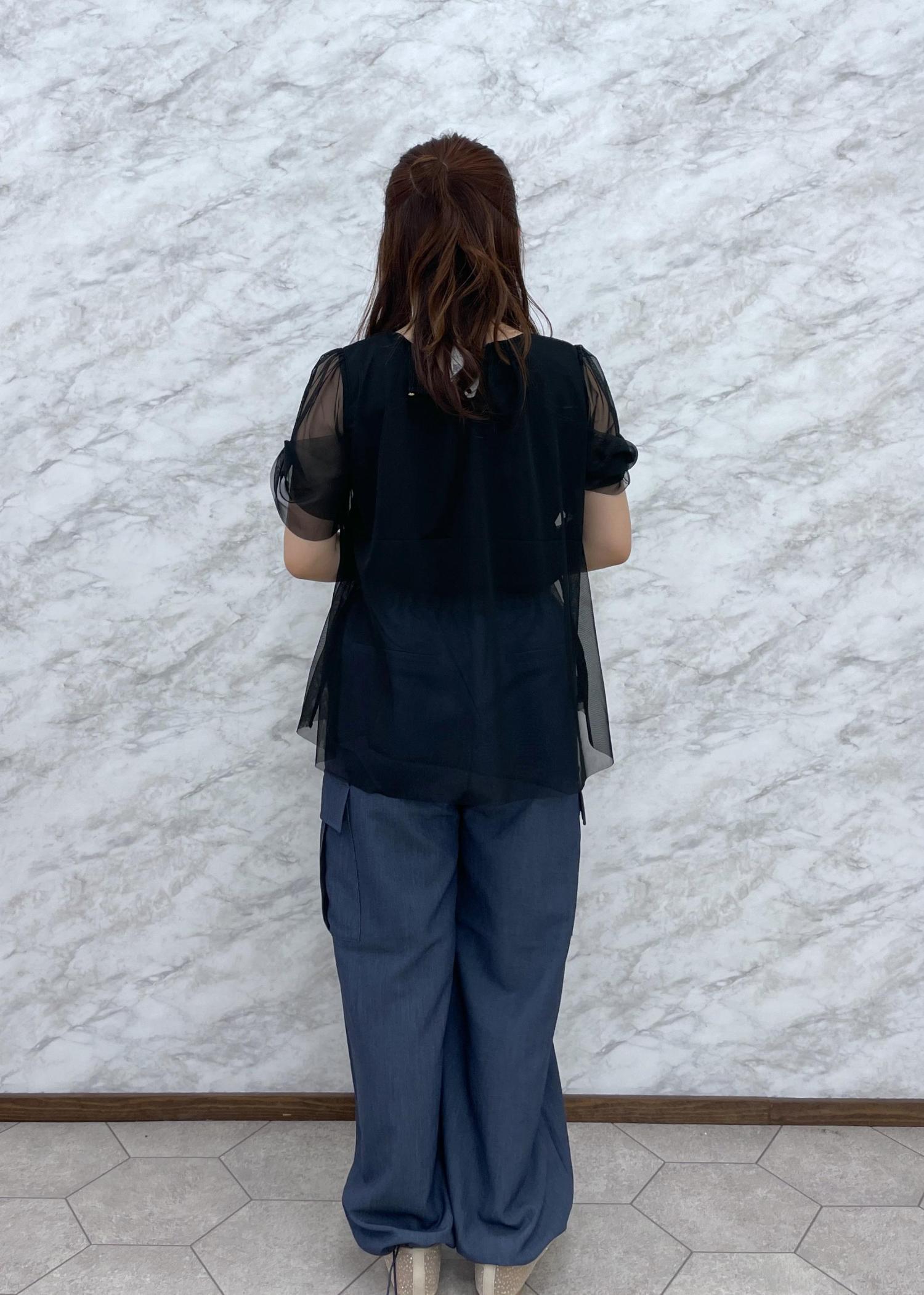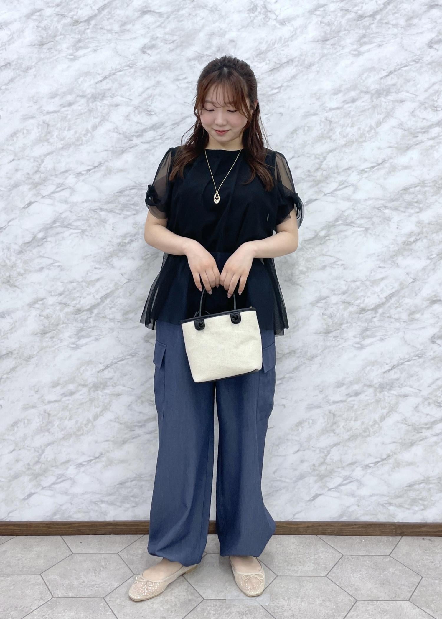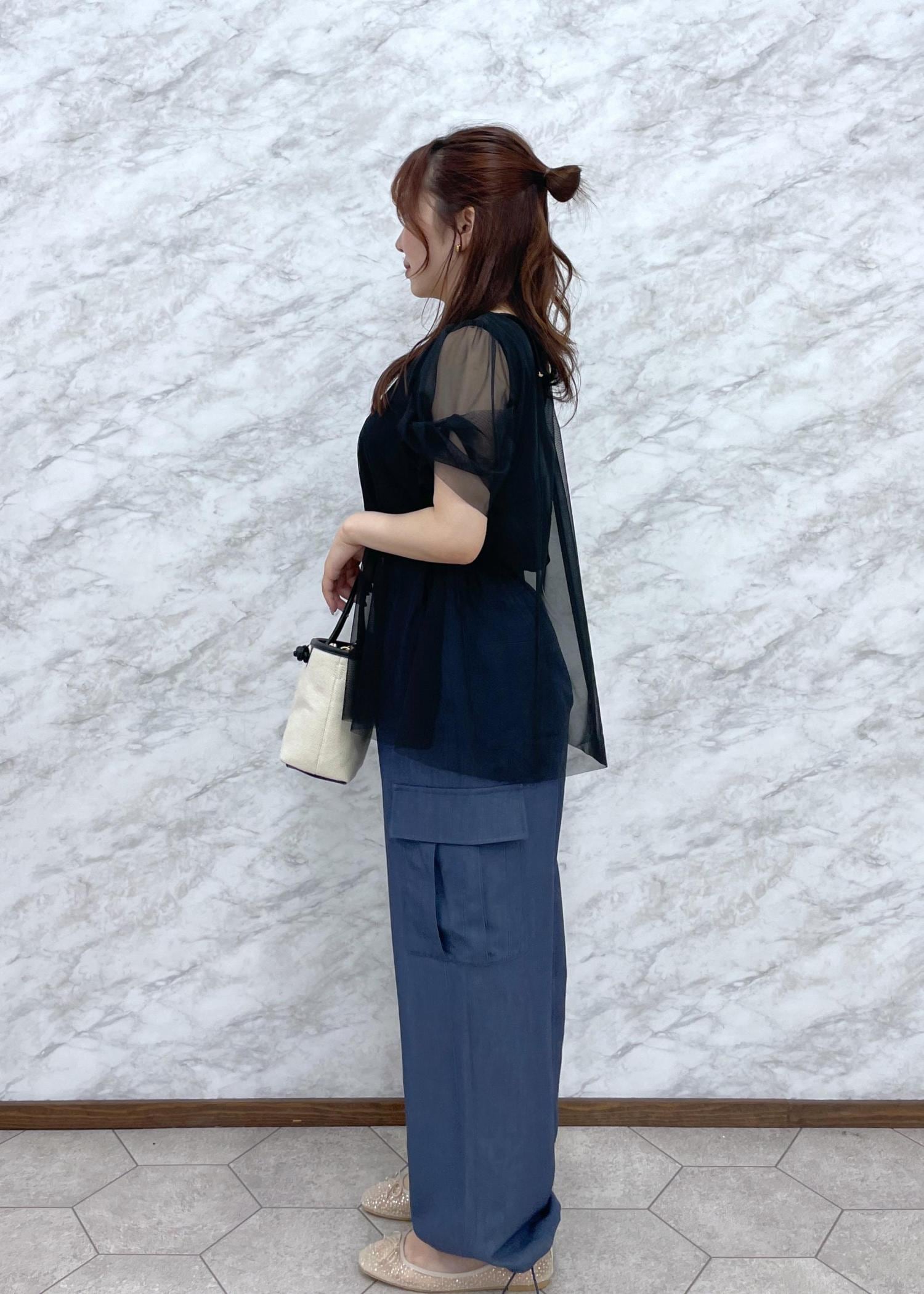 可愛いチュールトップスとカーゴパンツを使ってきれいめなコーデにしました!チュールトップスは程良く肌見せできるので、露出が苦手な方も可愛く着ていただけます!カーゴパンツを合わせて綺麗めだけどラフに♪