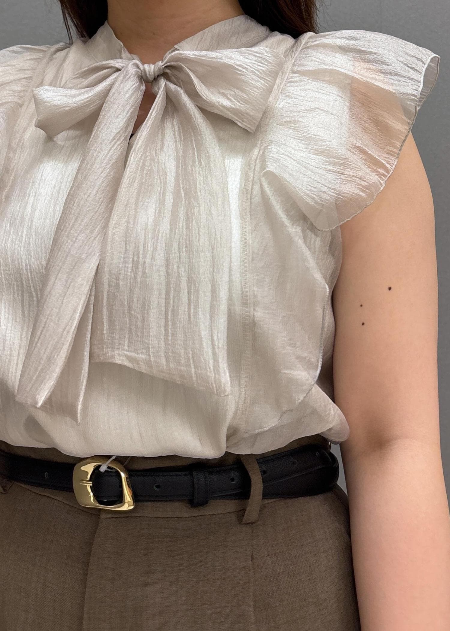 VIS【店頭人気】主役級!華やぎシアーシャイニーボウタイフリルブラウス【前後2WAY】【洗える】ベージュ / F¥5,489レビュー160㎝だと腰にかかる着丈でした!裏地がついているのでインナーの透け感は気になりにくいです!肩まわりの大きめフリルが気になる二の腕をカバーしてくれるのも嬉しいポイント◎