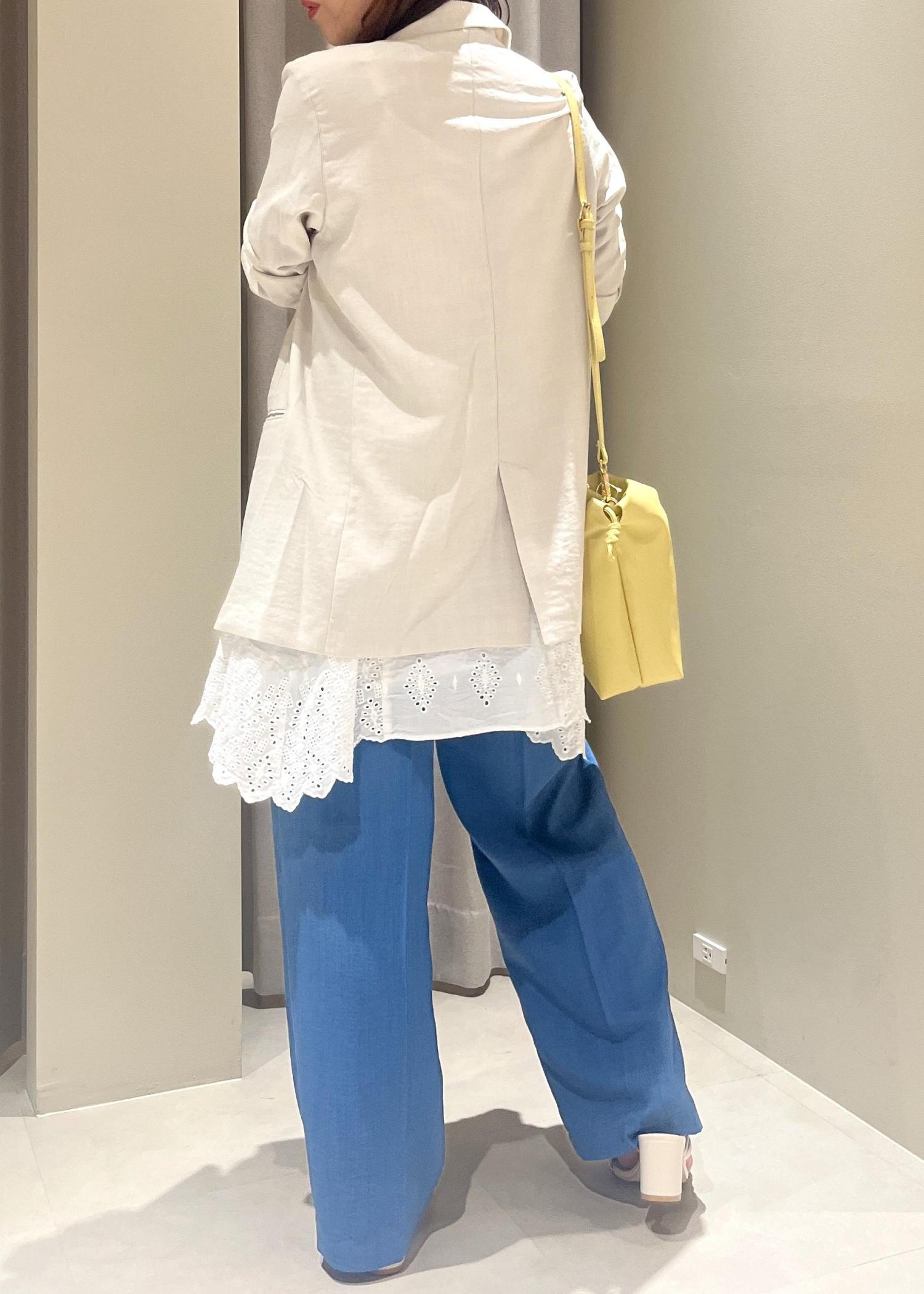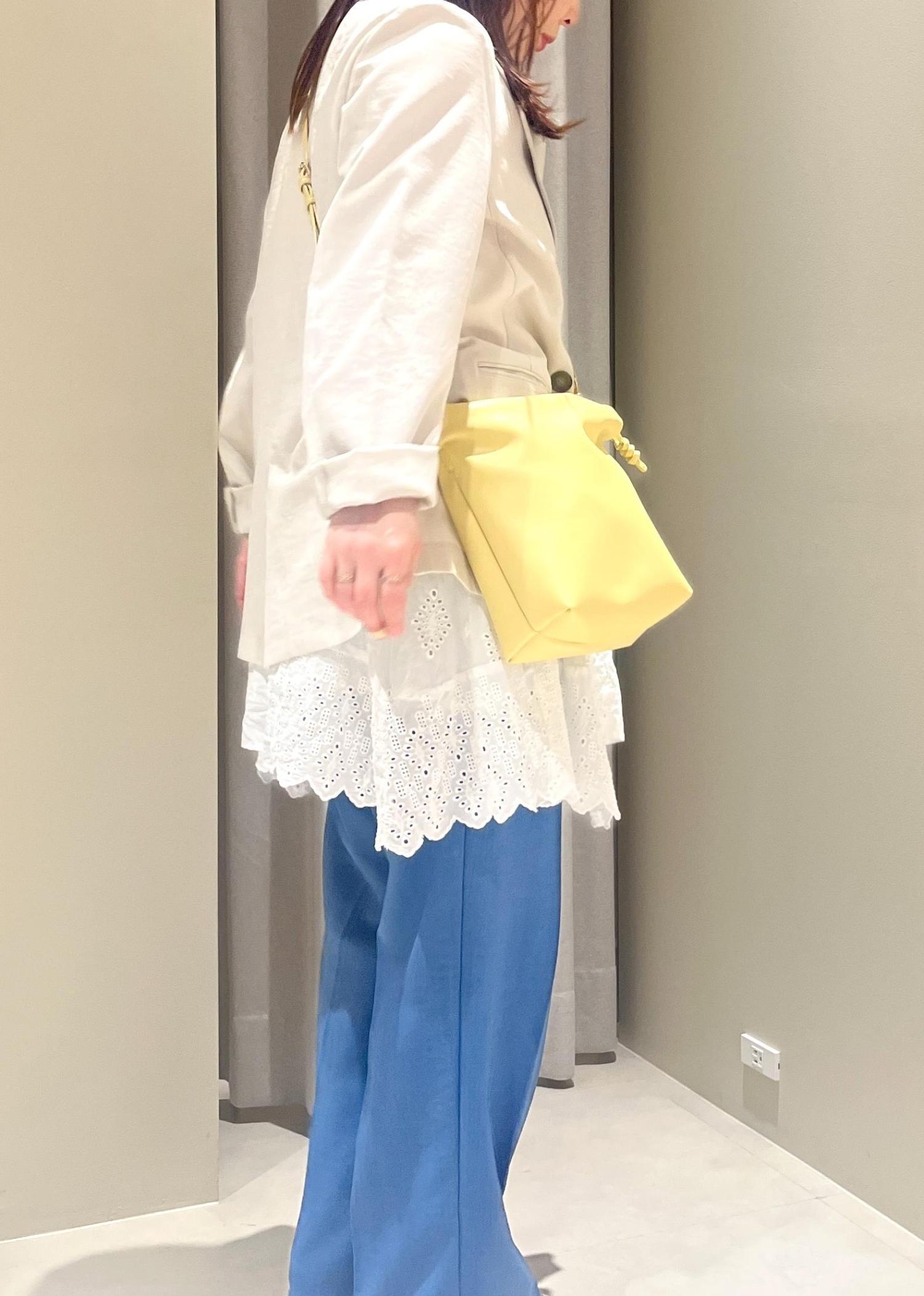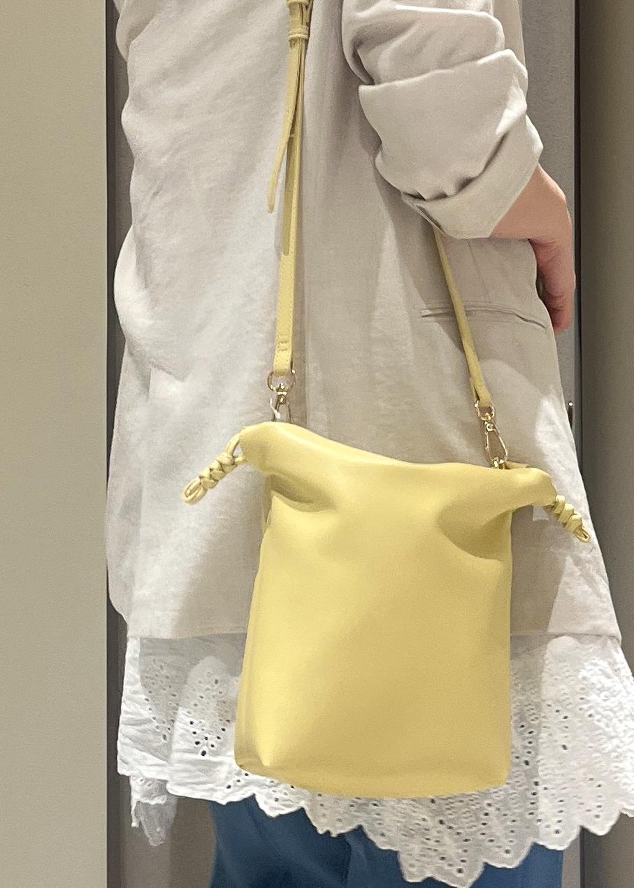 手首にきんちゃくの持ち手を掛けて持つとスタイリングのこなれ感がアップします。 -