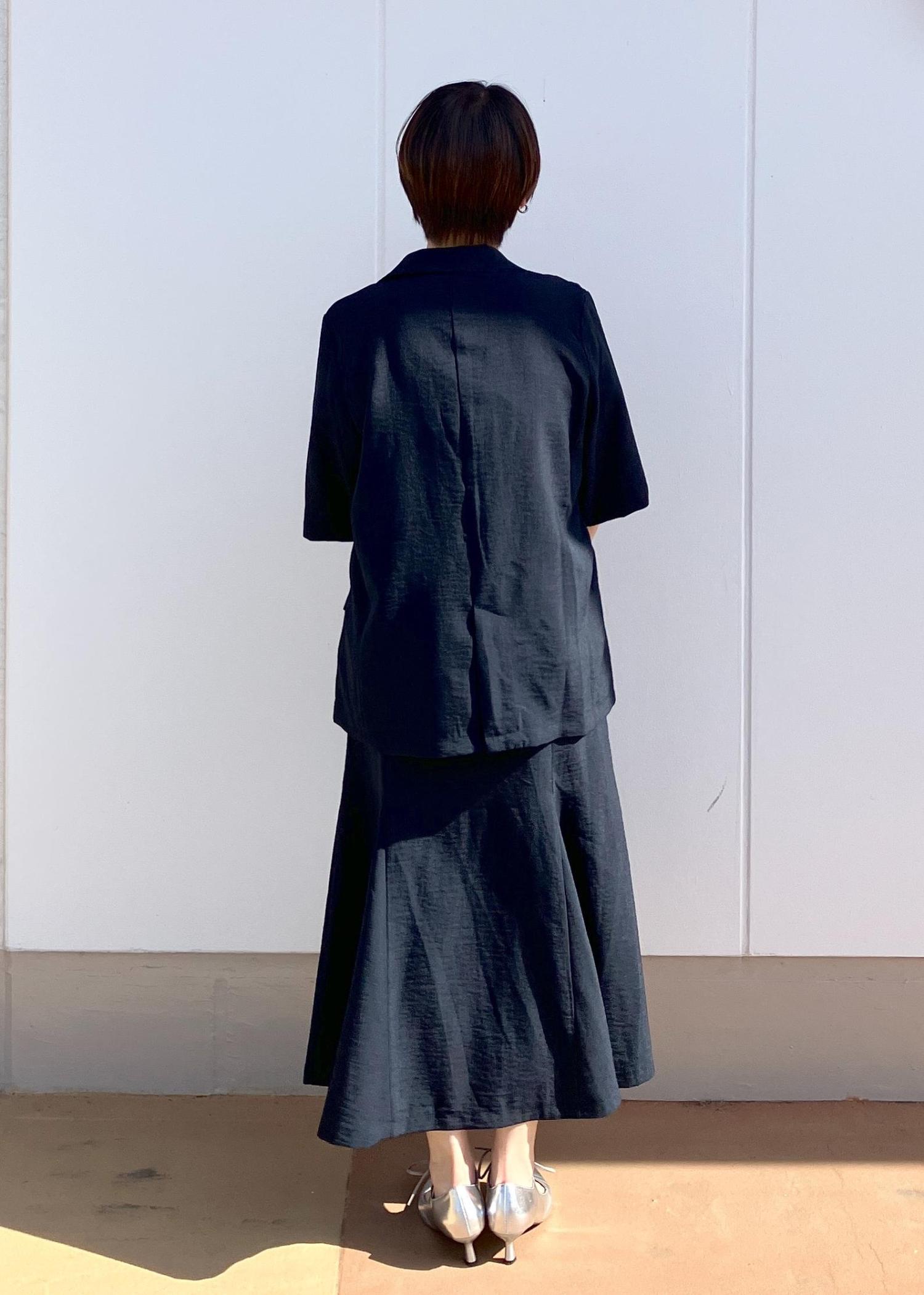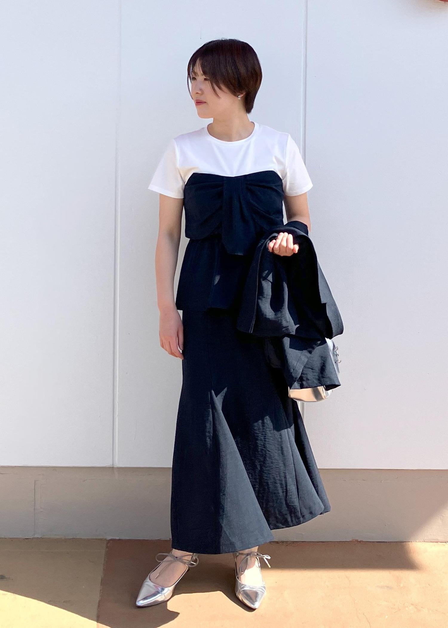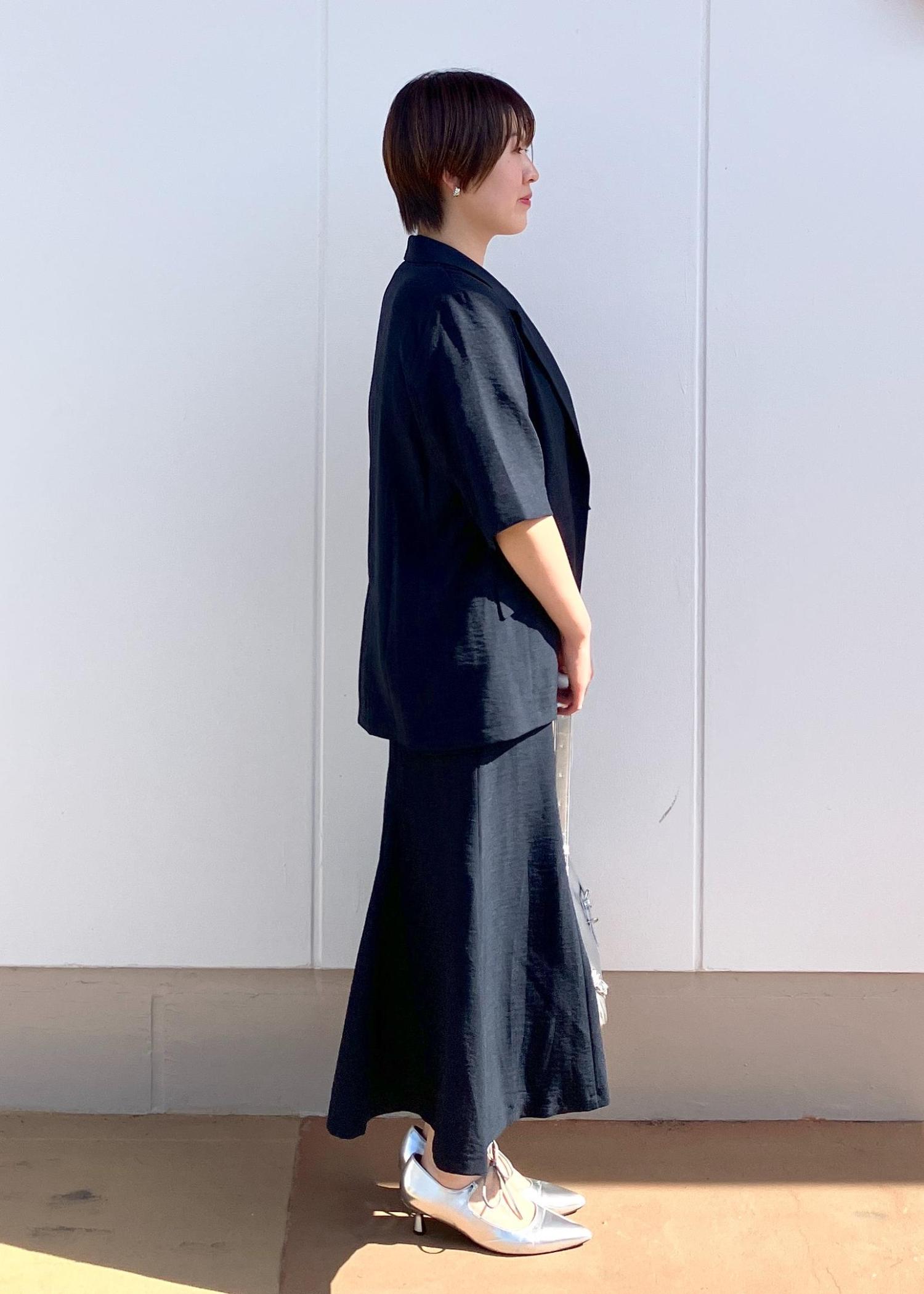 美easyシリーズに新色でネイビーが仲間入り!ジャケットは半袖になって登場しました!フロントリボンのプルオーバーとマーメイドスカートでセットアップで着用してみました!お仕事にもおすすめ!忙しくなりがちな朝にも時短が叶うコーディネートです!