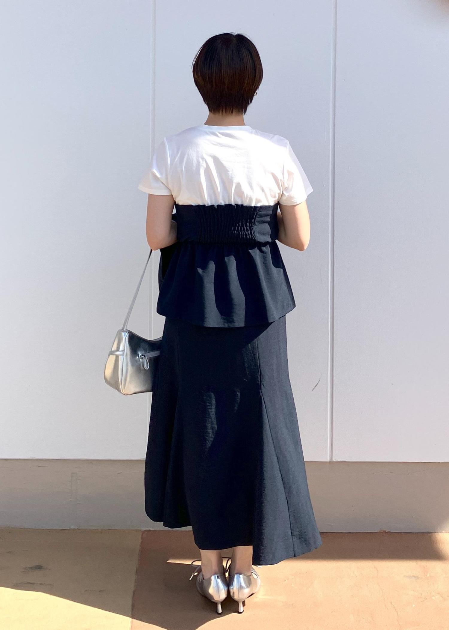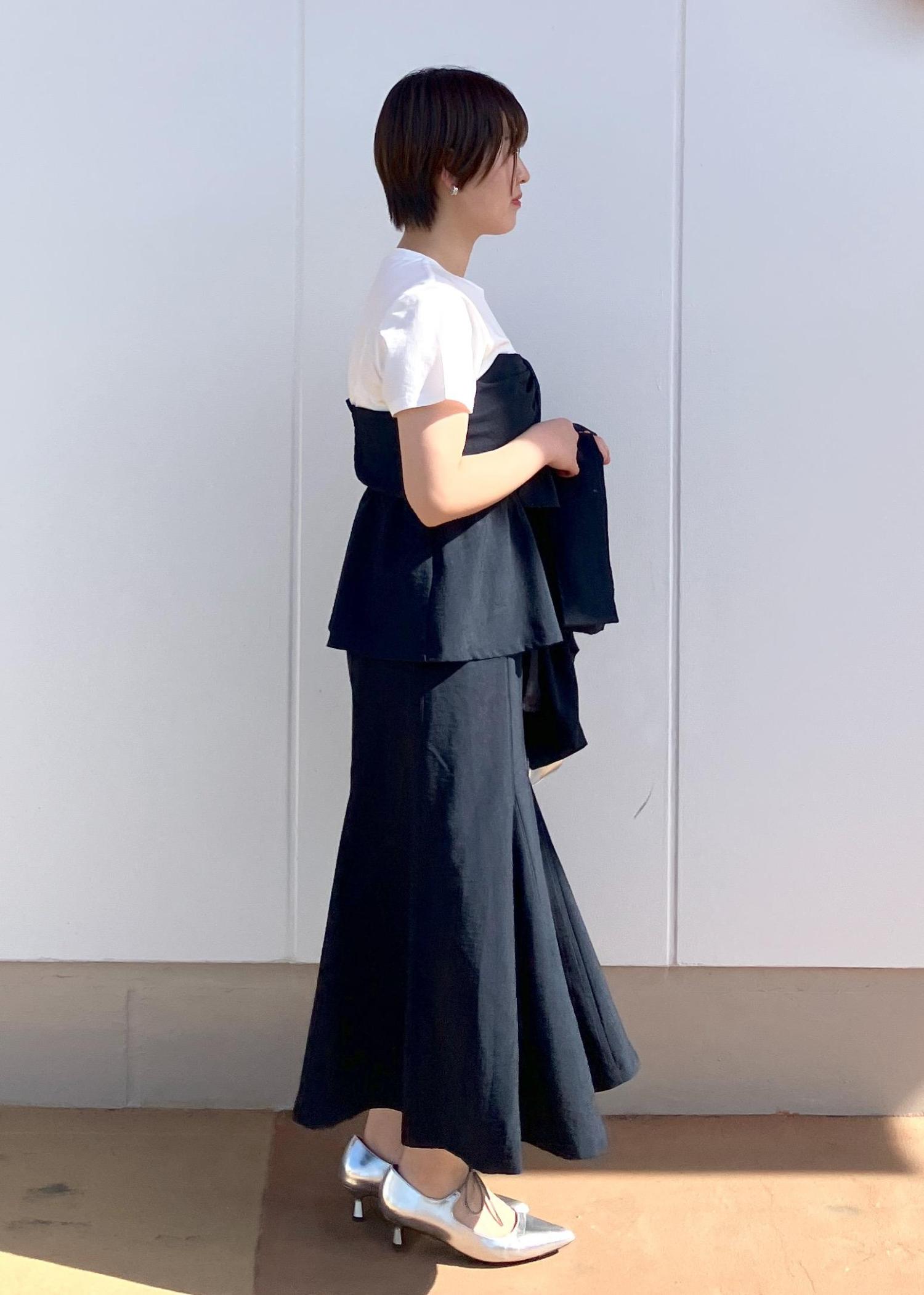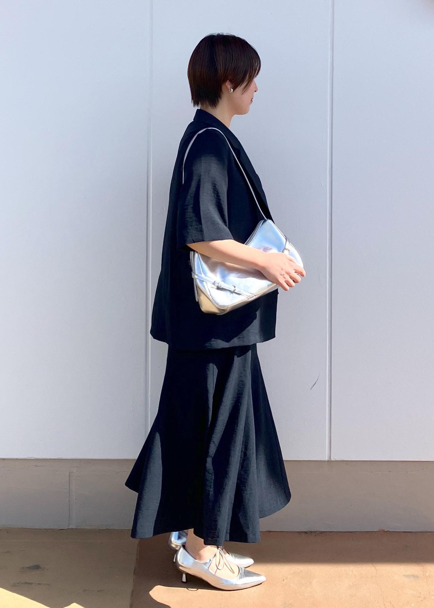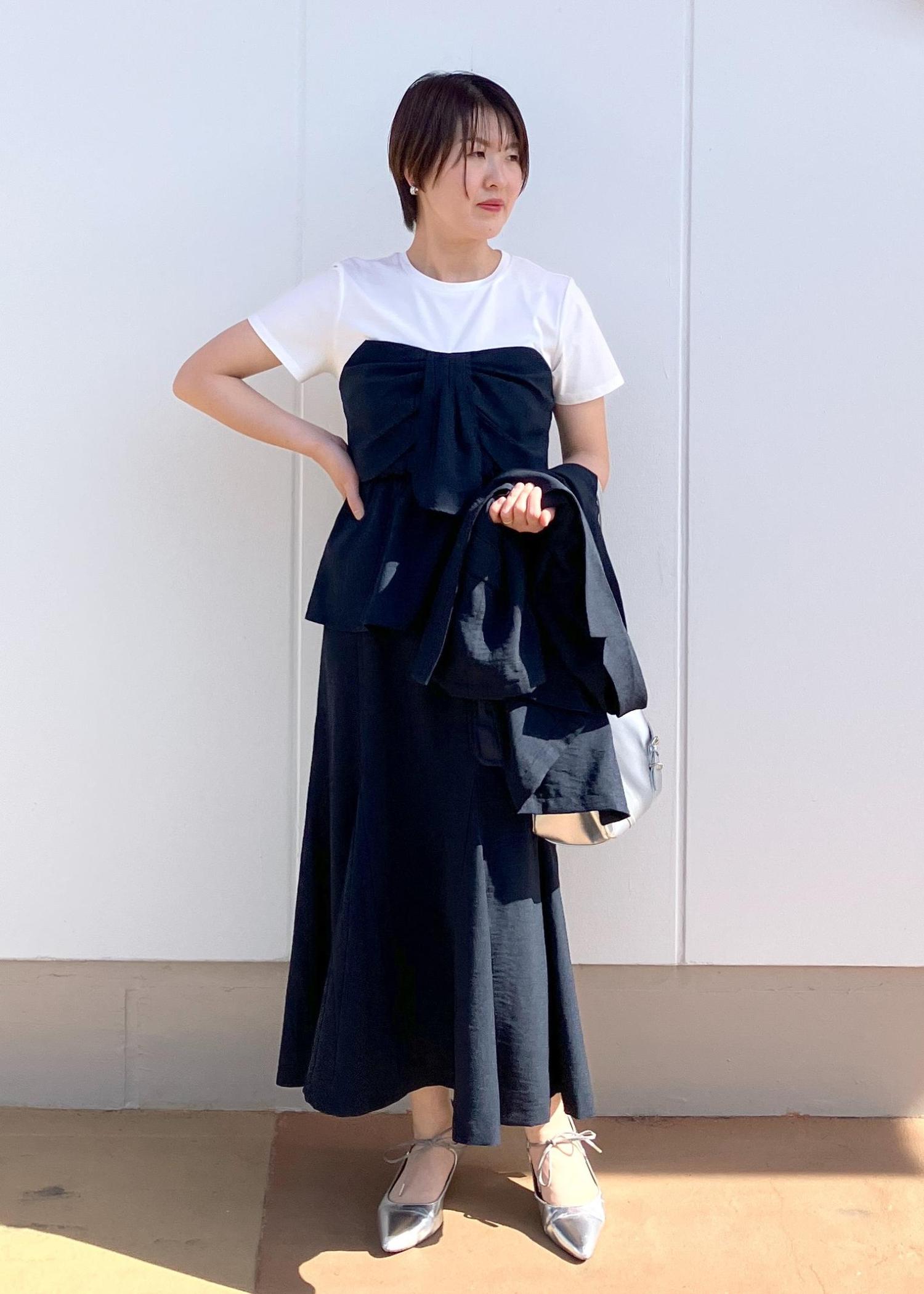美easyシリーズに新色でネイビーが仲間入り!ジャケットは半袖になって登場しました!フロントリボンのプルオーバーとマーメイドスカートでセットアップで着用してみました!お仕事にもおすすめ!忙しくなりがちな朝にも時短が叶うコーディネートです!