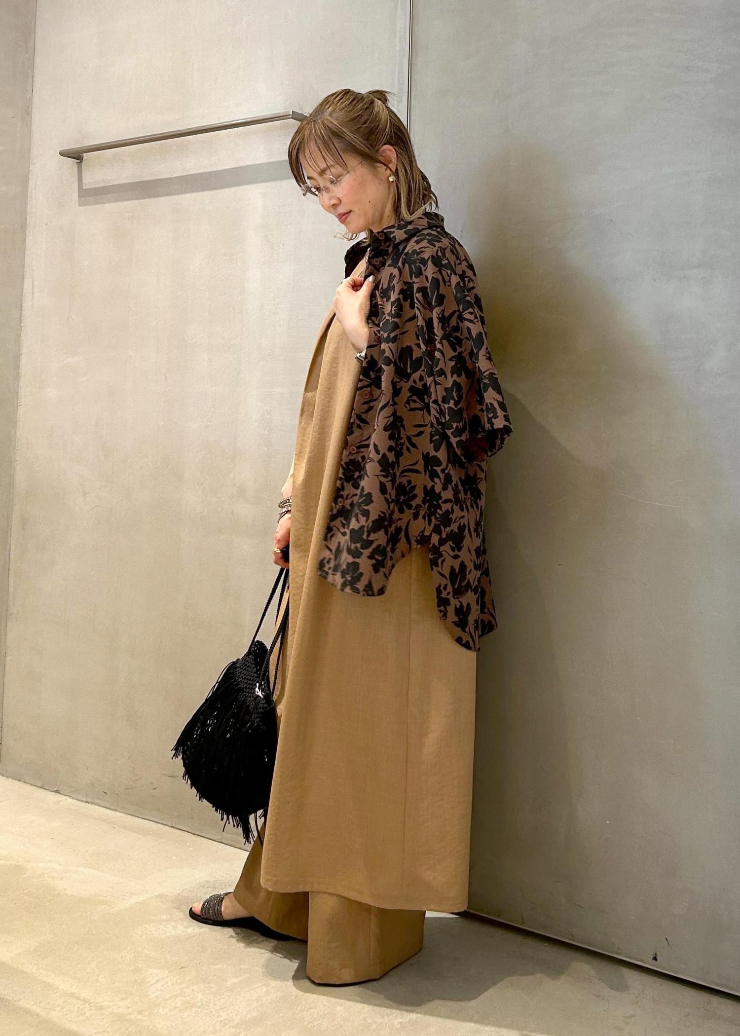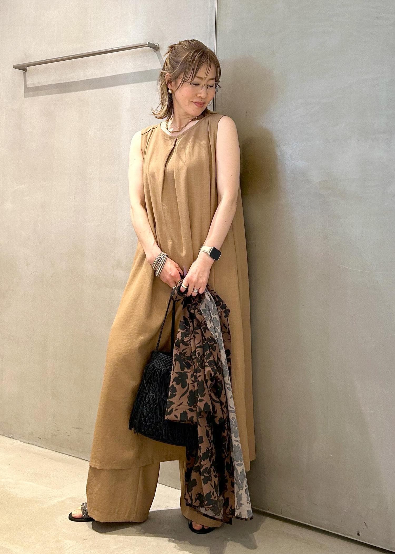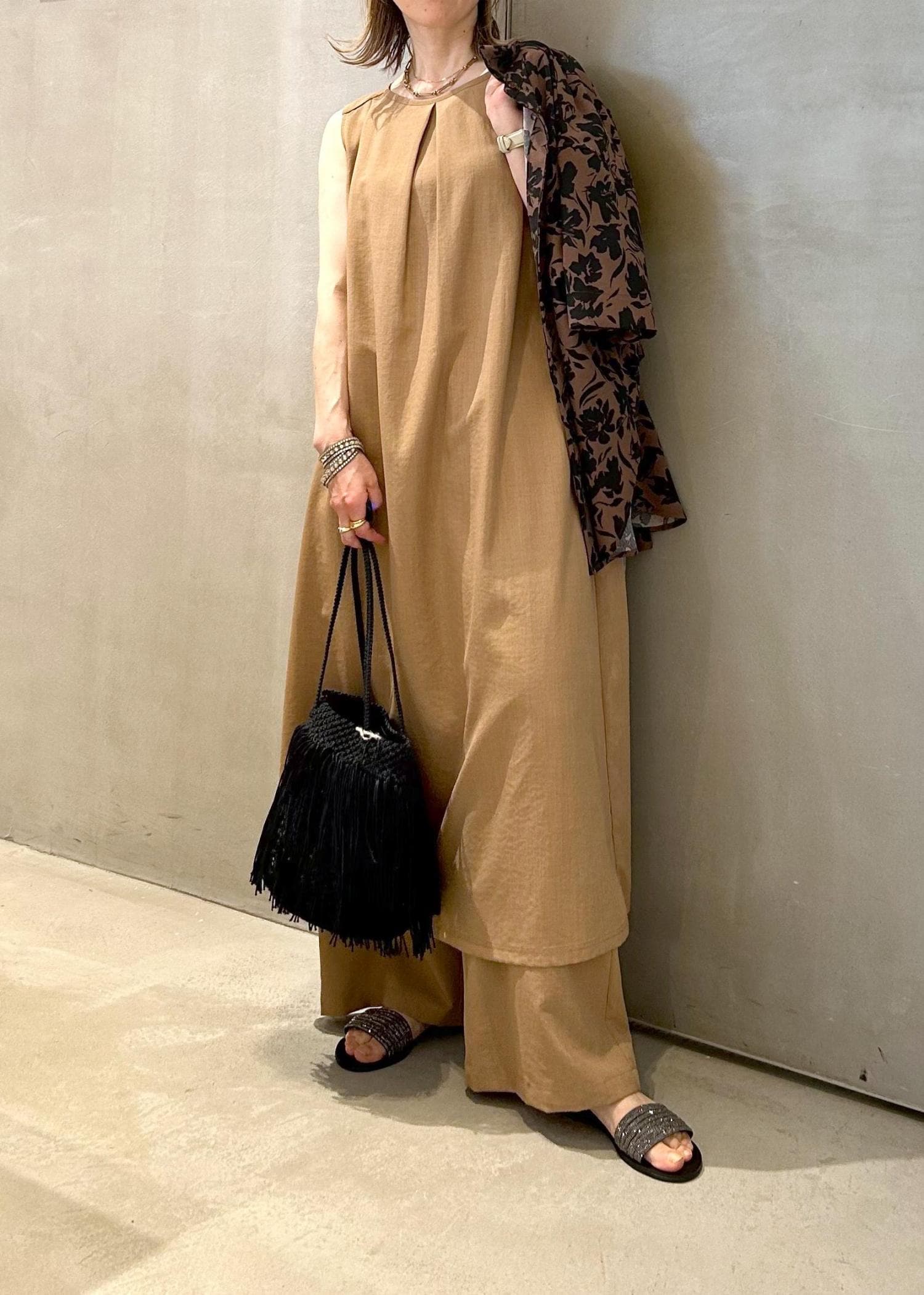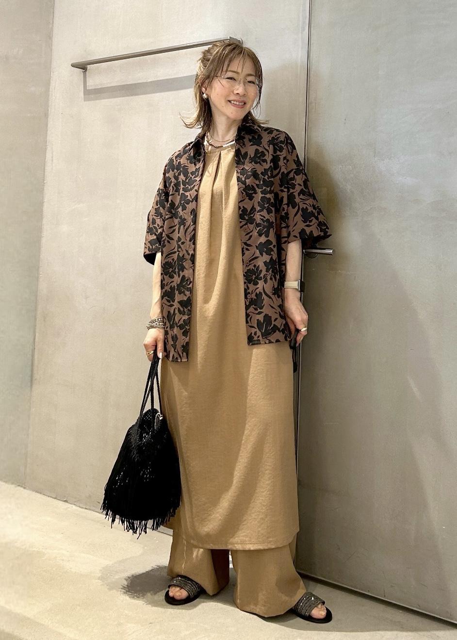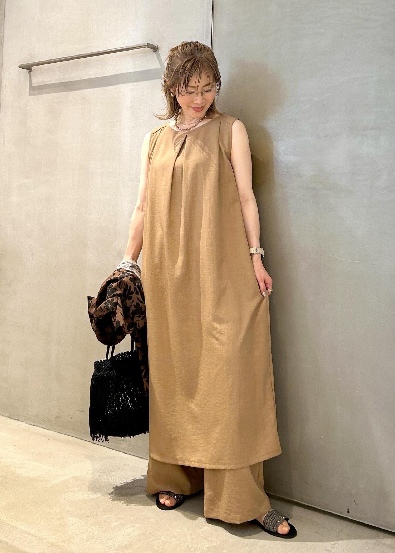 サラッとしたワンピースに同素材のワイドパンツをインして、夏の大人ワンピースコーデにしました。