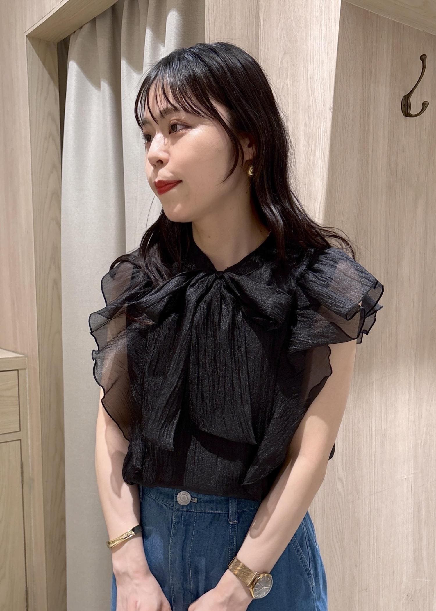 VIS【店頭人気】主役級!華やぎシアーシャイニーボウタイフリルブラウス【前後2WAY】【洗える】ブラック / F¥5,489レビューふんわり軽い素材感で、1枚で華やかに見せてくれるブラウスです。(柔らかいのでコンパクトなカーディガン等と合わせてもごわごわしにくいです☺︎)