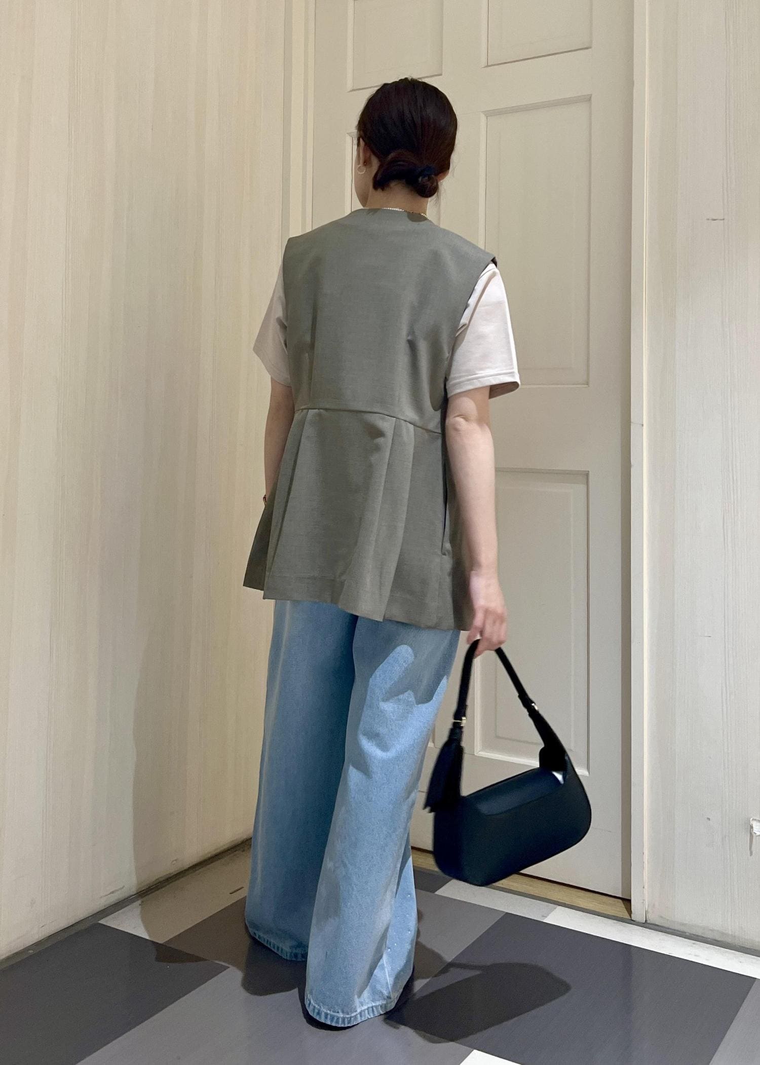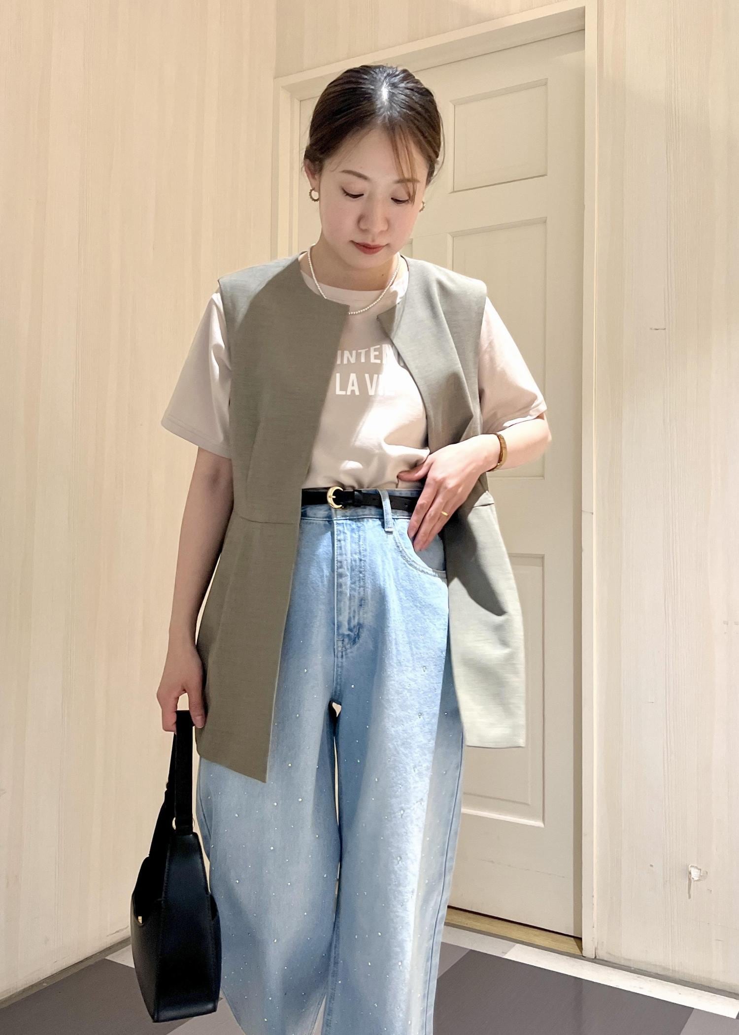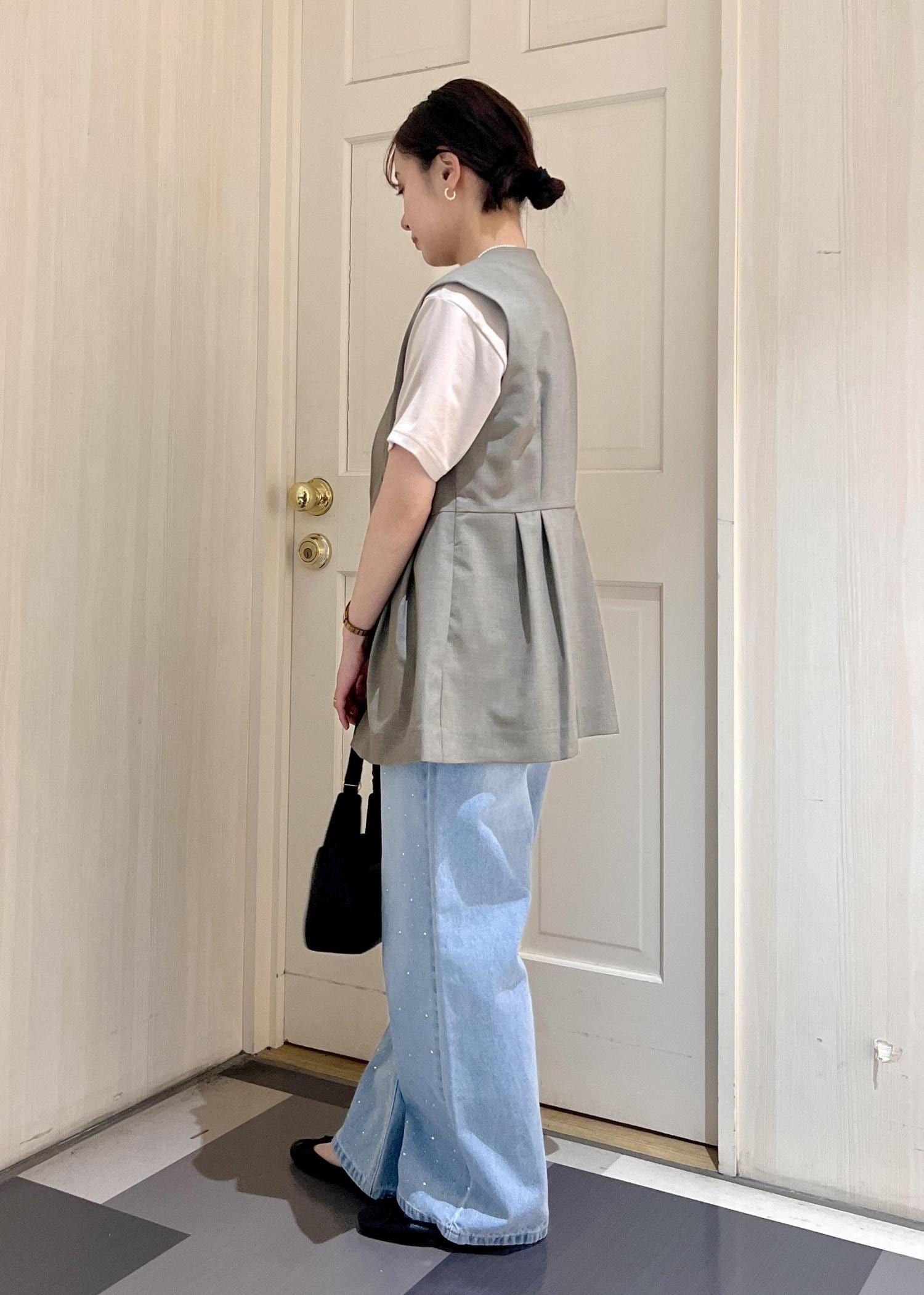 きれいめな印象のペプラムベストに、Tシャツとデニムでカジュアルに。