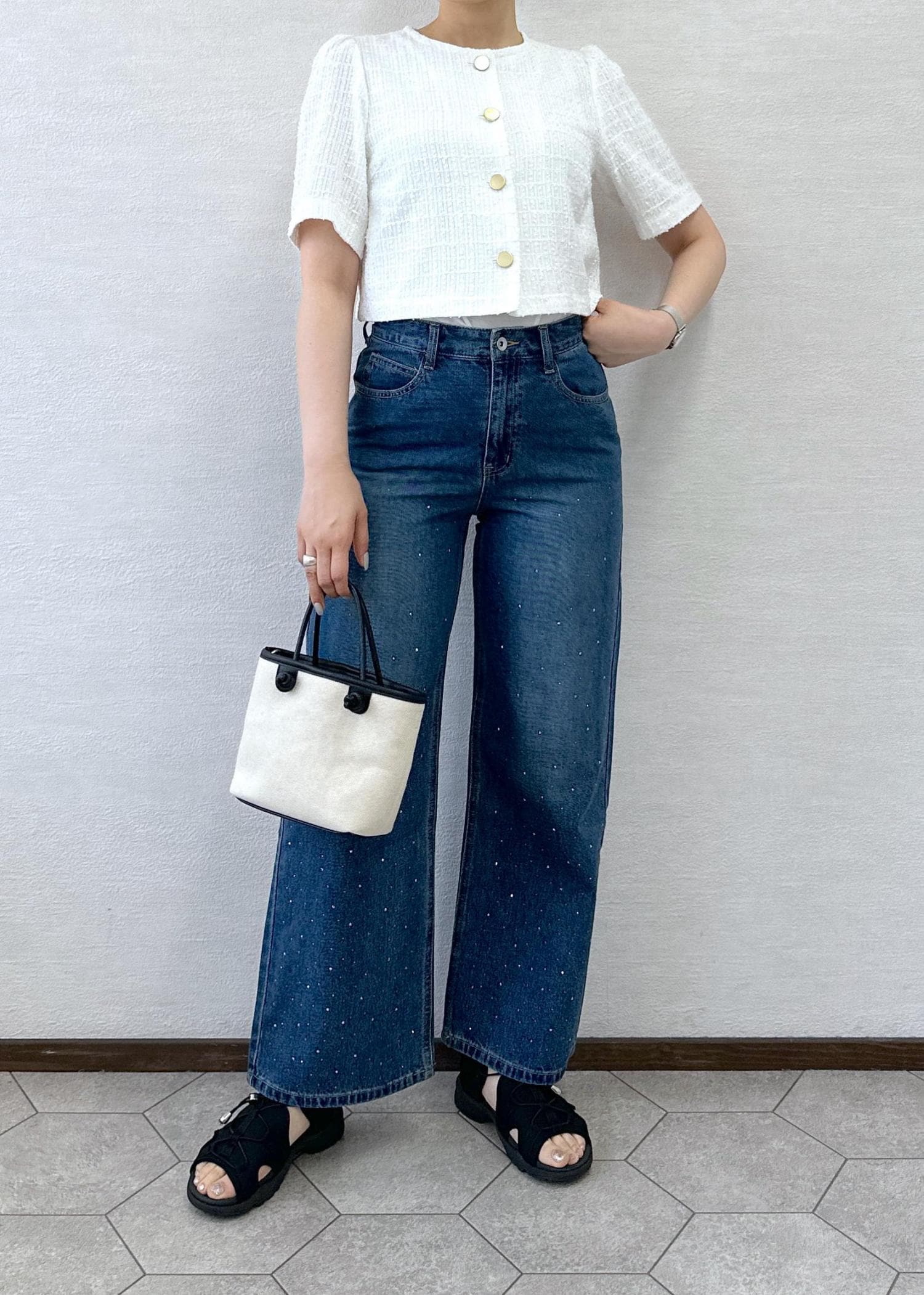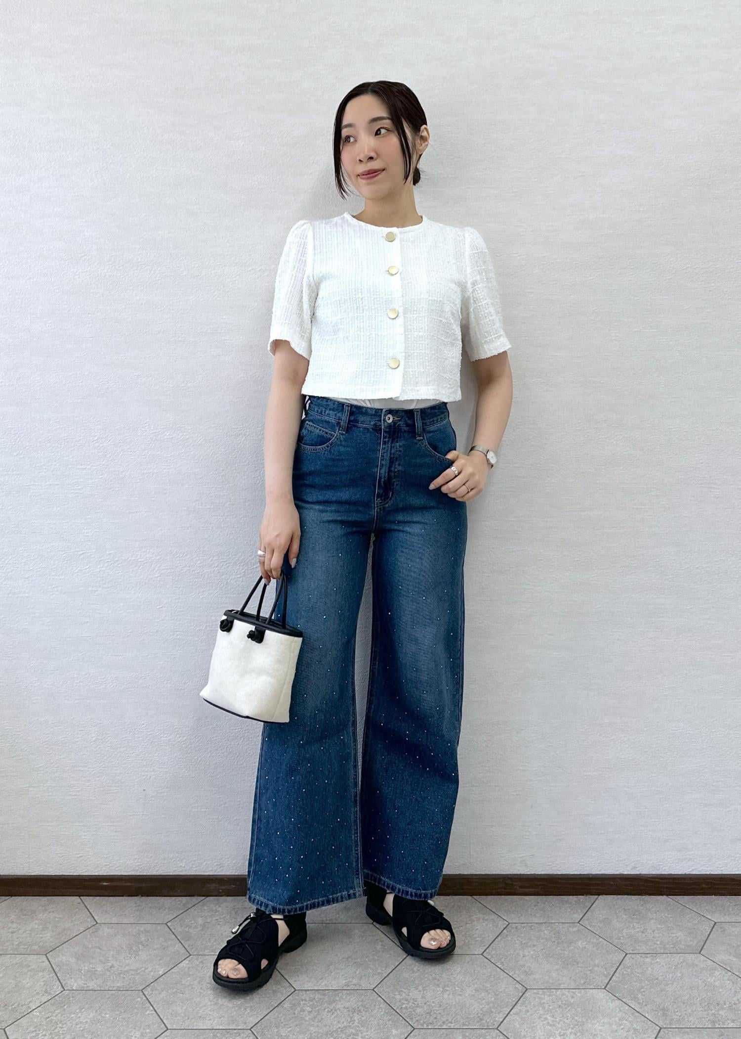大人気のカーディジャケットとビジュー付きのキラキラデニムを合わせたコーデ。