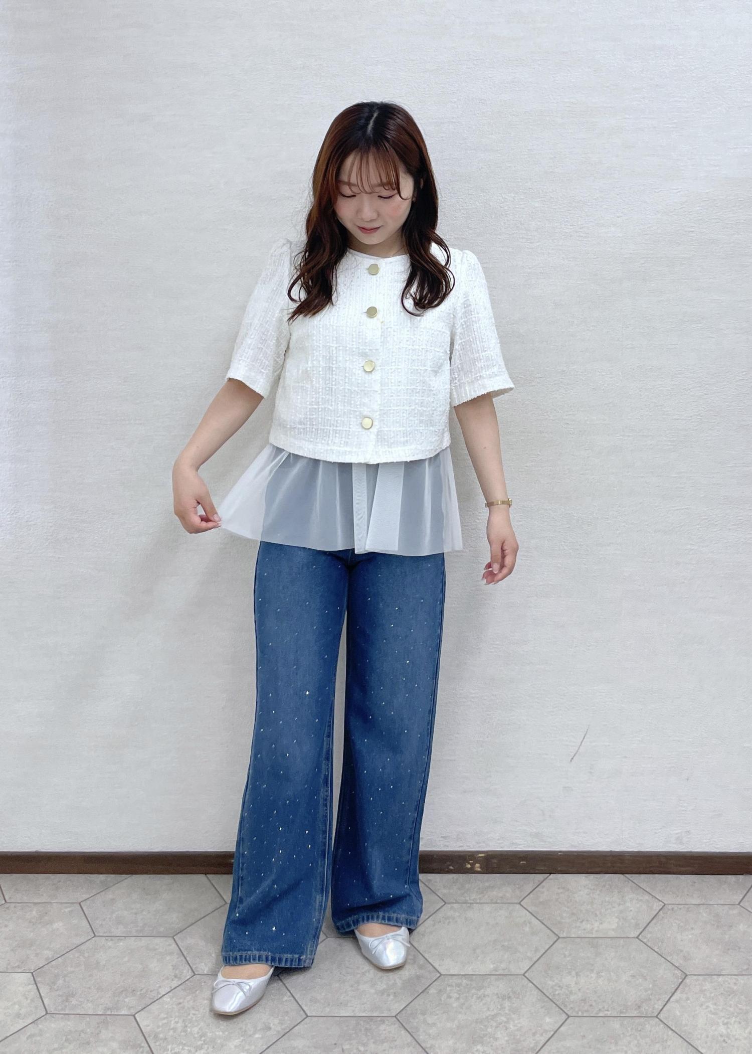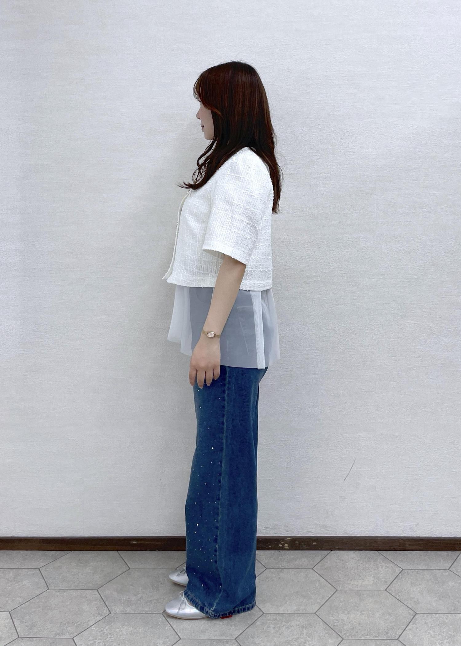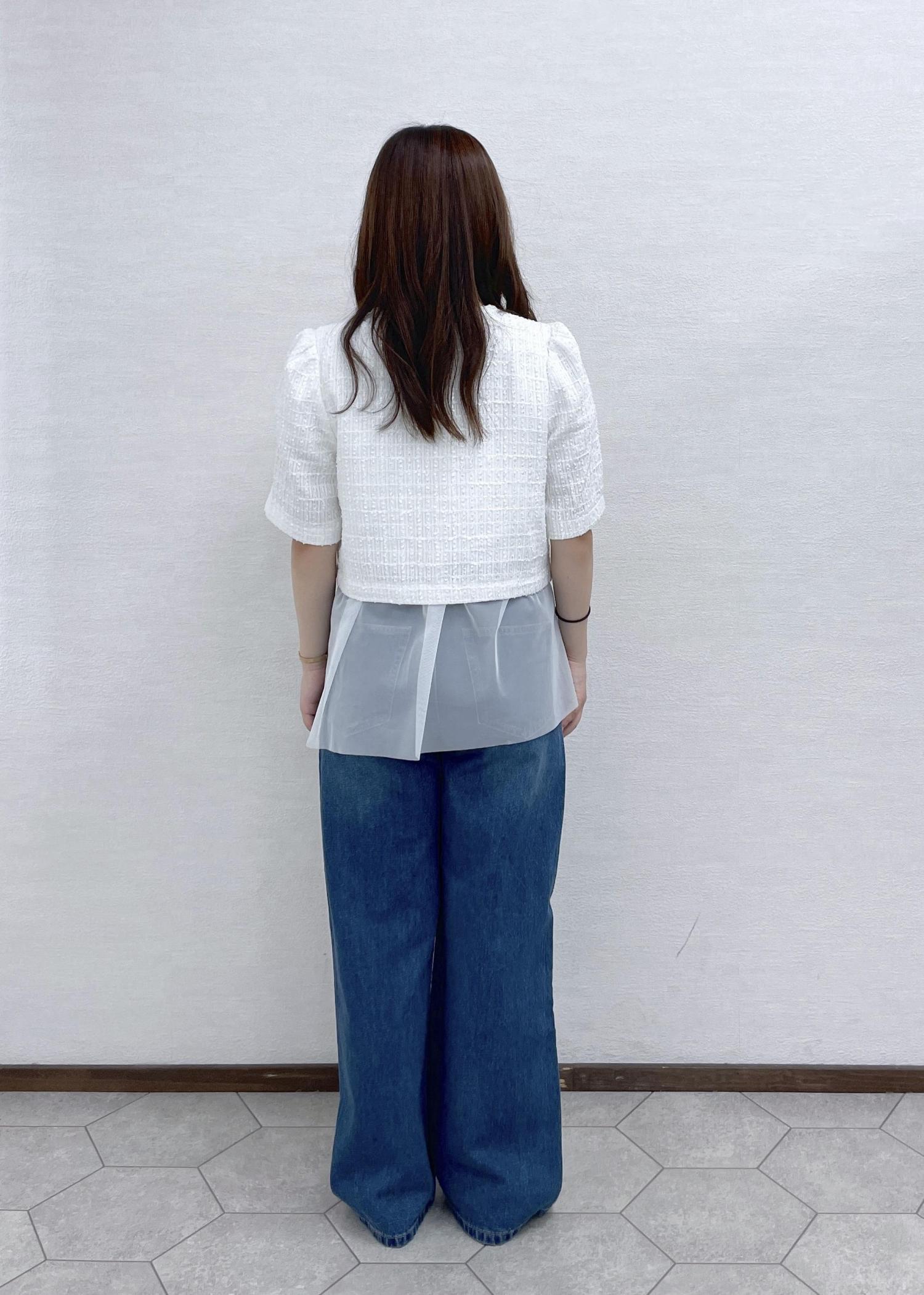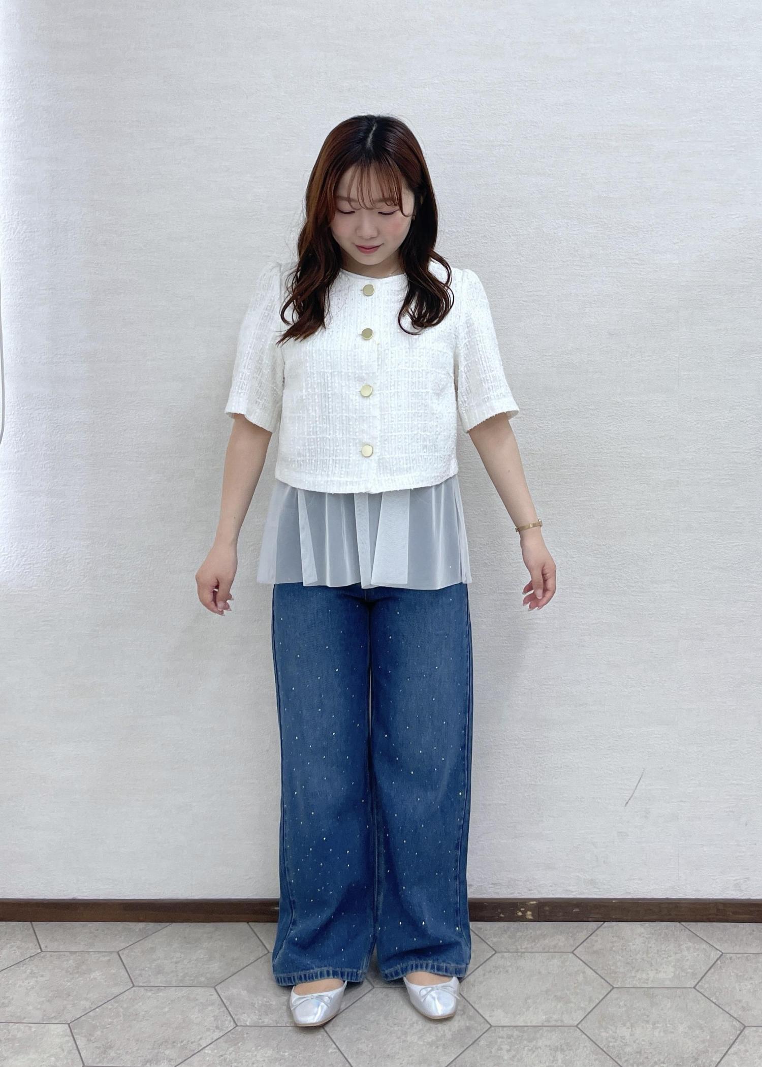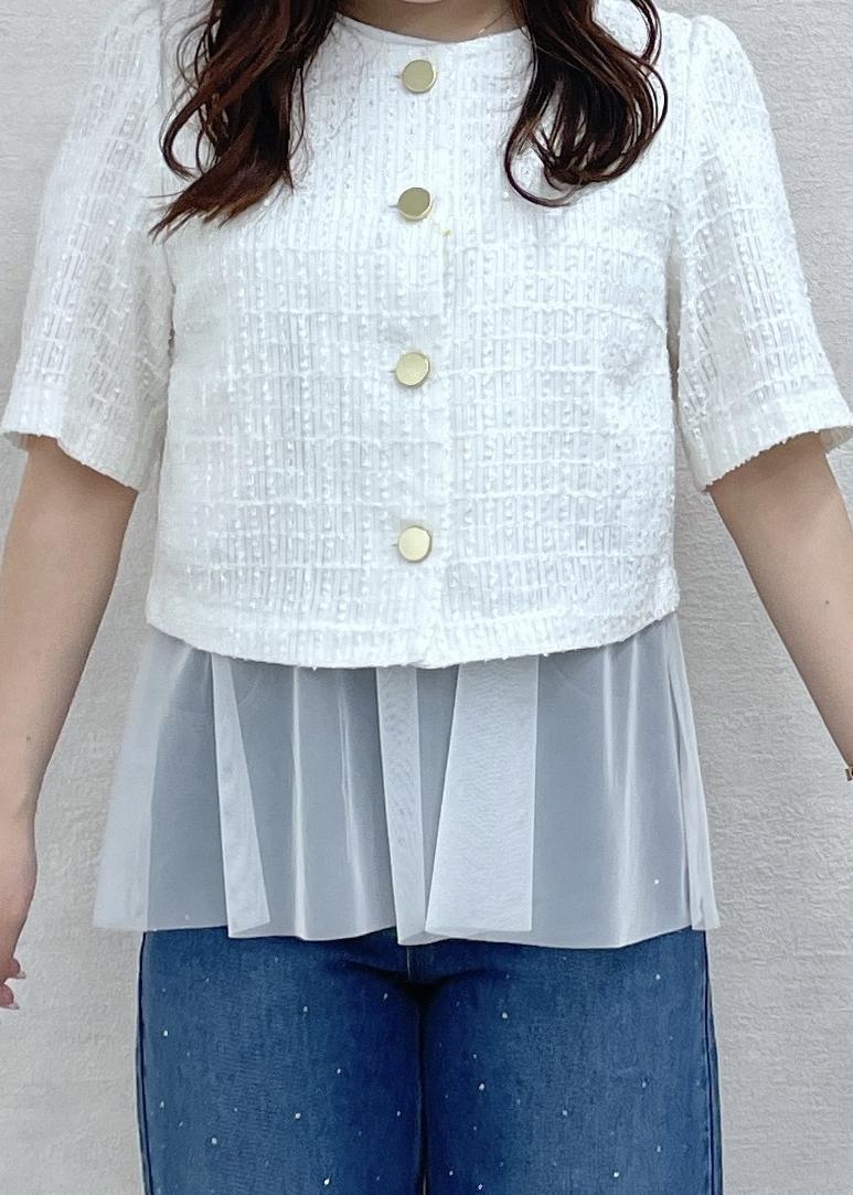 ツイードトップスにデニムを合わせてももちろん可愛いですが、下にチュールだけを出してアレンジを加えるとよりおしゃれに今っぽさが出ます◎自然とお腹周りもカバーされちゃいます♪